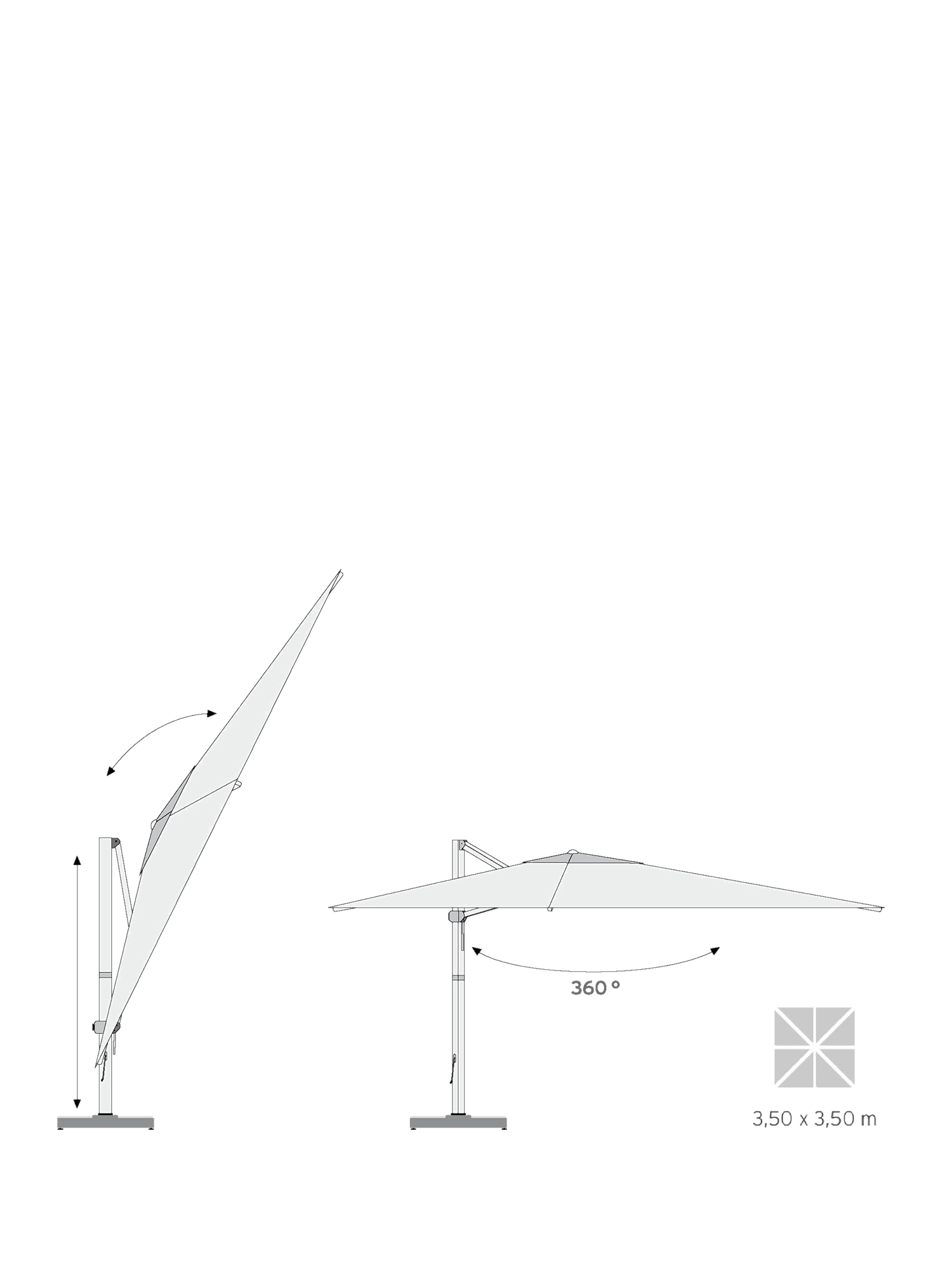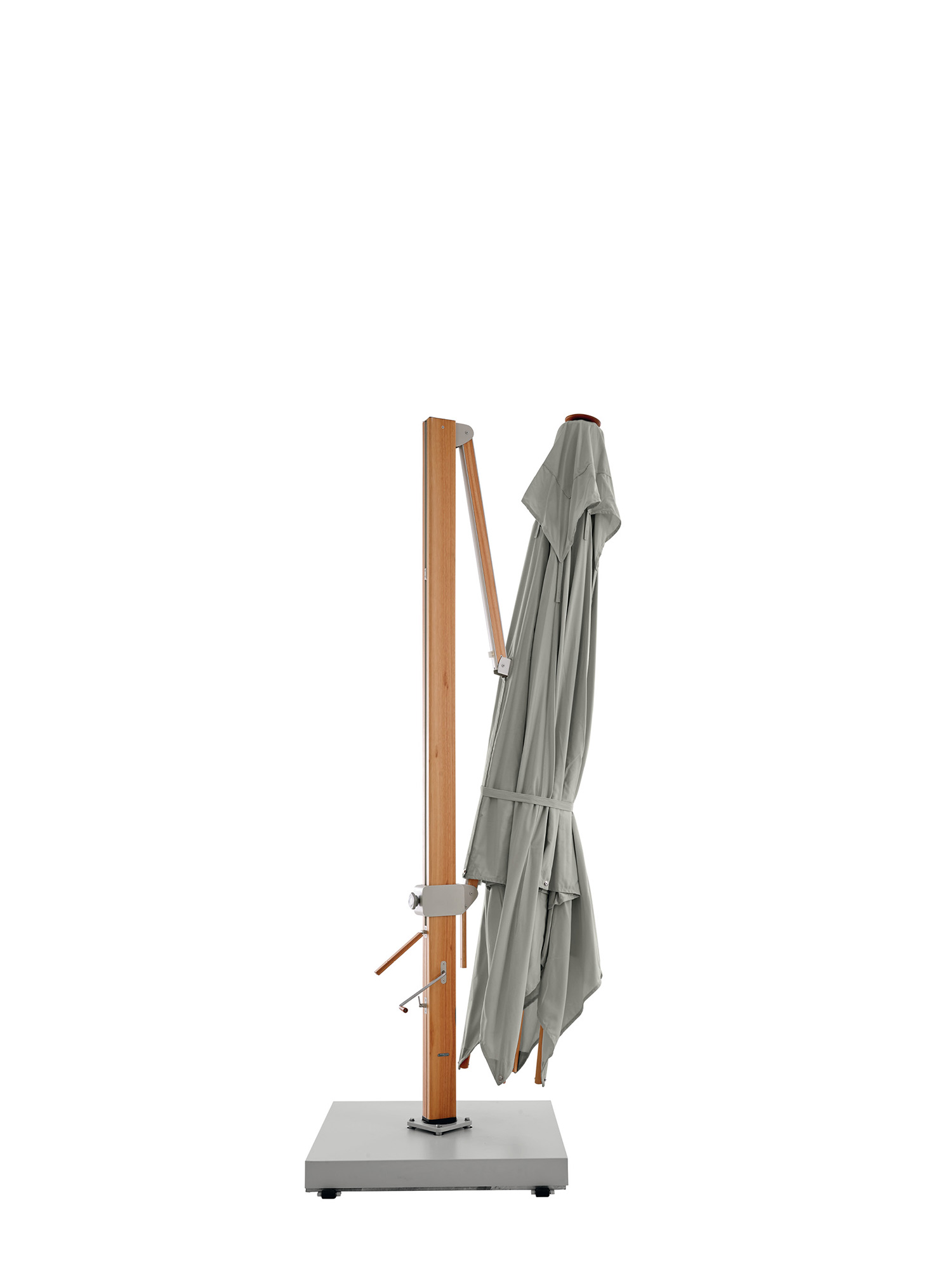 To stabilise the large parasol, the stand is weighted with solid plates that are concealed under the covering. To make a selection, please click on the ‘Accessories’ tab on this page.