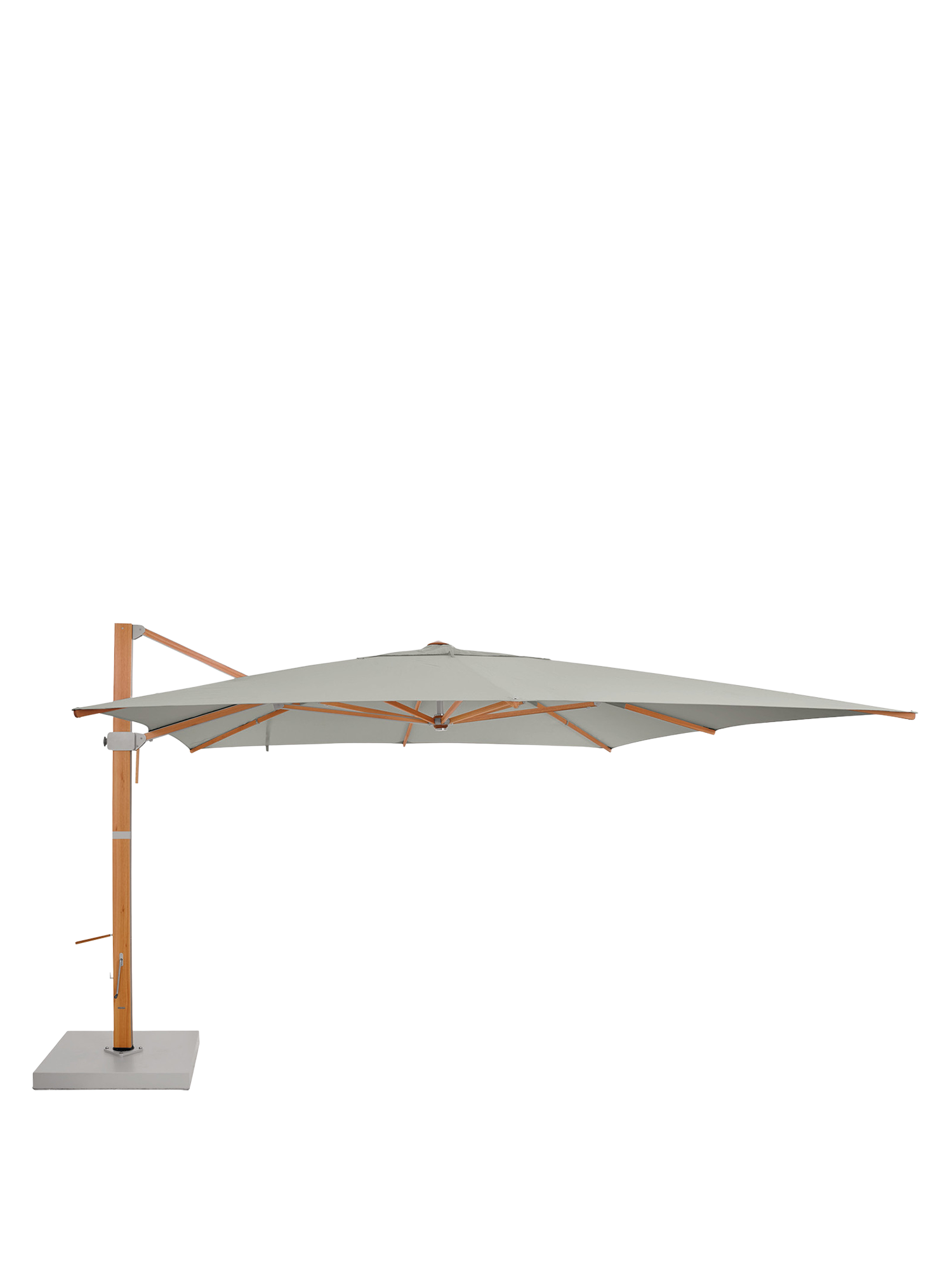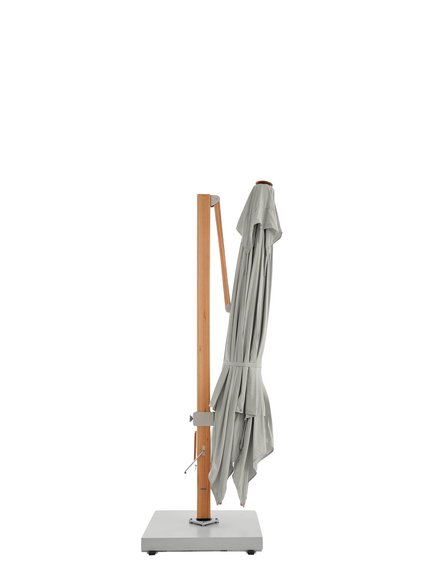 Its special feature: a pole made of high-quality, weatherproof plantation teak plays the supporting role. The swivel canopy with wind escape vent, is made of silvery grey or ivory-coloured impregnated polyacrylic. Stainless steel sets accents, details made of powder-coated aluminium perfectly complement the canopy colour.
