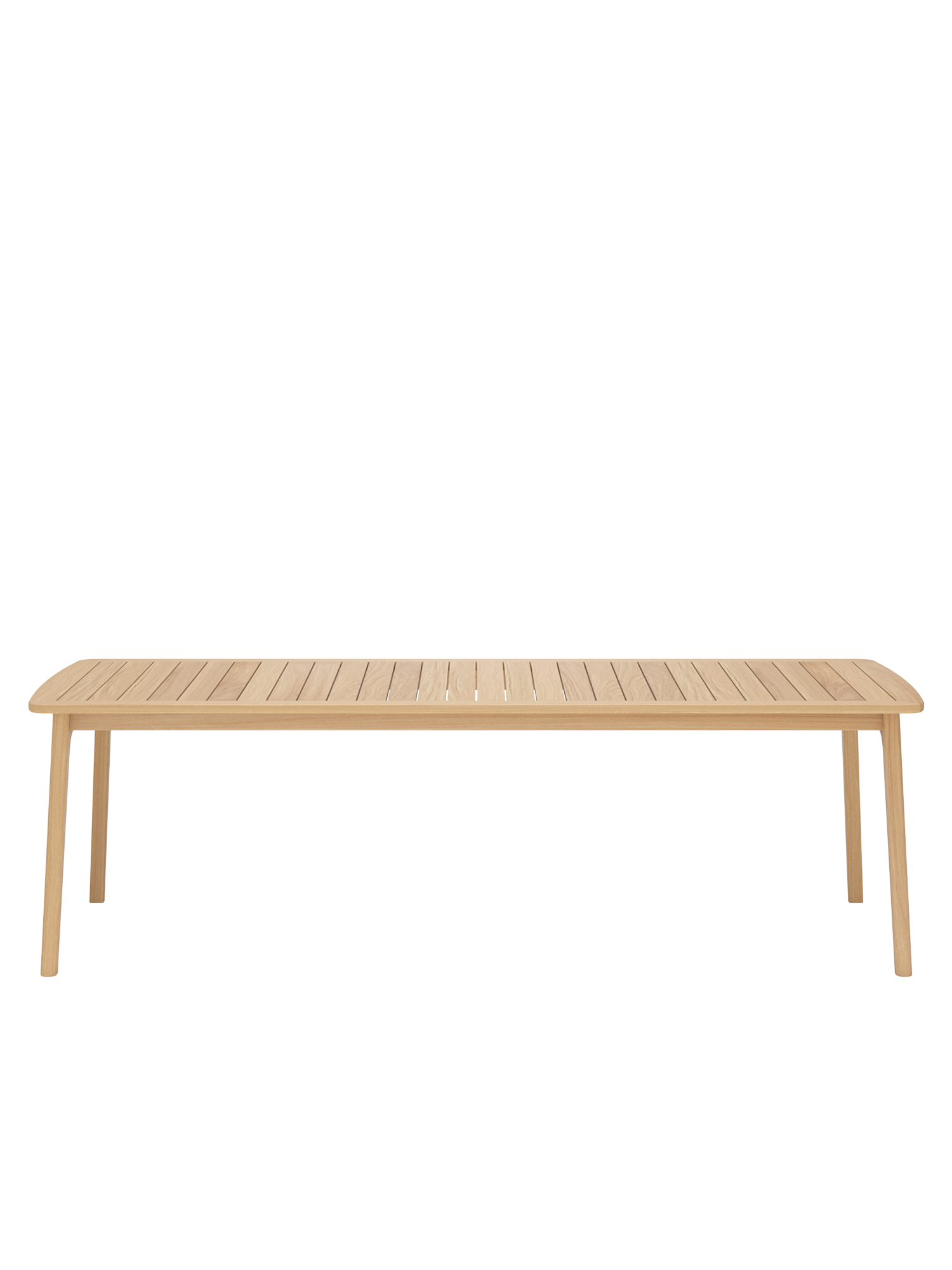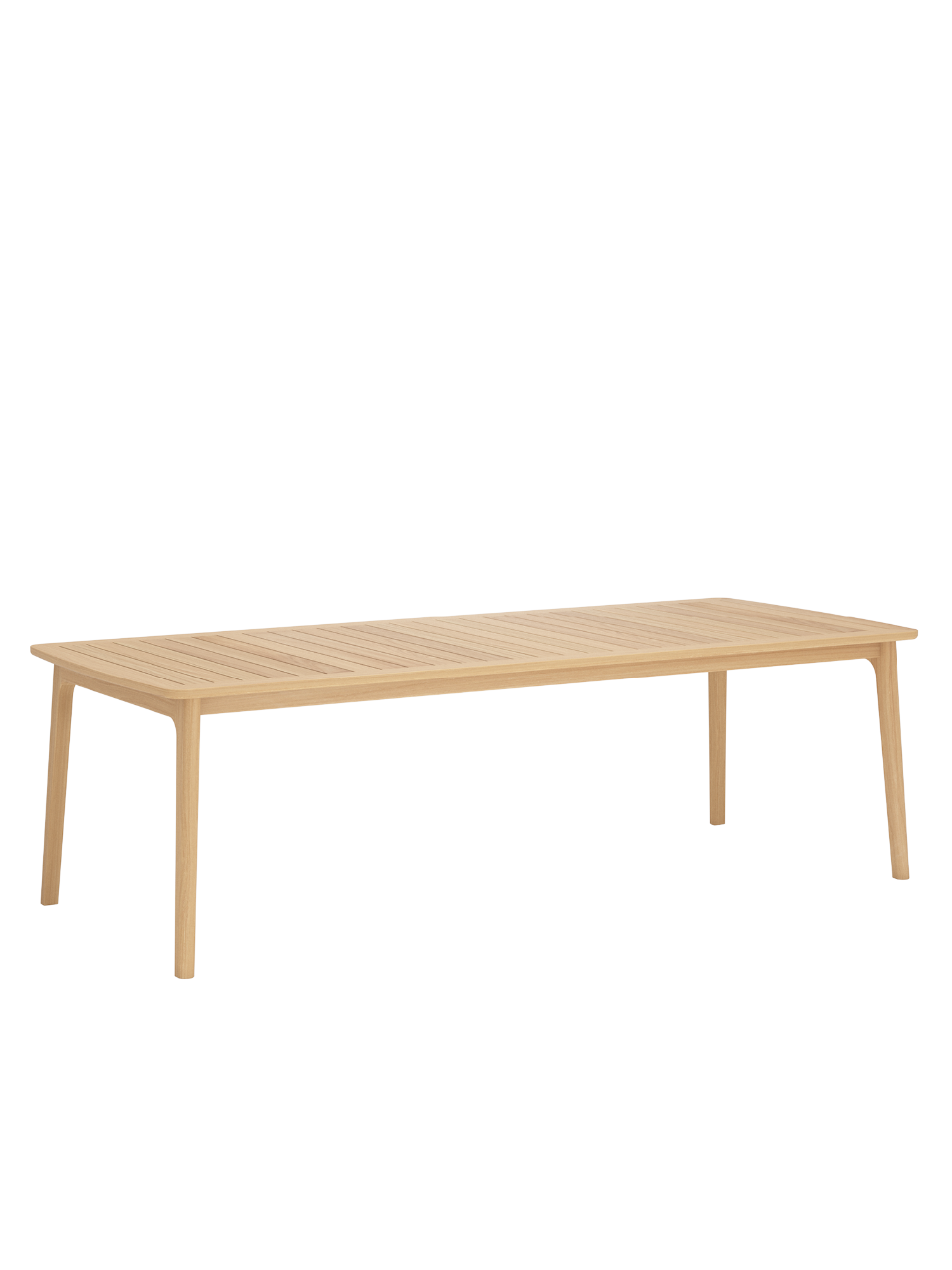 The clear design of the tables made of high-quality plantation teak is distinguished by transverse slats that are smoothly surrounded by teak wood frames. With elegantly rounded shapes and straight lines, they are a beautiful match for the dining furniture of our modern teak collections such as Luton – the armchairs of which can be comfortably slid under the table tops.