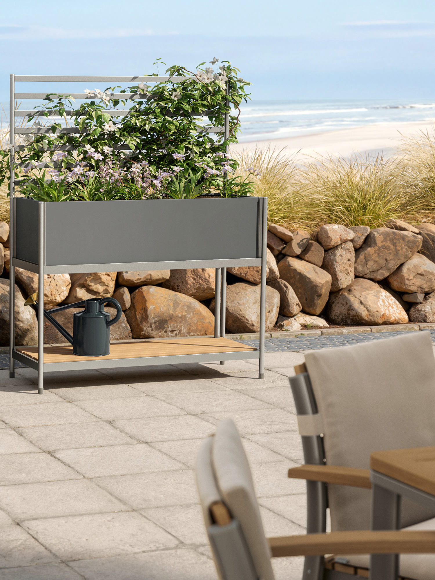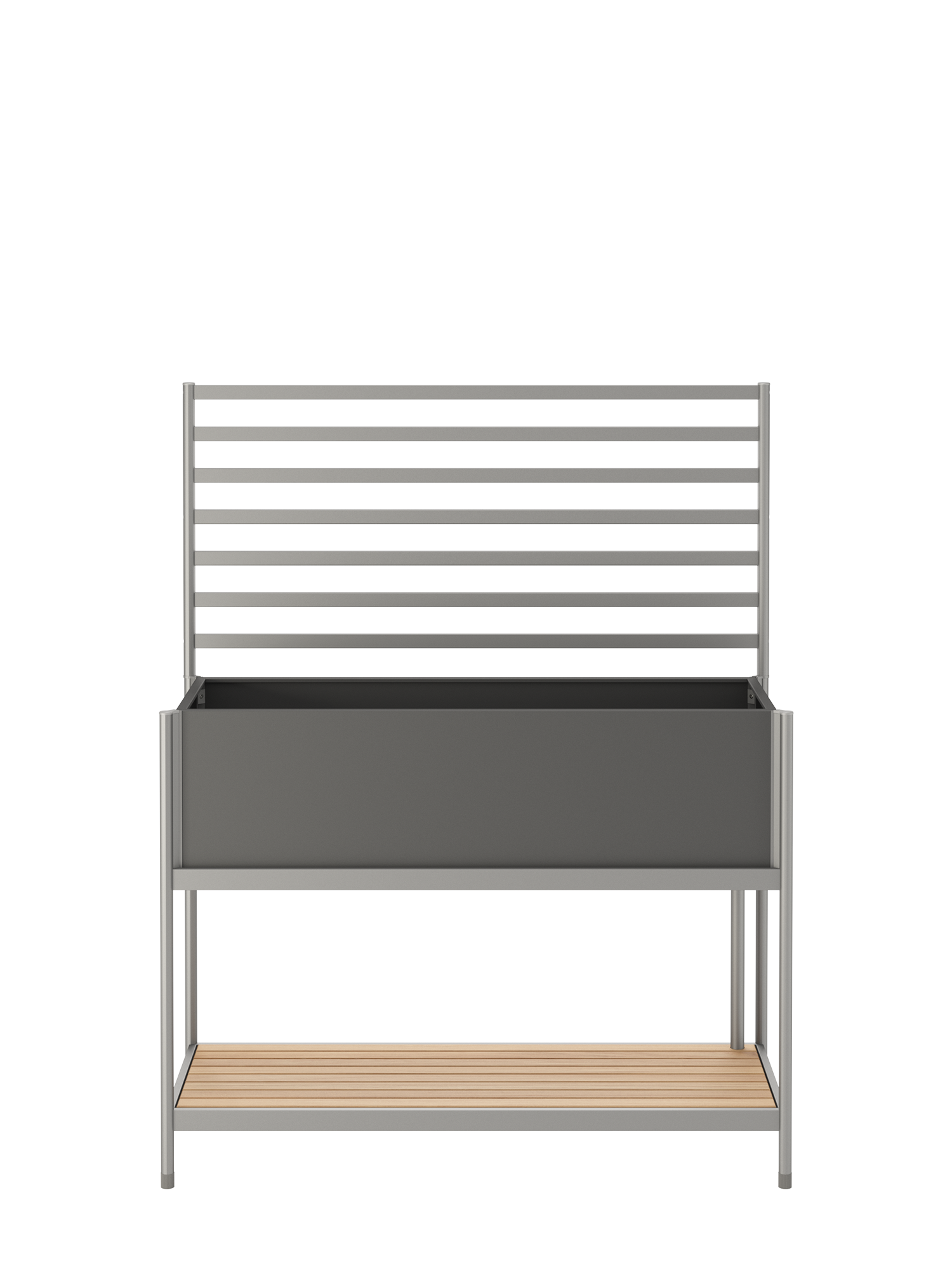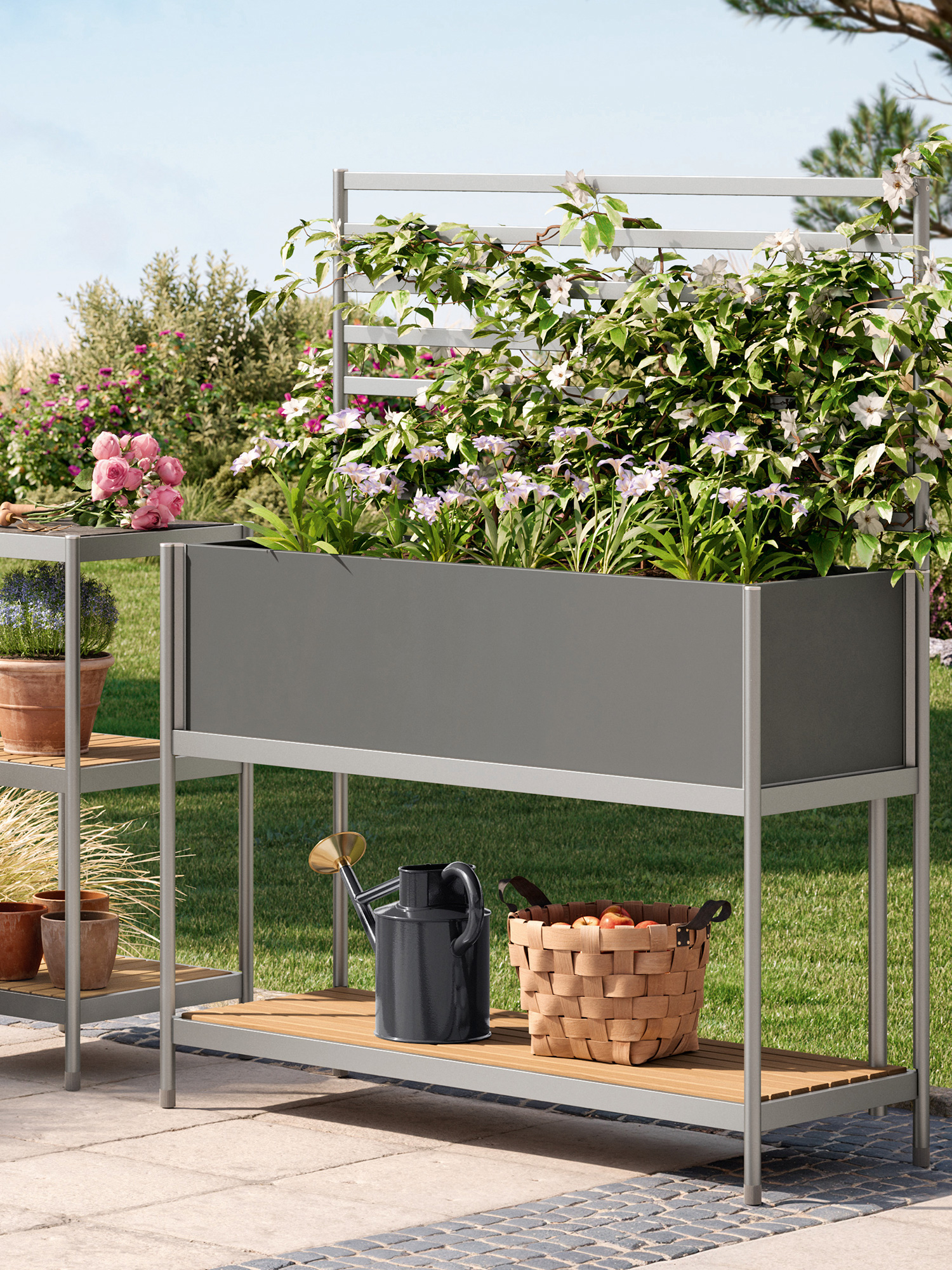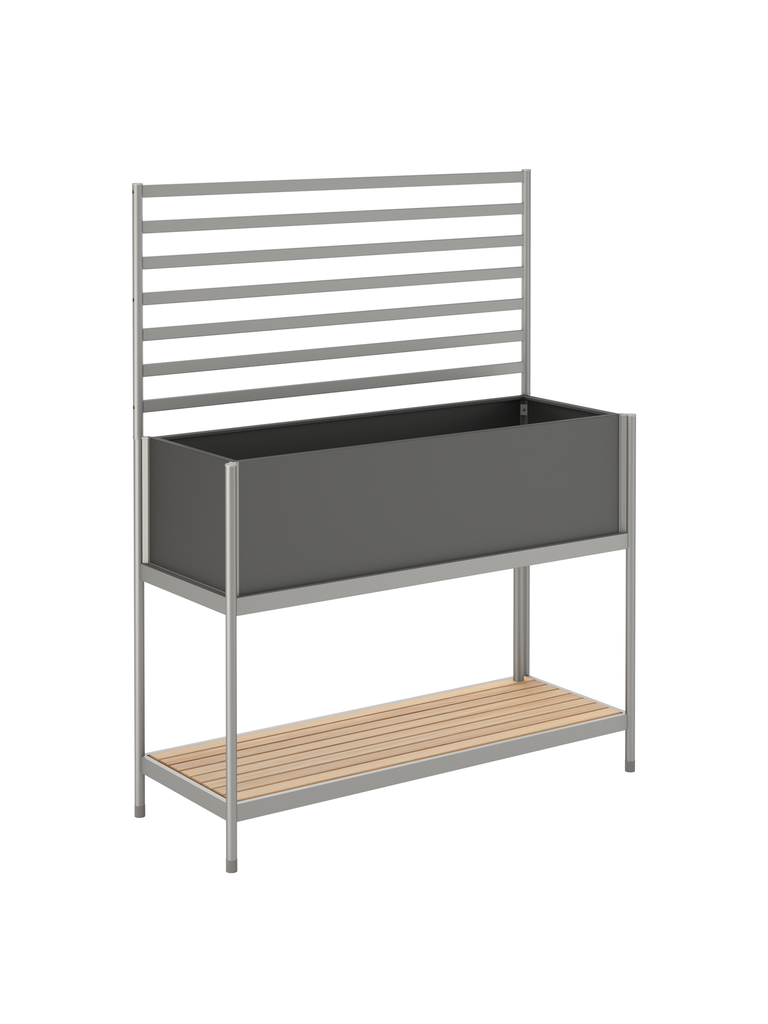 Fresh vegetables, herbs and lettuce thrive in the raised bed made of anodised aluminium – even on the terrace or balcony. A large planter made of powder-coated aluminium in the colour graphite, provides ideal growing conditions. An outlet, concealed in the frame, allows excess water to drain off. A practical teak shelf under the planter keeps garden tools and watering can within easy reach. Height adjusters on the legs level out any unevenness in the flooring. A trellis, which can be ordered separately, supports plants that grow higher and is also suitable as a filigree room-divider. It is easily inserted into the two rear uprights of the raised bed.