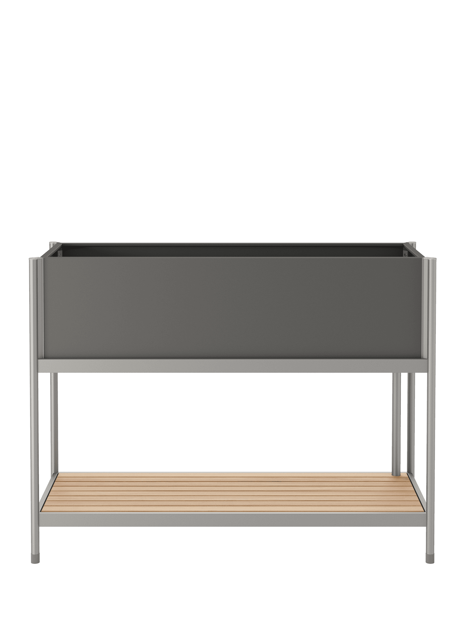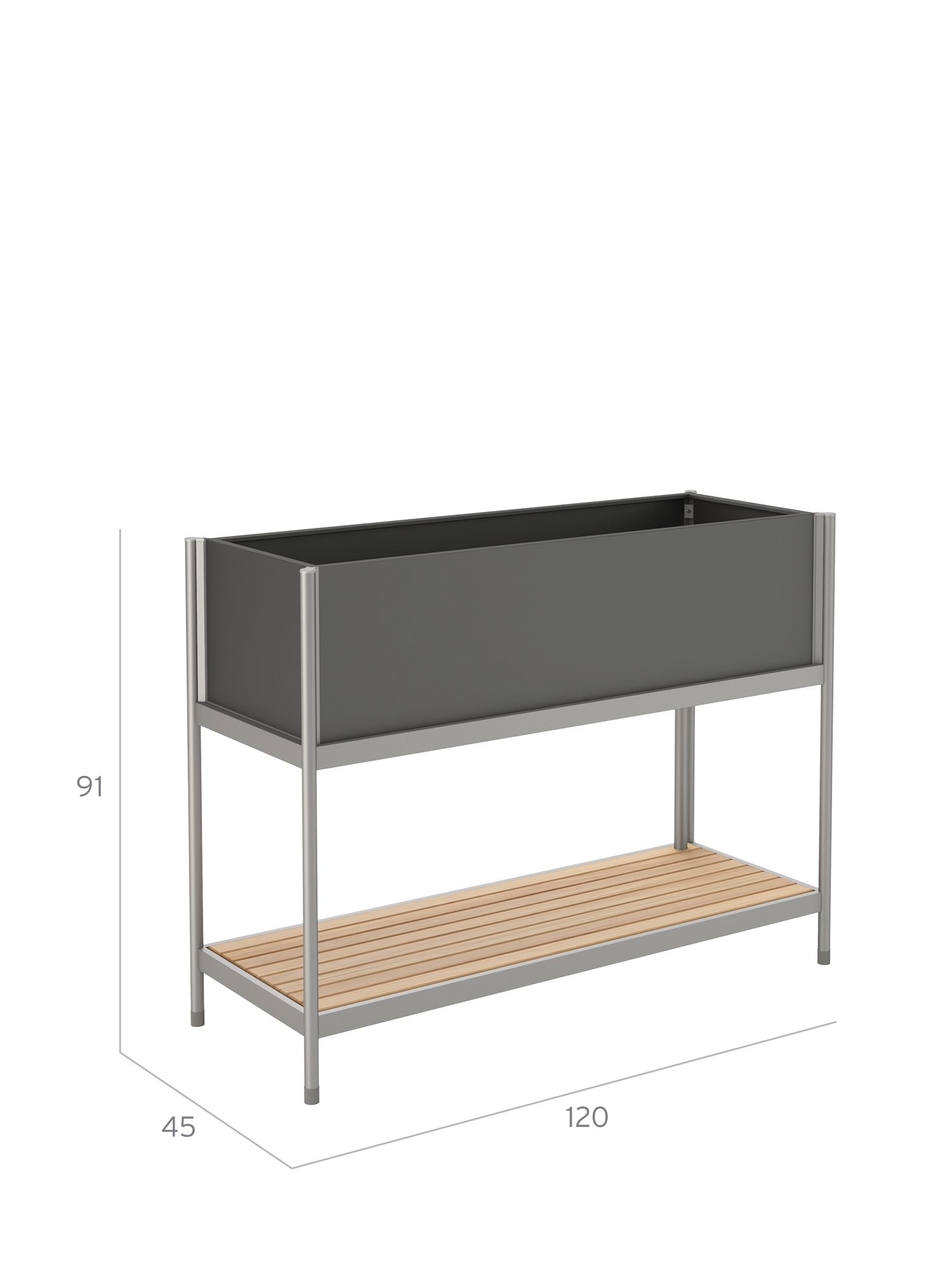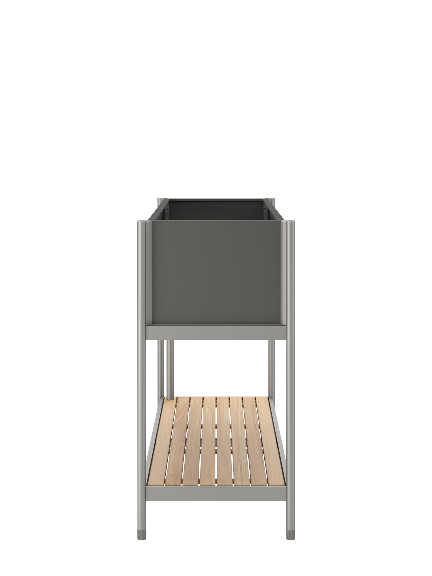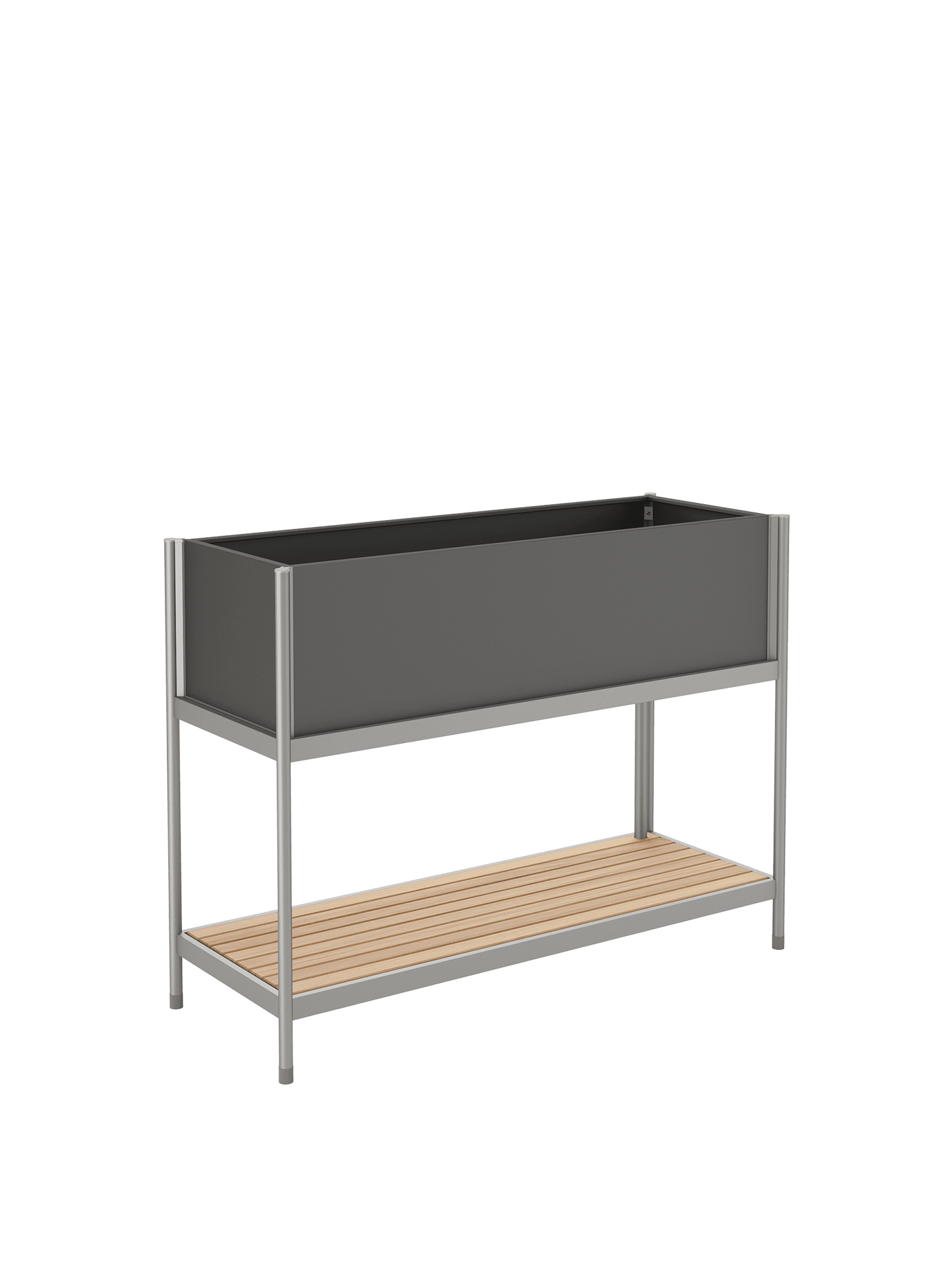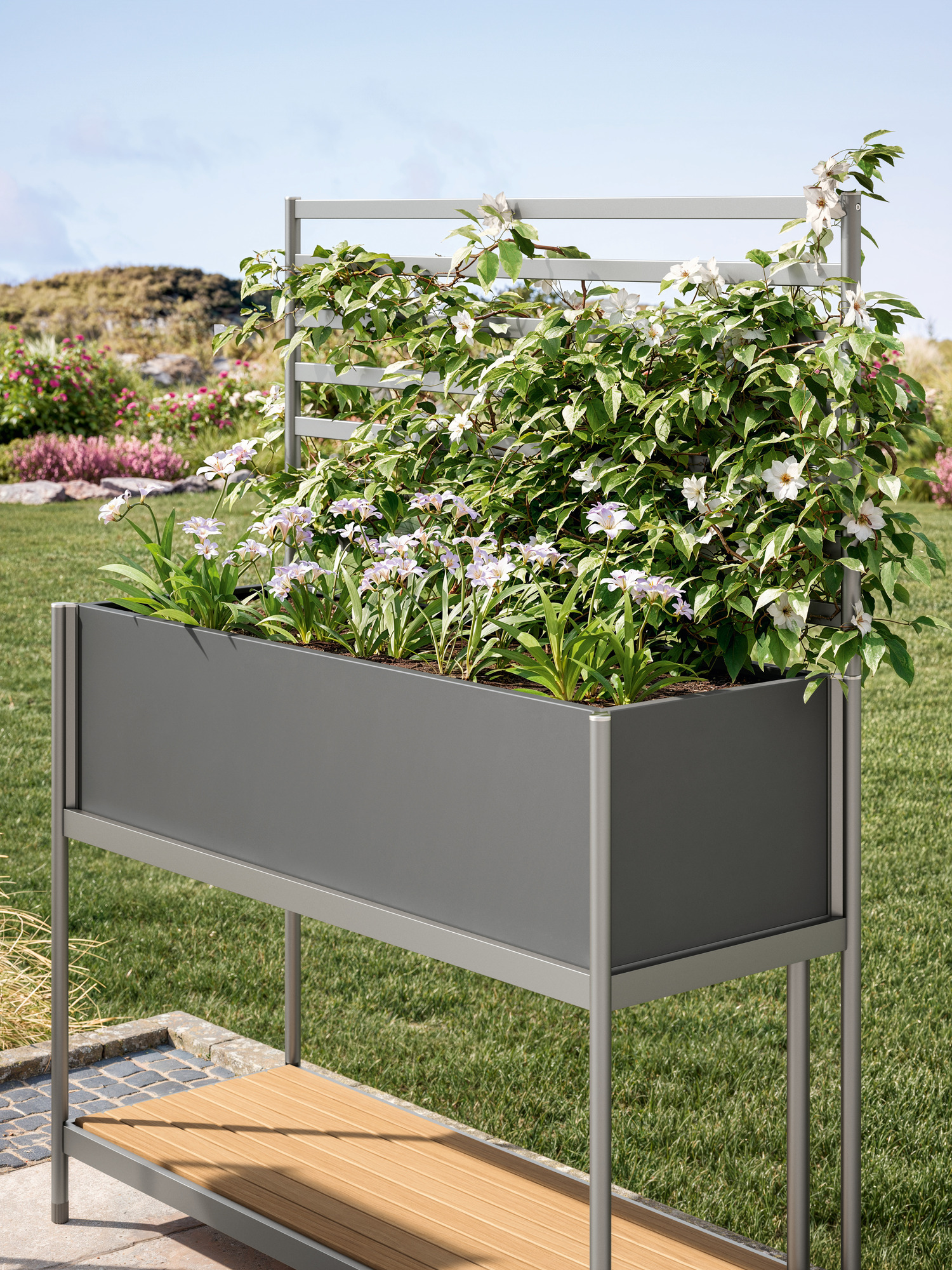 Fresh vegetables, herbs and lettuce thrive in the raised bed made of anodised aluminium – even on the terrace or balcony. A large planter made of powder-coated aluminium in the colour graphite, provides ideal growing conditions. An outlet, concealed in the frame, allows excess water to drain off. A practical teak shelf under the planter keeps garden tools and watering can within easy reach. Height adjusters on the legs level out any unevenness in the flooring. A trellis, which can be ordered separately, supports plants that grow higher and is also suitable as a filigree room-divider. It is easily inserted into the two rear uprights of the raised bed.