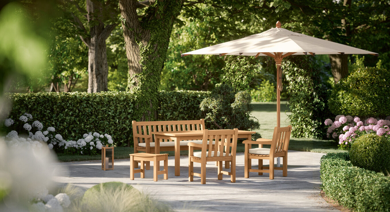 Garpa only uses high-quality teak from sustainable plantations. Teak is one of the most valuable commercial timbers in the world. Teak wood can easily withstand moisture, sunlight, frost, snow and temperature fluctuations. thanks to a core containing rubber. This makes it particularly suitable for long-term use outdoors without any additional surface protection. Our teak furniture is delivered in its natural state, according to the old English tradition, as the majority of customers wish to set up the furniture outdoors without having to do any painting. Over time, the wood acquires a silver-grey patina due to the effects of the weather. Teak is a natural product and therefore always has a different grain. The wood must be pre-dried in order to process it, sometimes giving teak an occasional reddish-brown hue. The UV rays in sunlight, however, make these discolourations disappear again in a few weeks. In year-round outdoor use, teak colourants may be washed out by rainwater and leave stains on other materials. Fine hairline cracks may appear on the surface; This is also a natural phenomenon which does not in any way affect the stability or durability of the furniture.