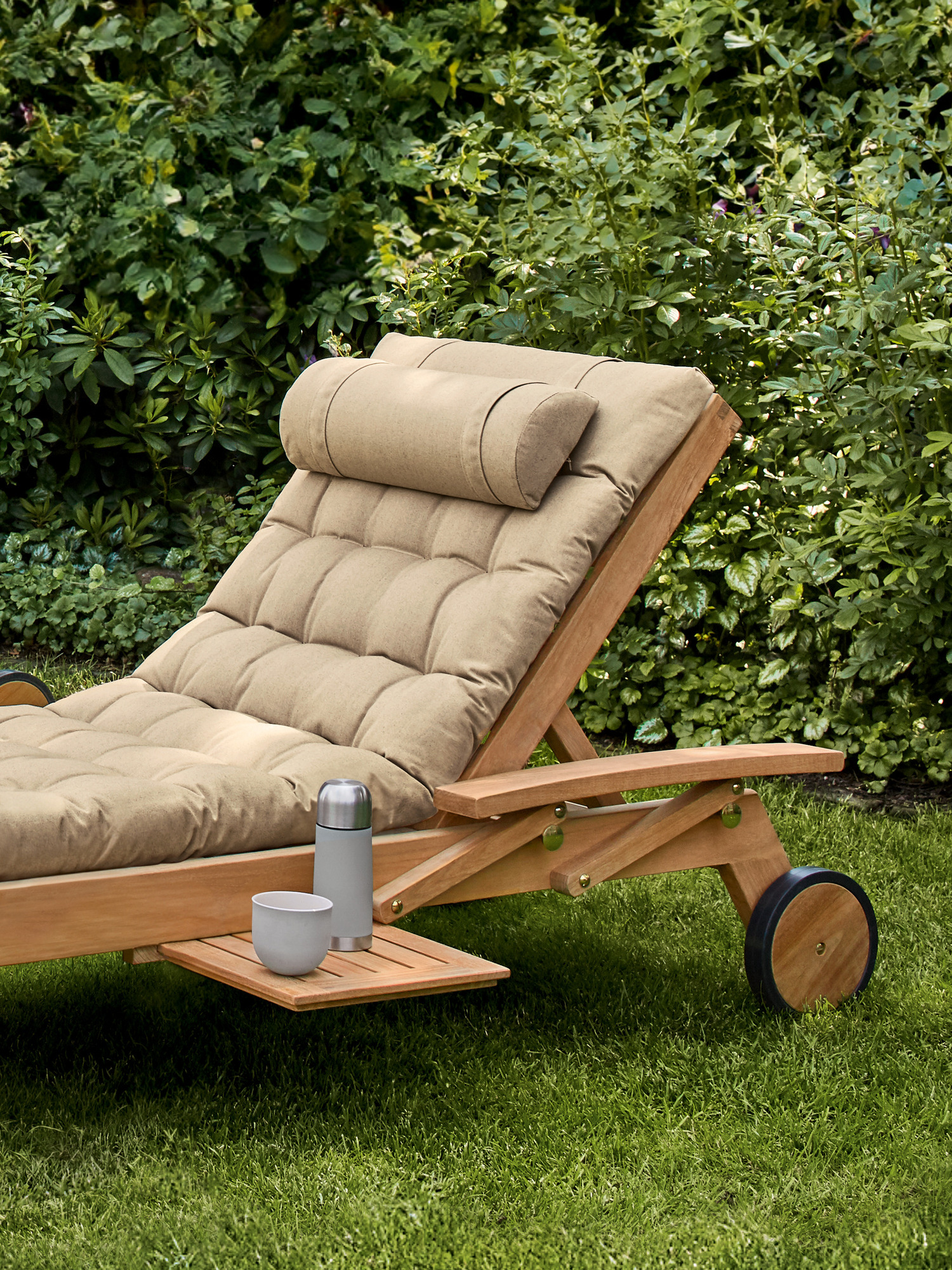 The optional tray can be mounted under the seat of the lounger and pulls out to both sides.