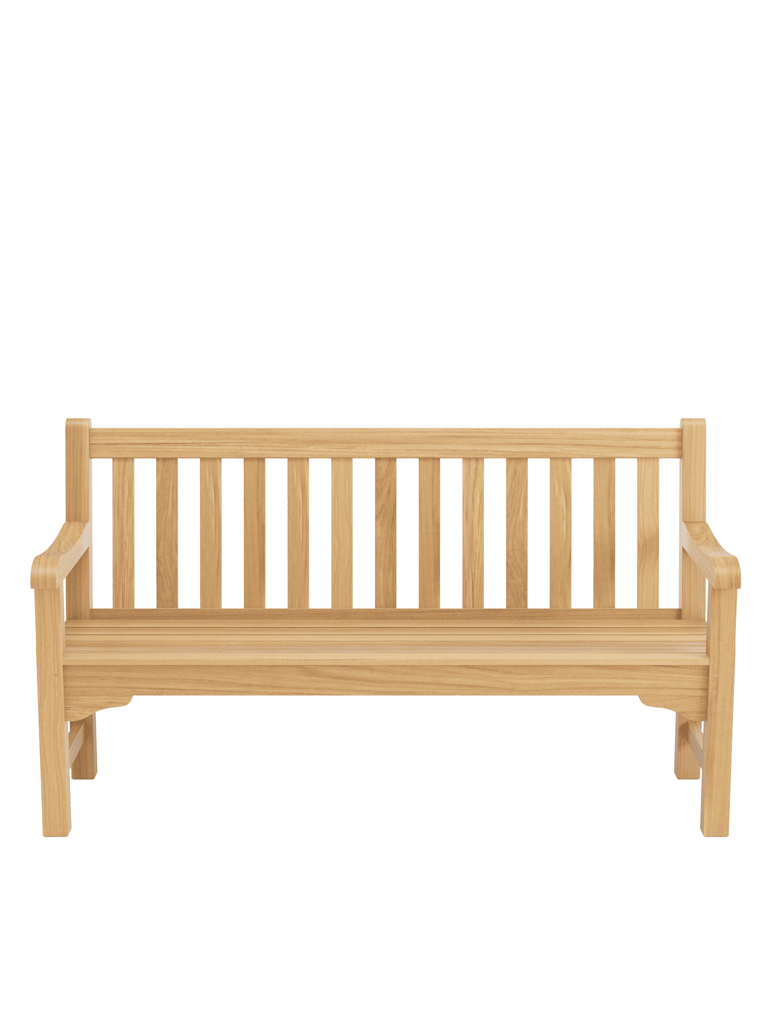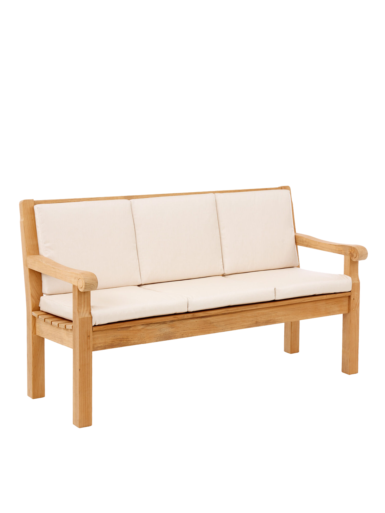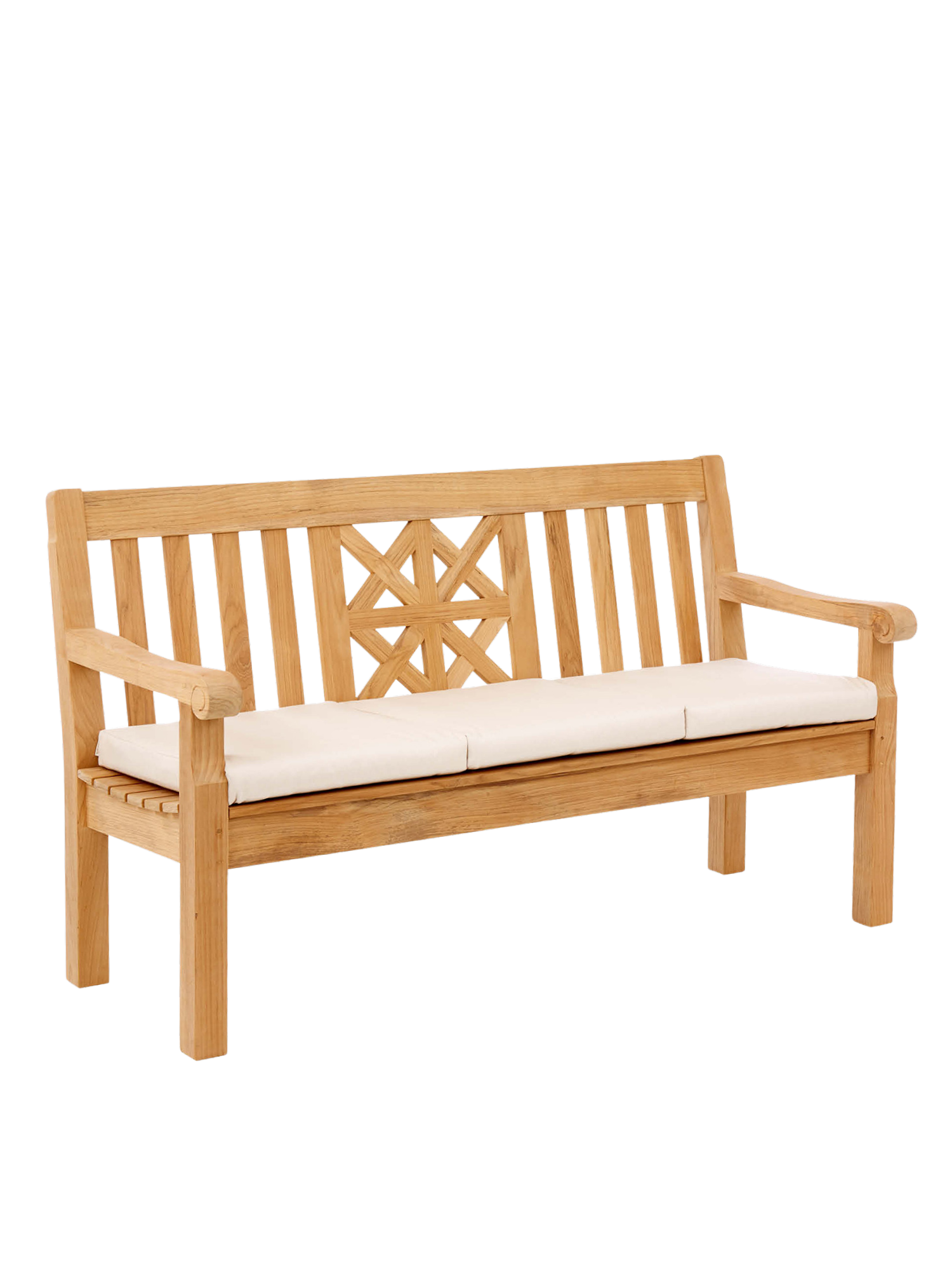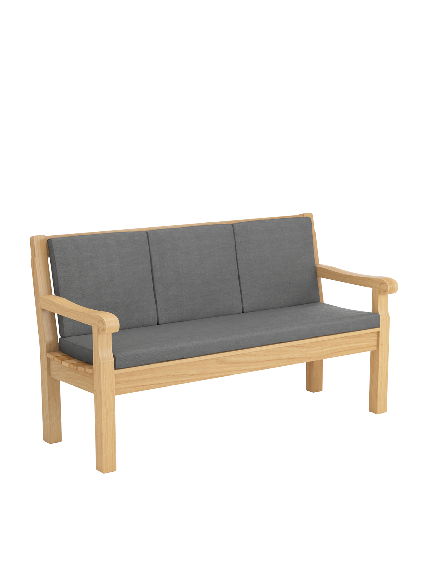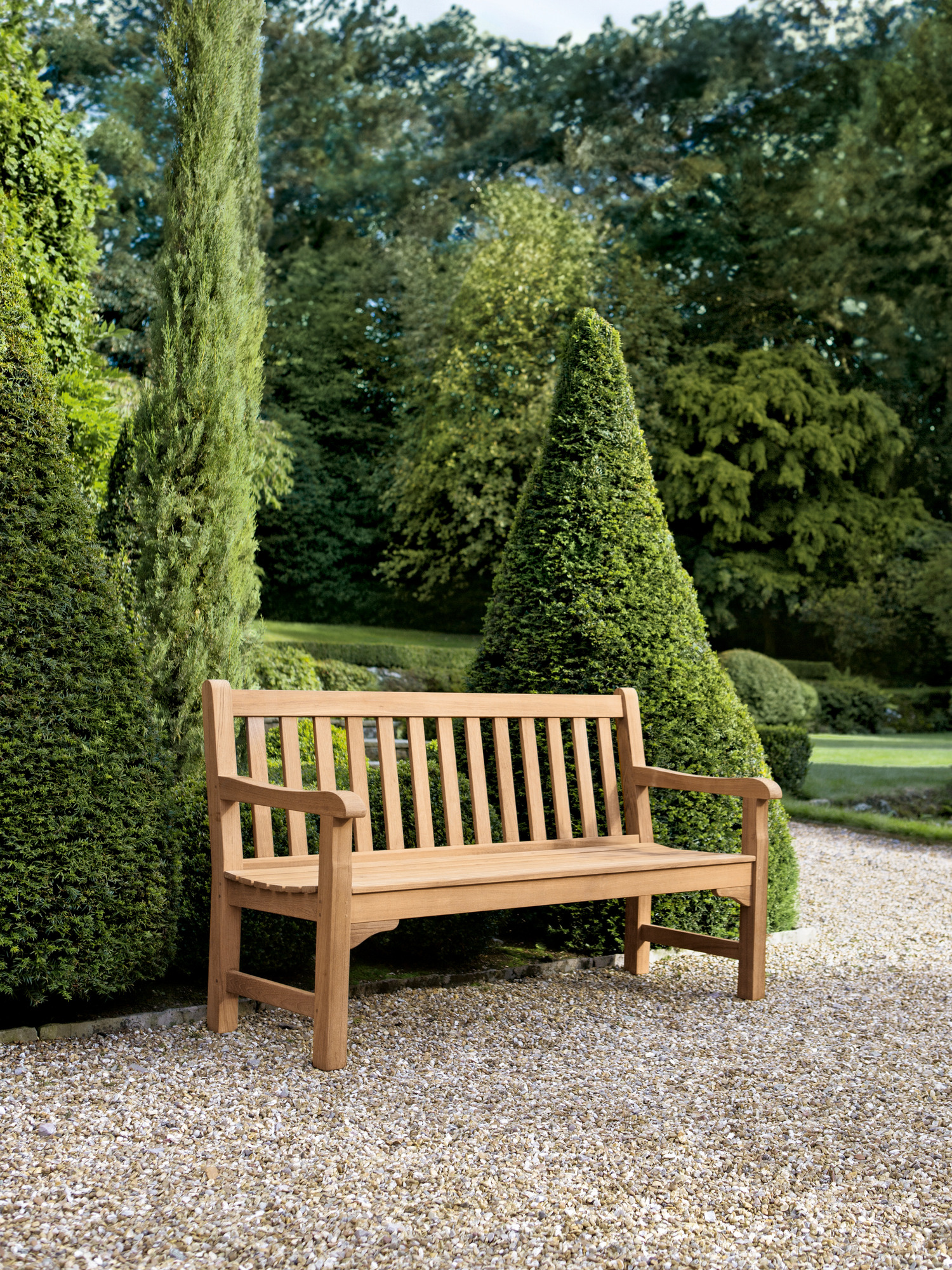 The generous seat of the teak bench is shaped to the body, the armrests are gently rounded and the slats and crosspiece of the backrest unite so smoothly that they look and feel as if they had been made from a single piece of wood.