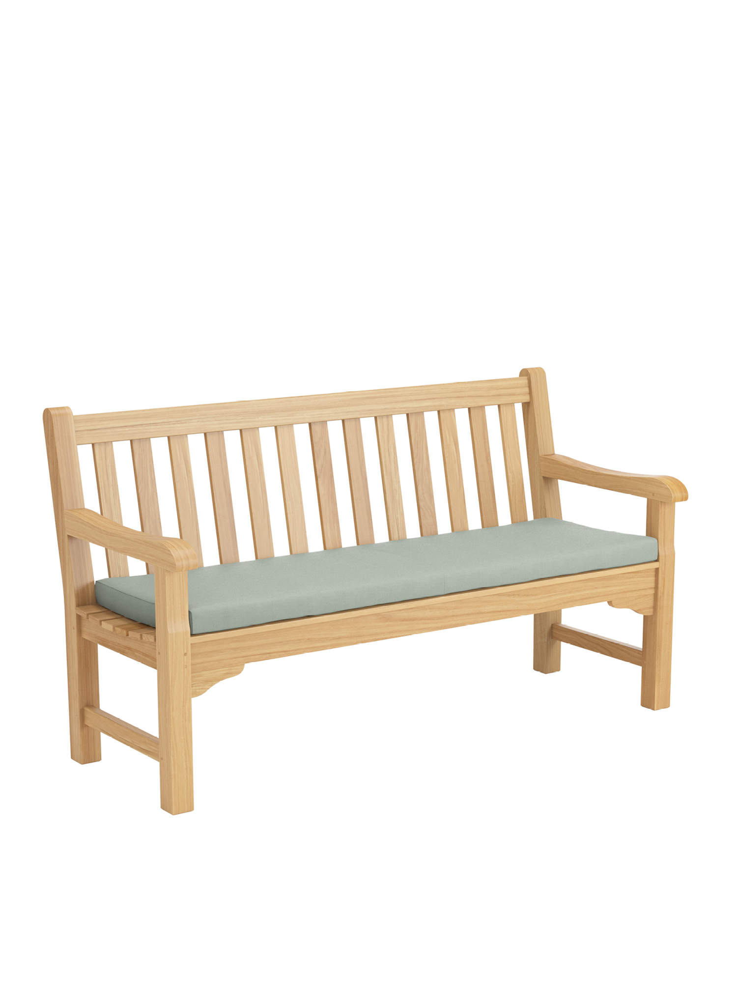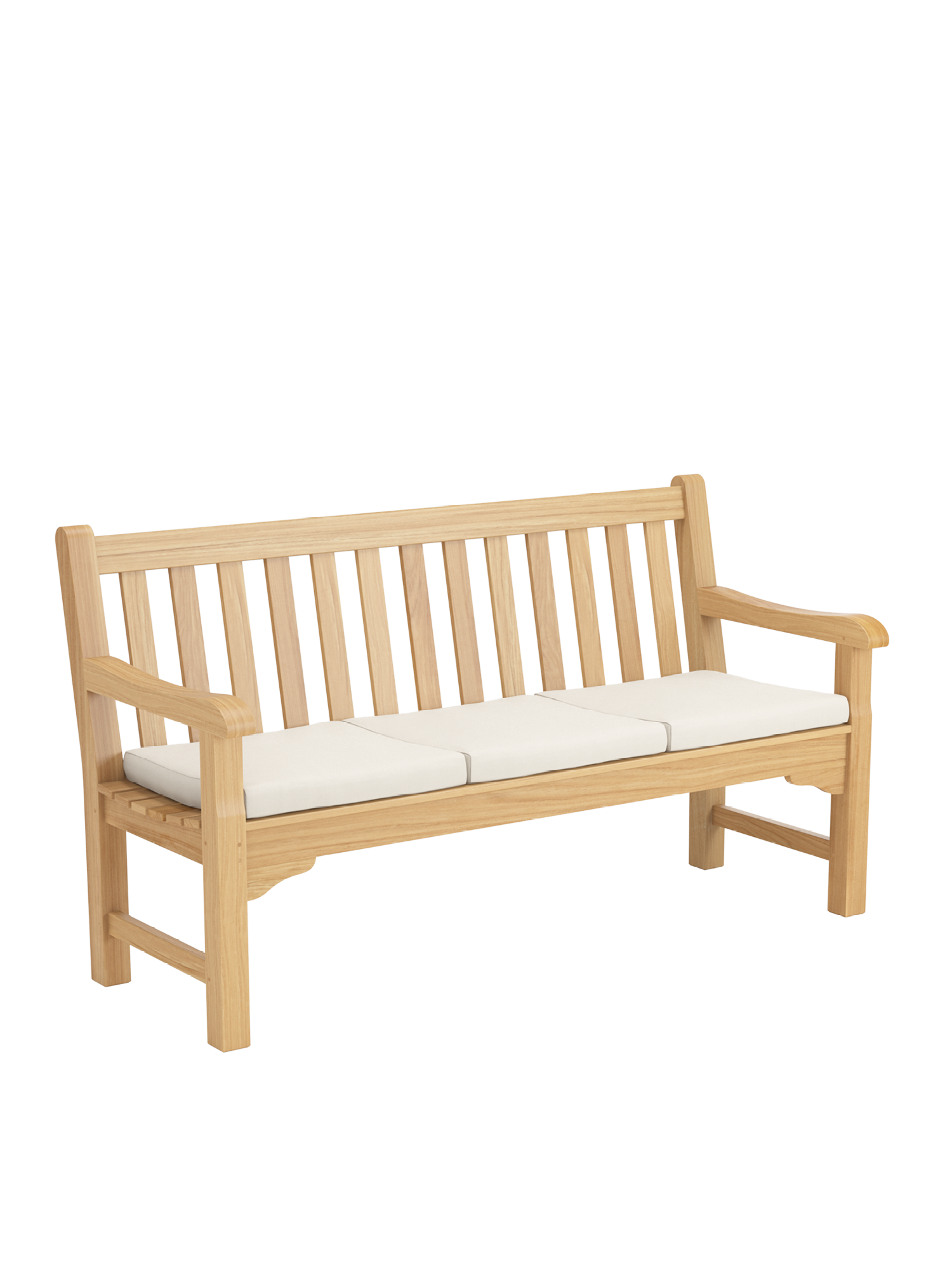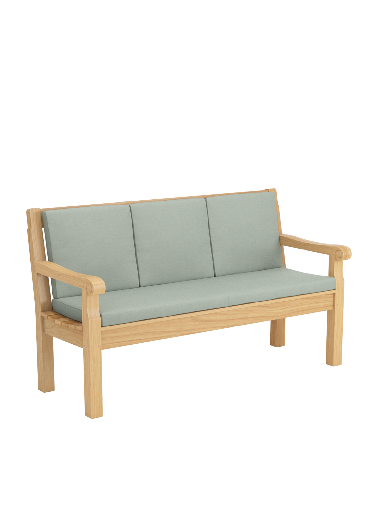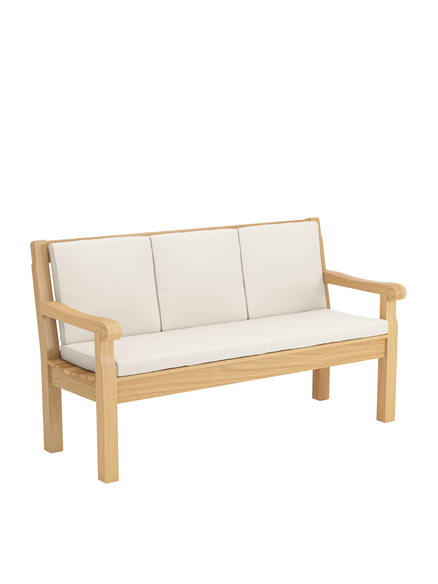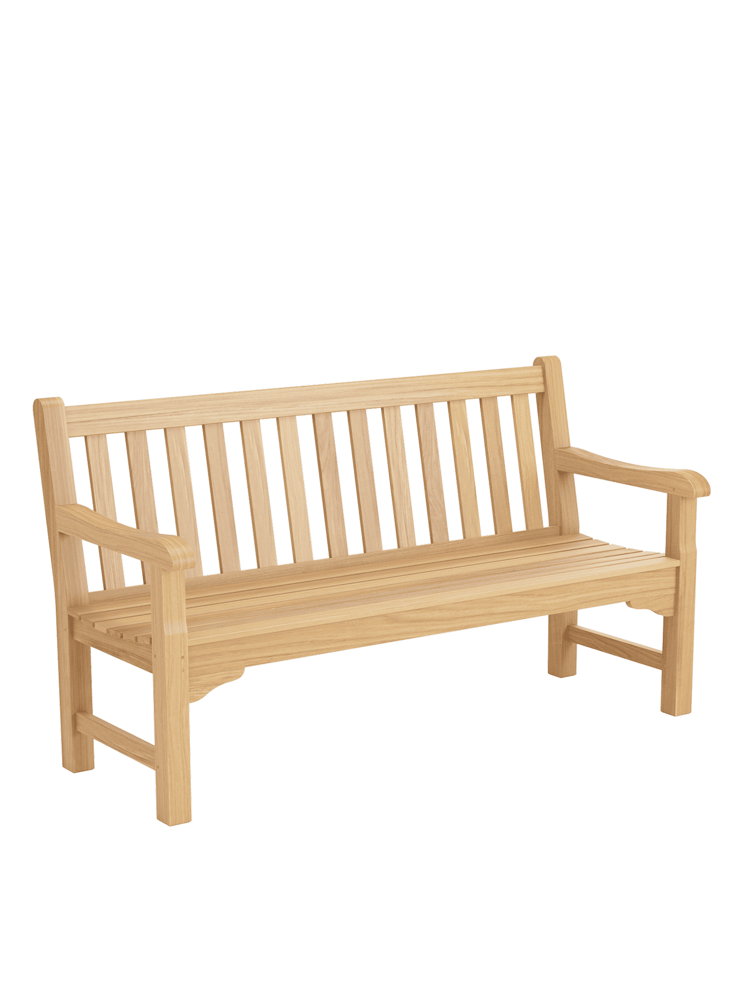 The generous seat of the teak bench is shaped to the body, the armrests are gently rounded and the slats and crosspiece of the backrest unite so smoothly that they look and feel as if they had been made from a single piece of wood.