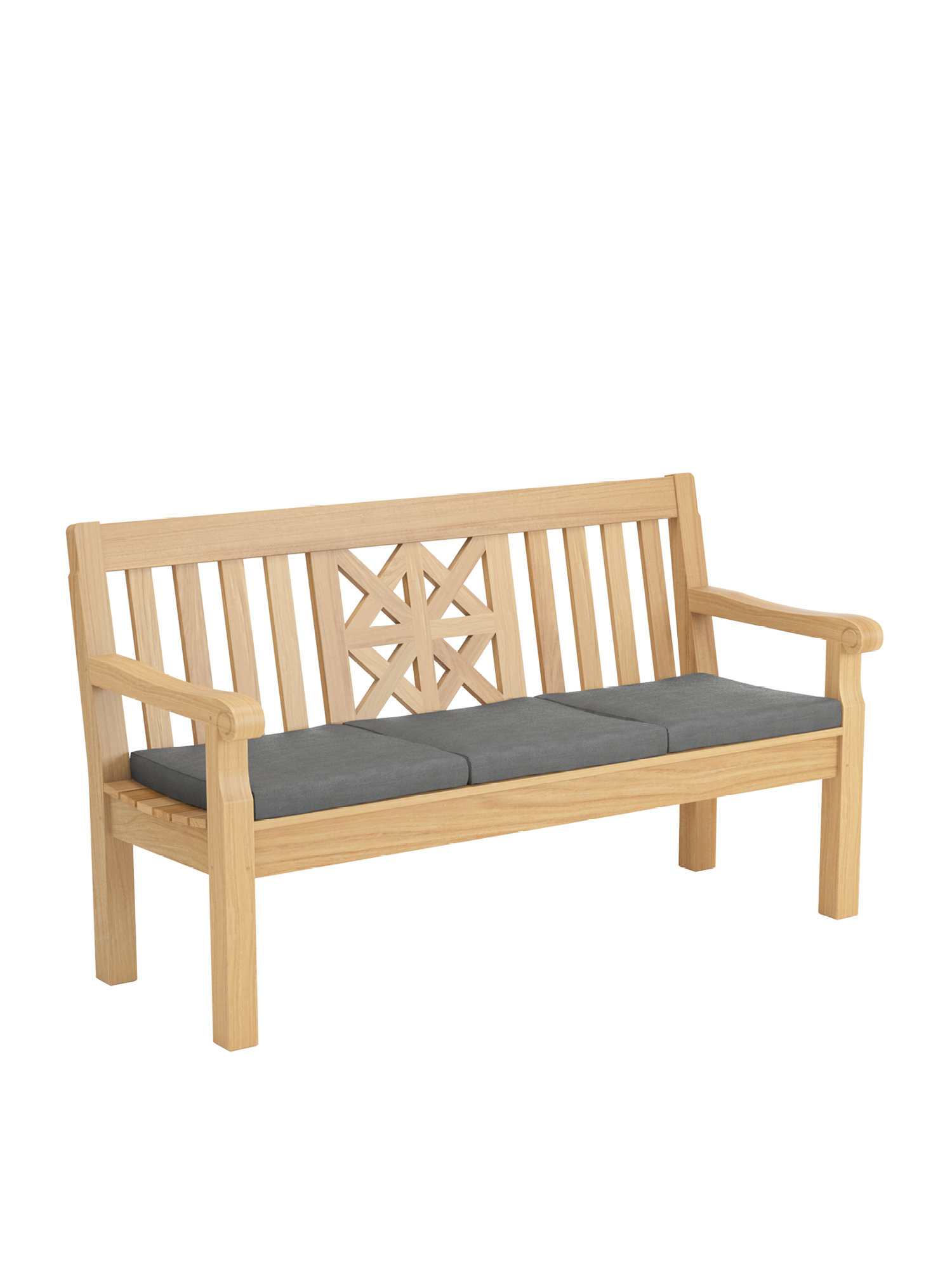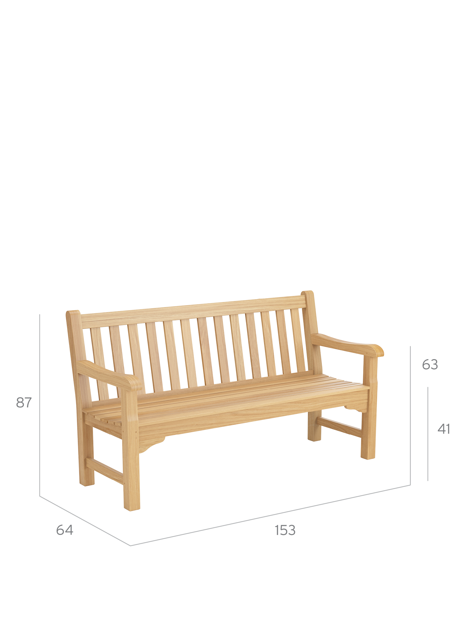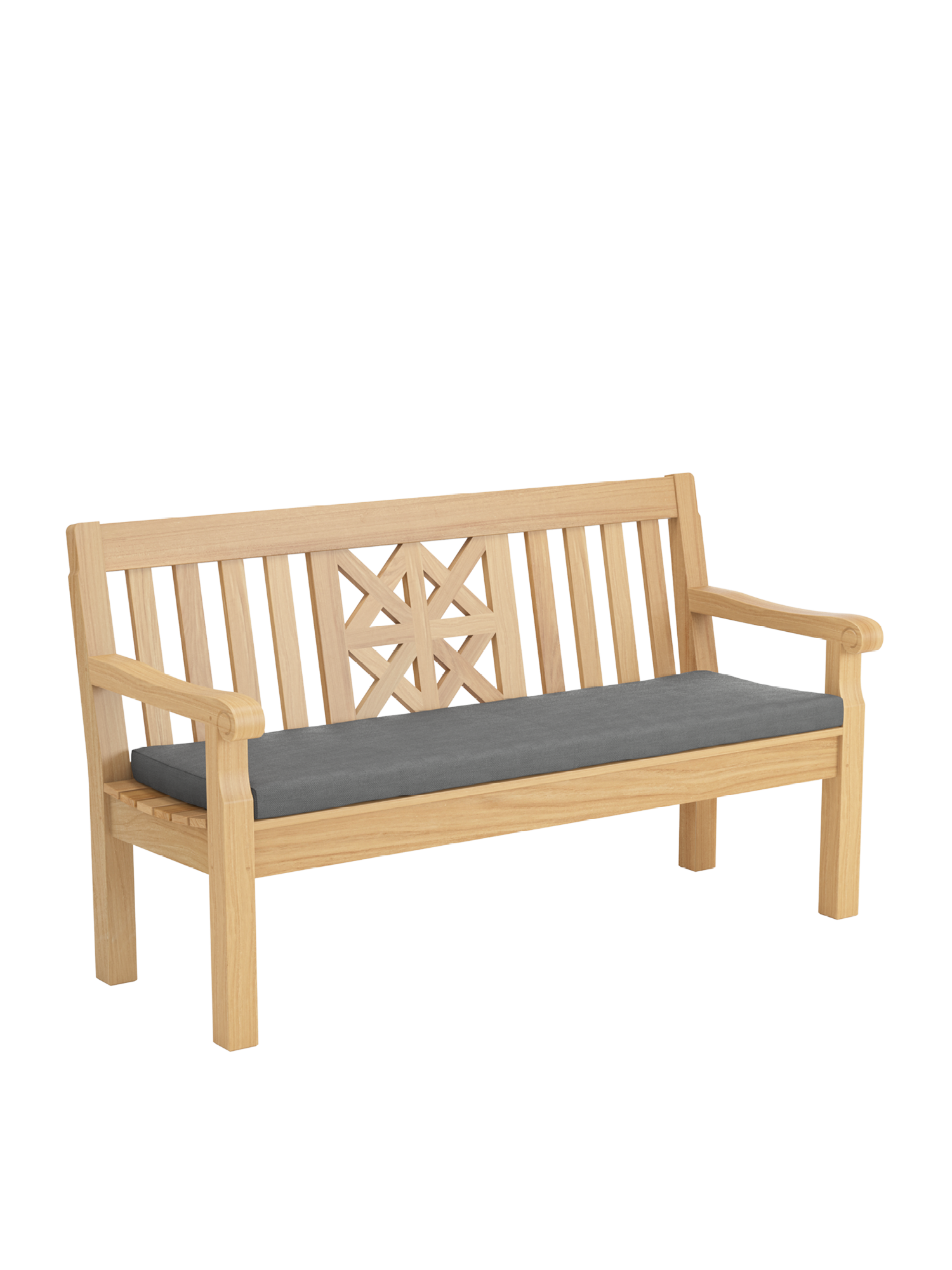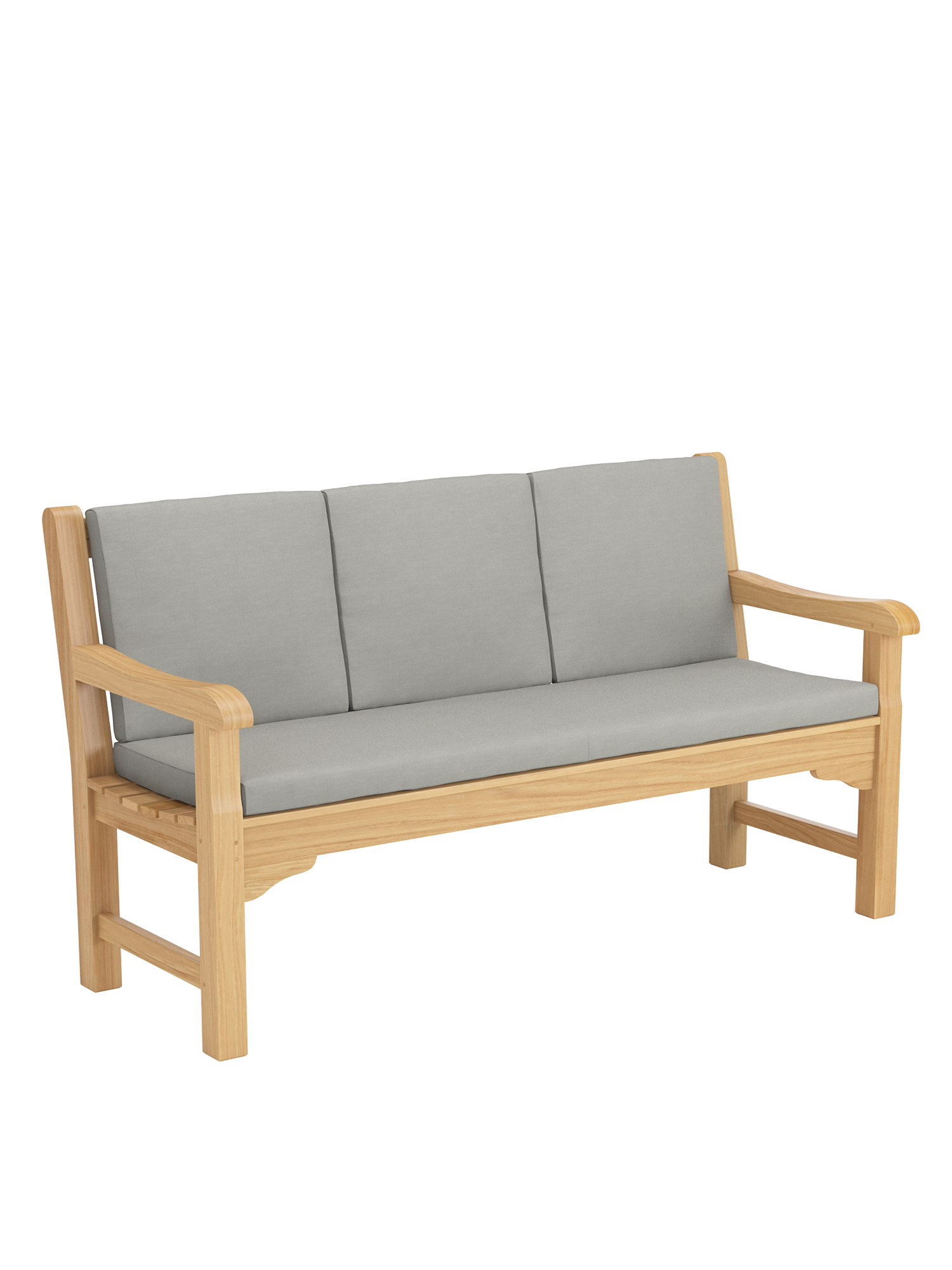 The generous seat of the teak bench is shaped to the body, the armrests are gently rounded and the slats and crosspiece of the backrest unite so smoothly that they look and feel as if they had been made from a single piece of wood.