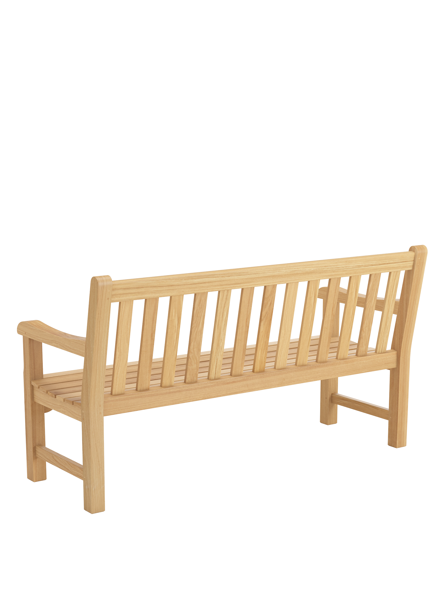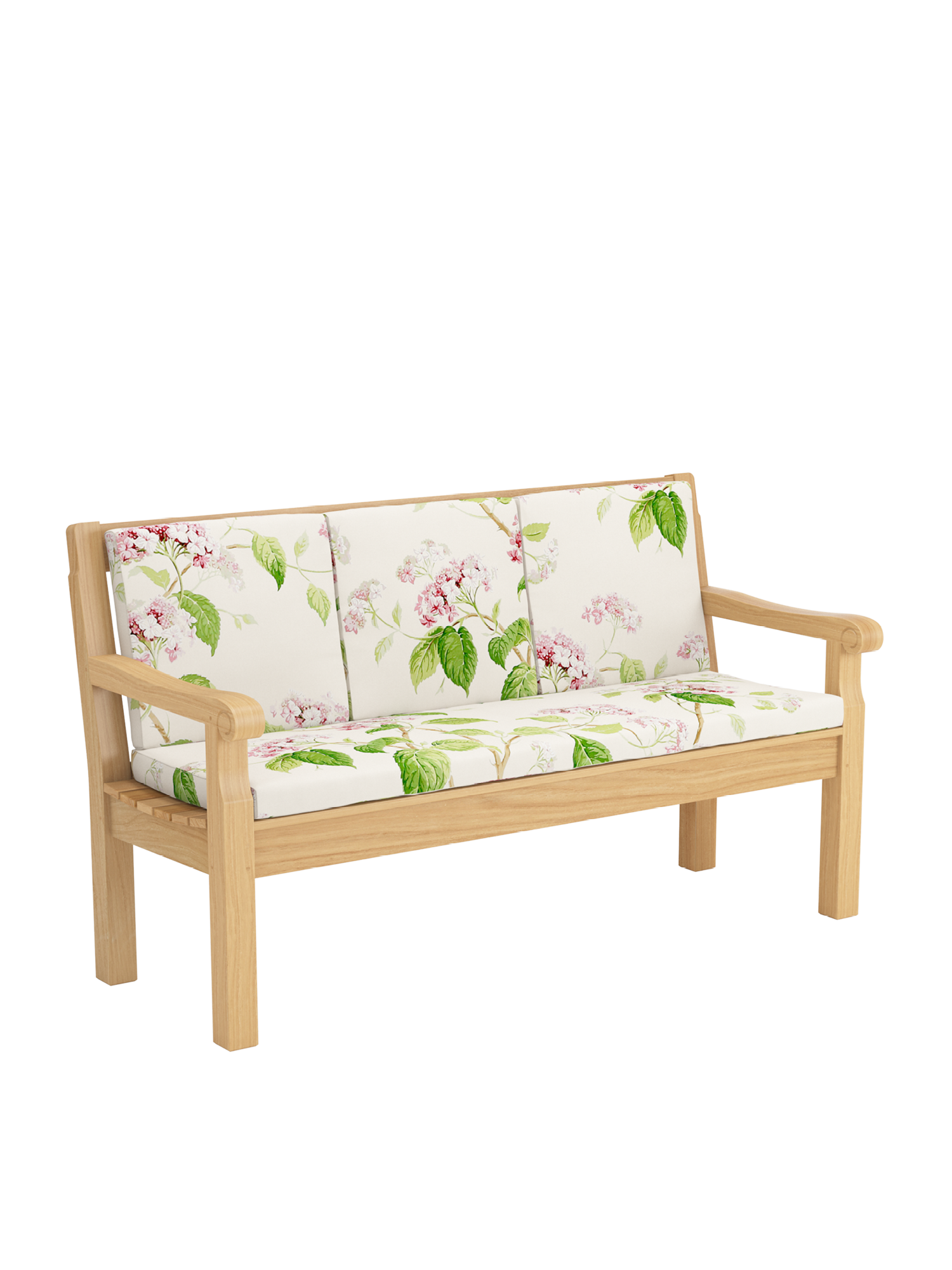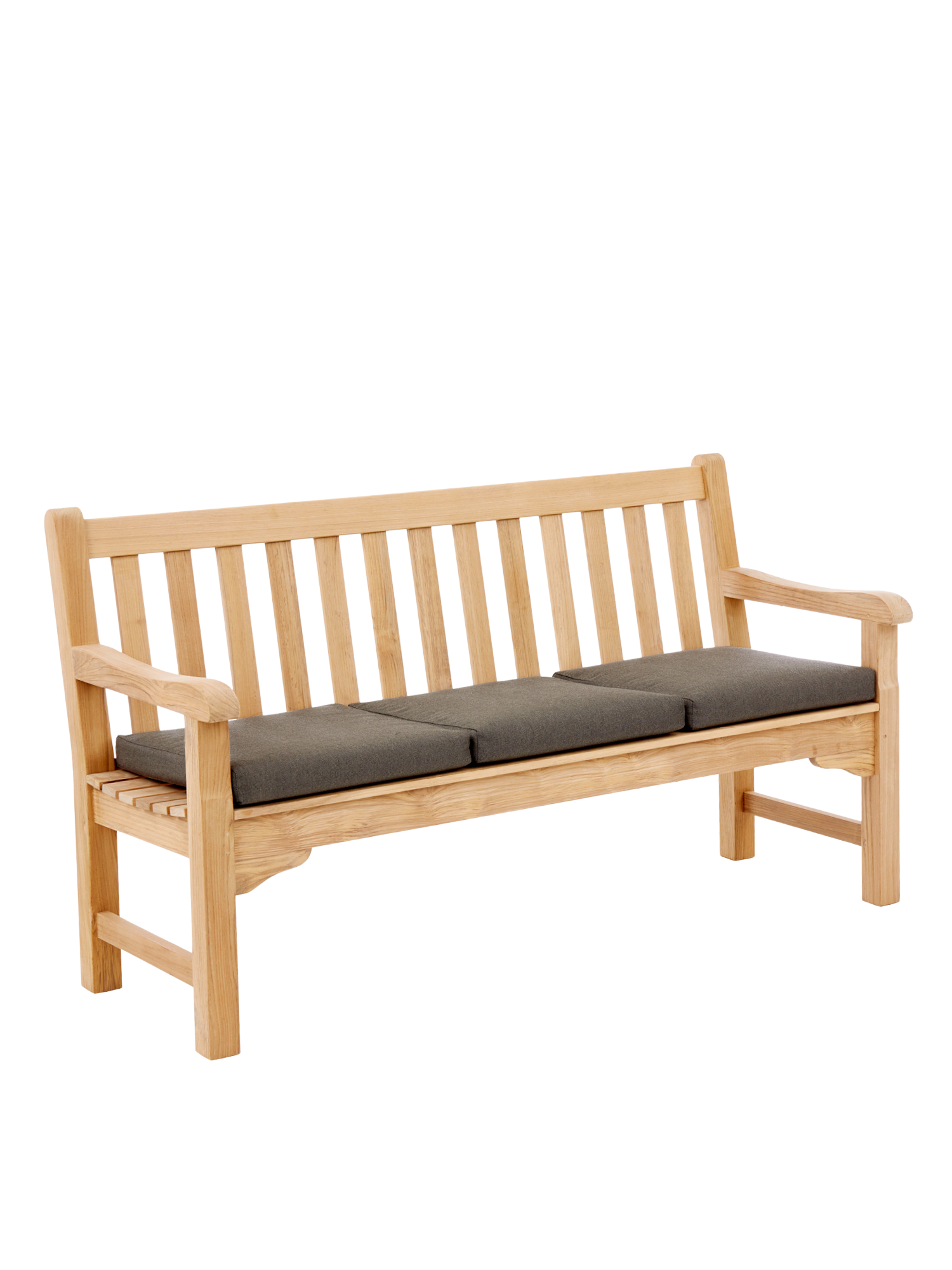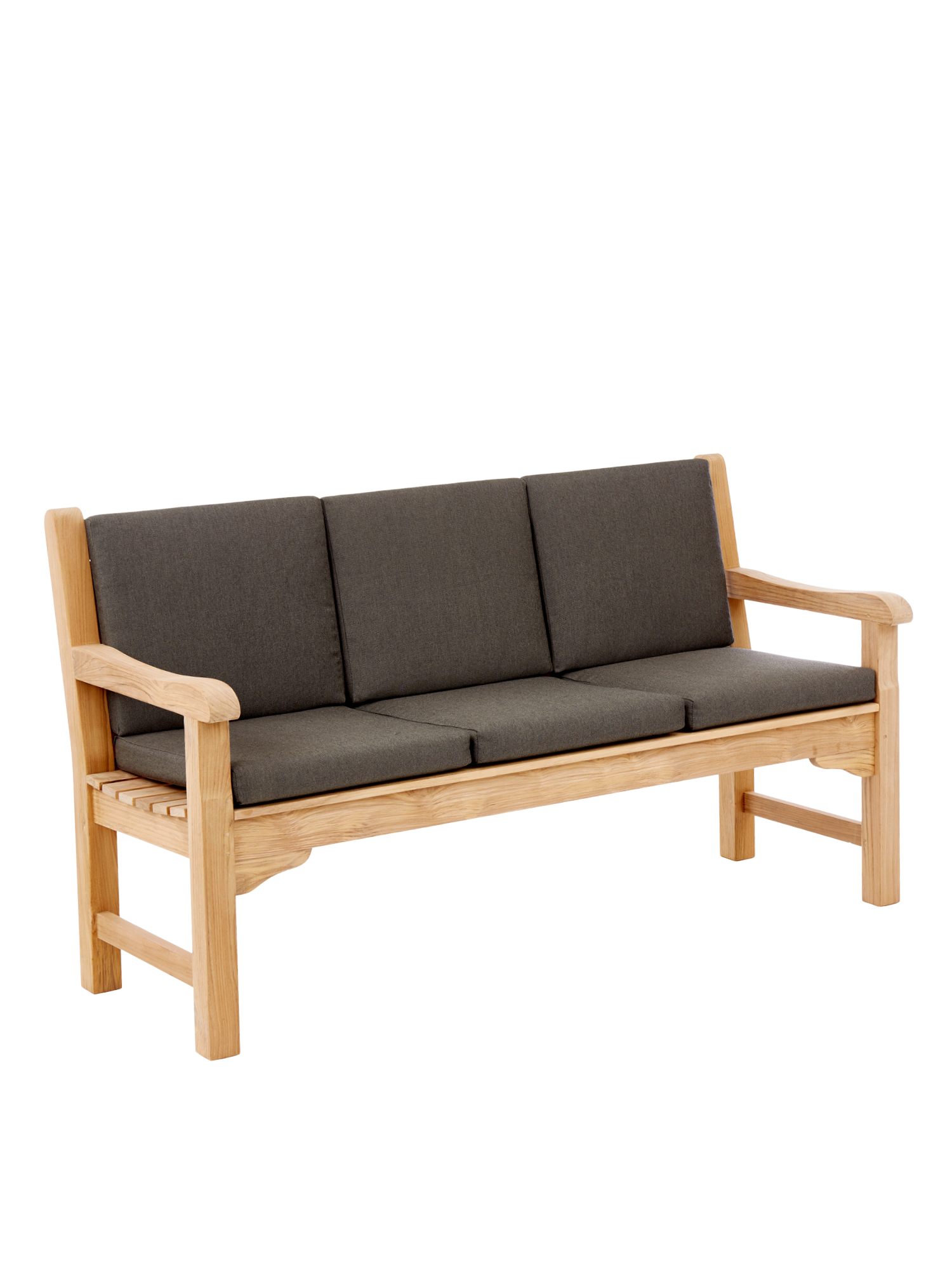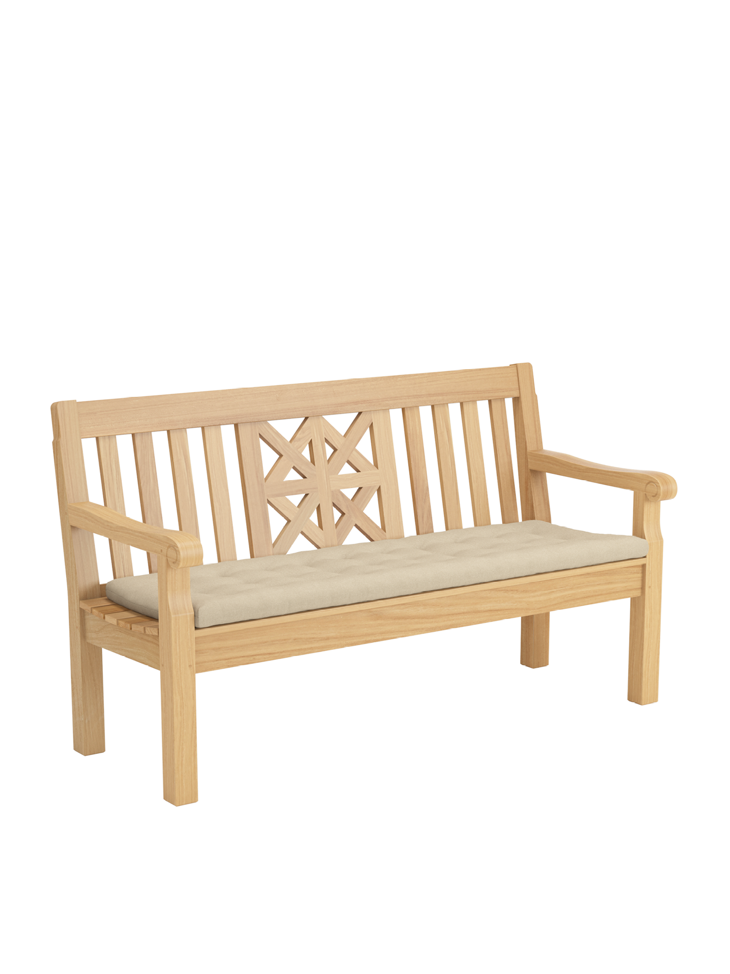 The generous seat of the teak bench is shaped to the body, the armrests are gently rounded and the slats and crosspiece of the backrest unite so smoothly that they look and feel as if they had been made from a single piece of wood.