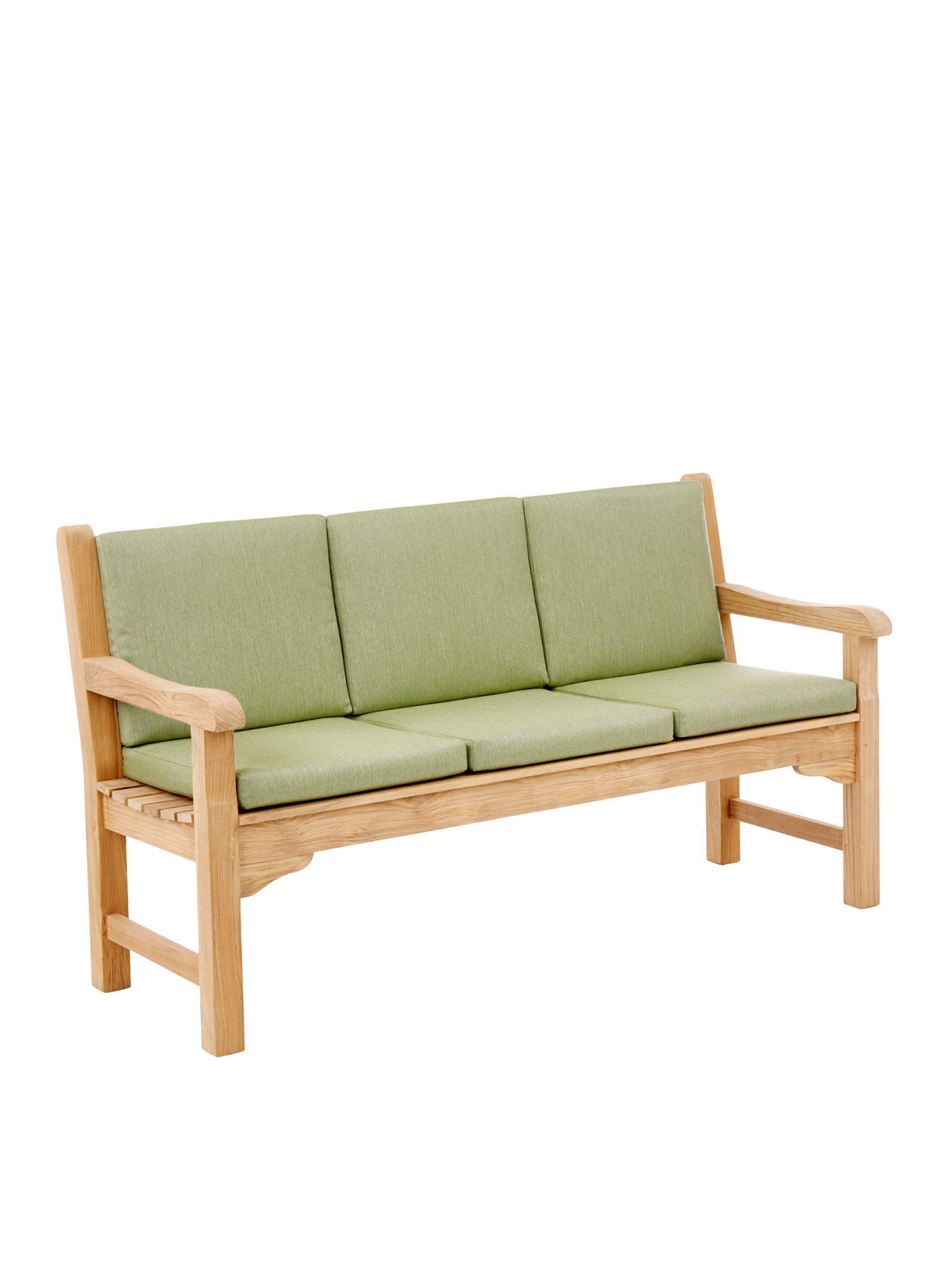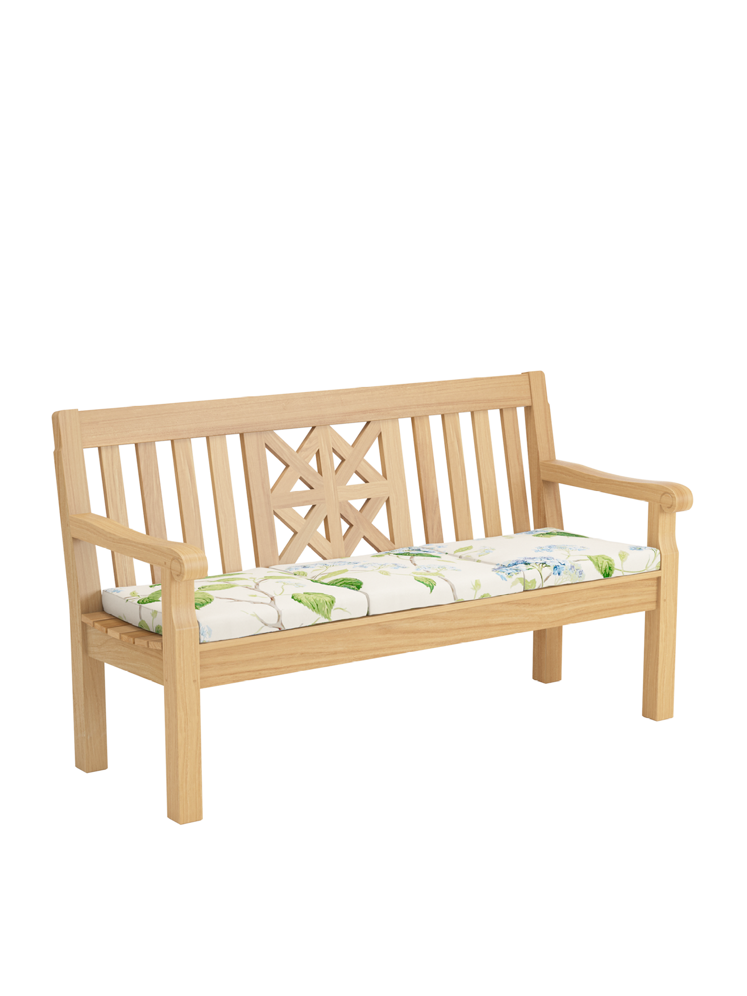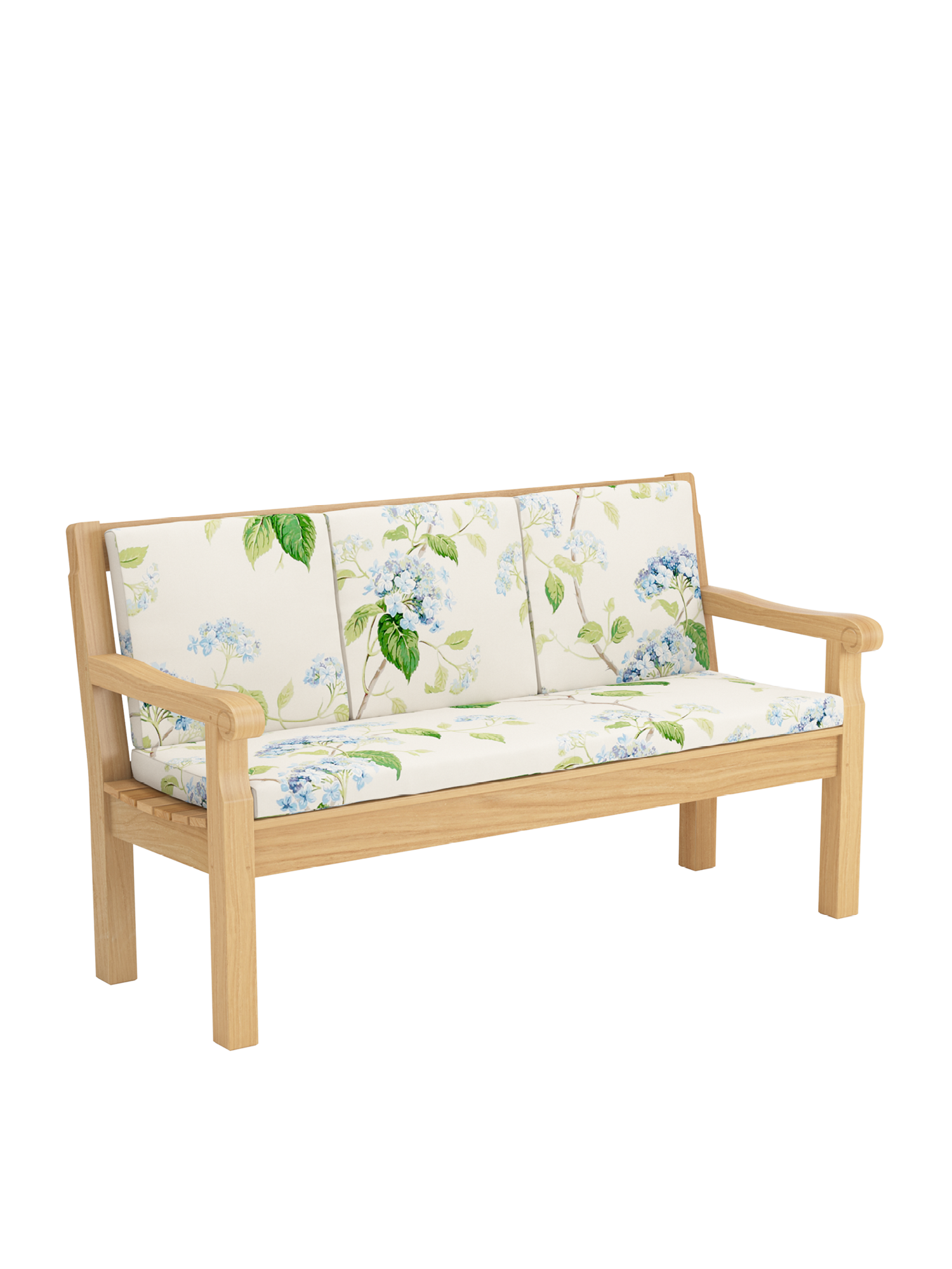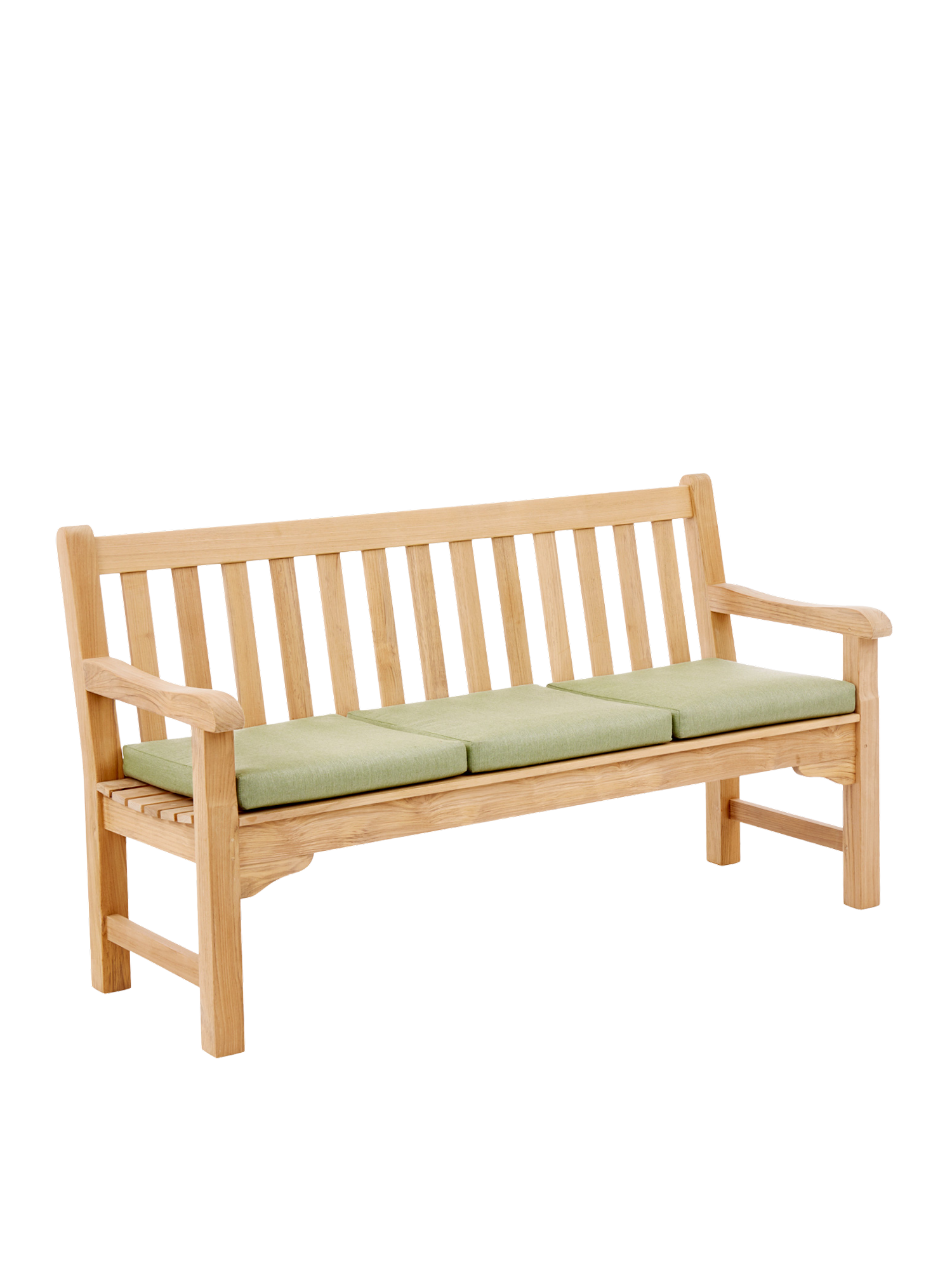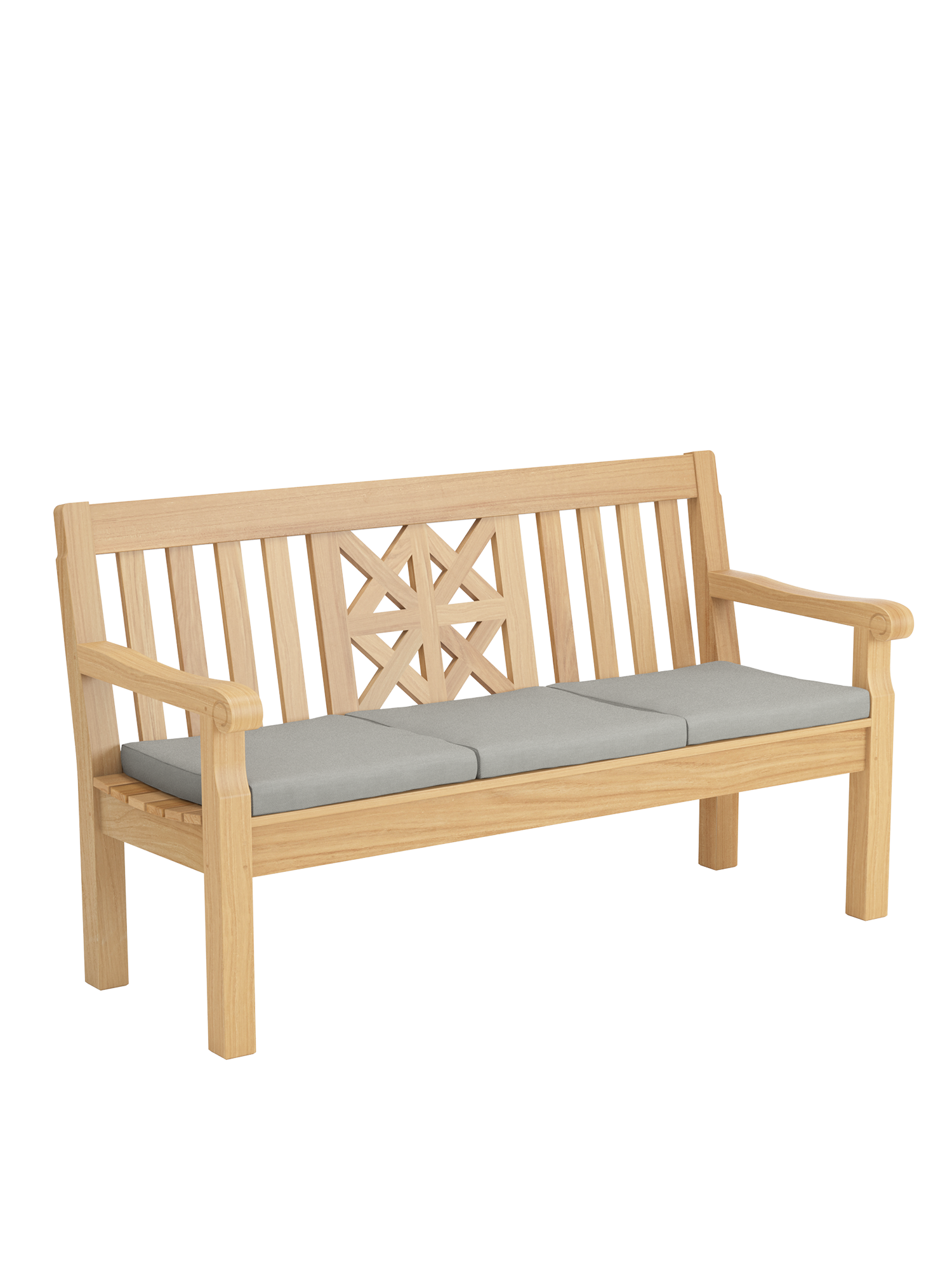 The generous seat of the teak bench is shaped to the body, the armrests are gently rounded and the slats and crosspiece of the backrest unite so smoothly that they look and feel as if they had been made from a single piece of wood.