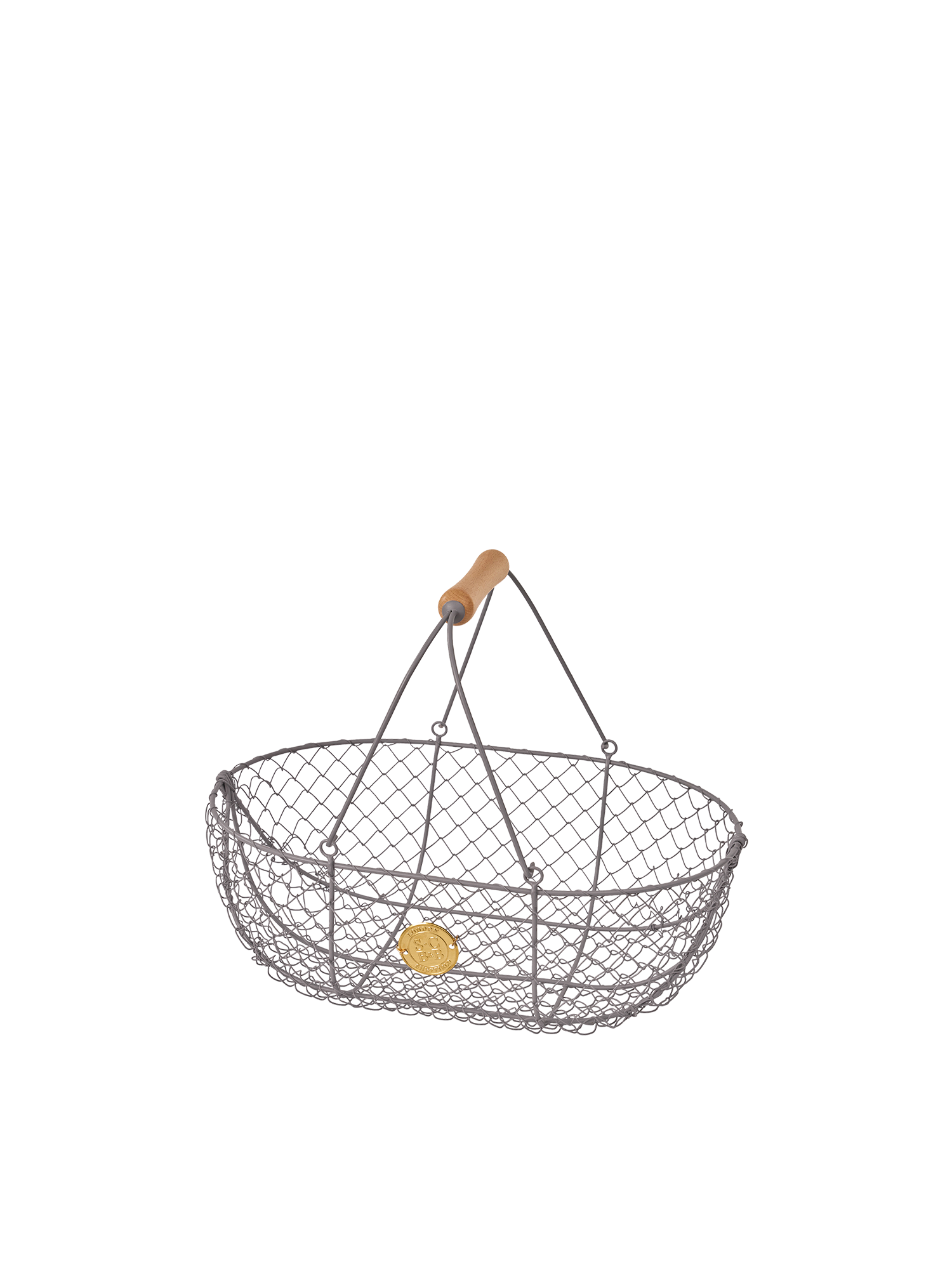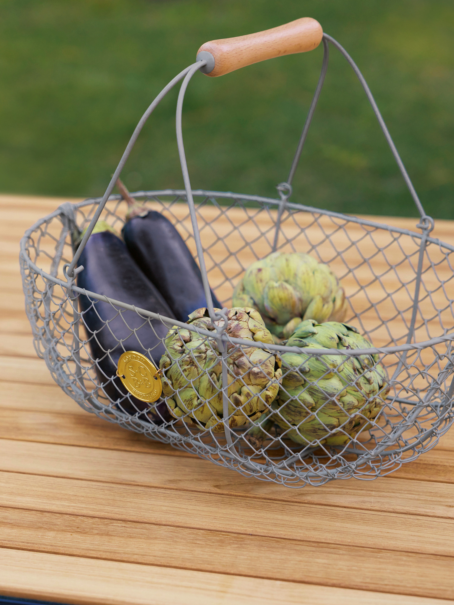The harvesting basket is handcrafted from galvanised, powder-coated iron wire and has a handle made of FSC-certified wood. It is suitable for transporting freshly harvested fruit and vegetables, but can also hold small garden tools or showcase dried flowers.
