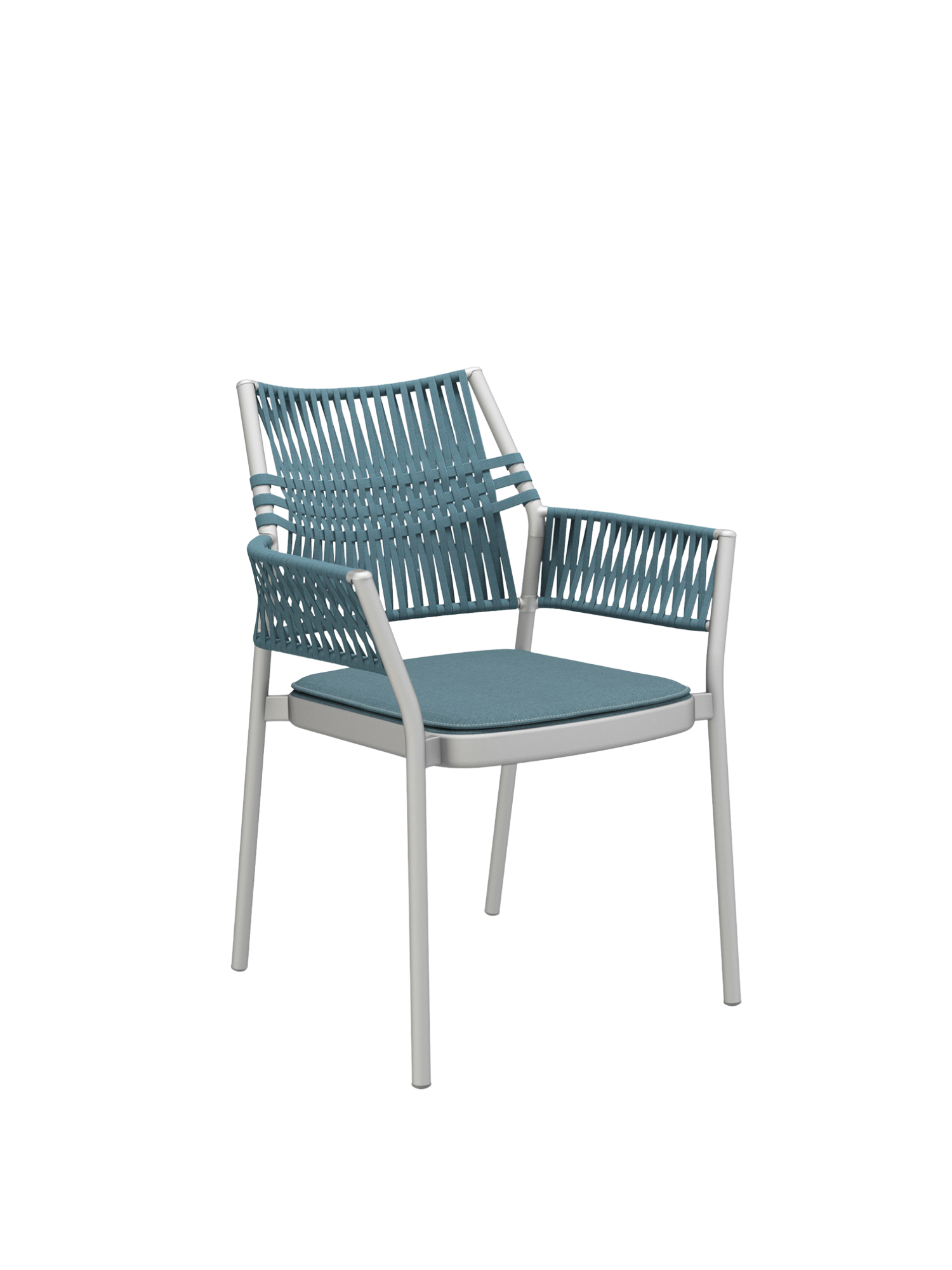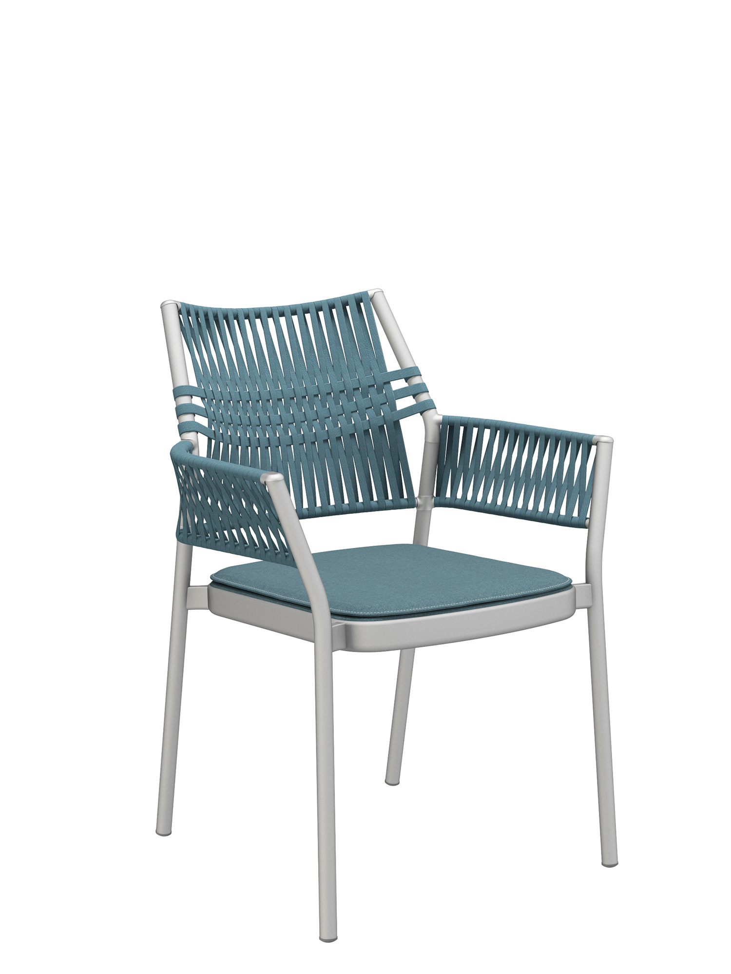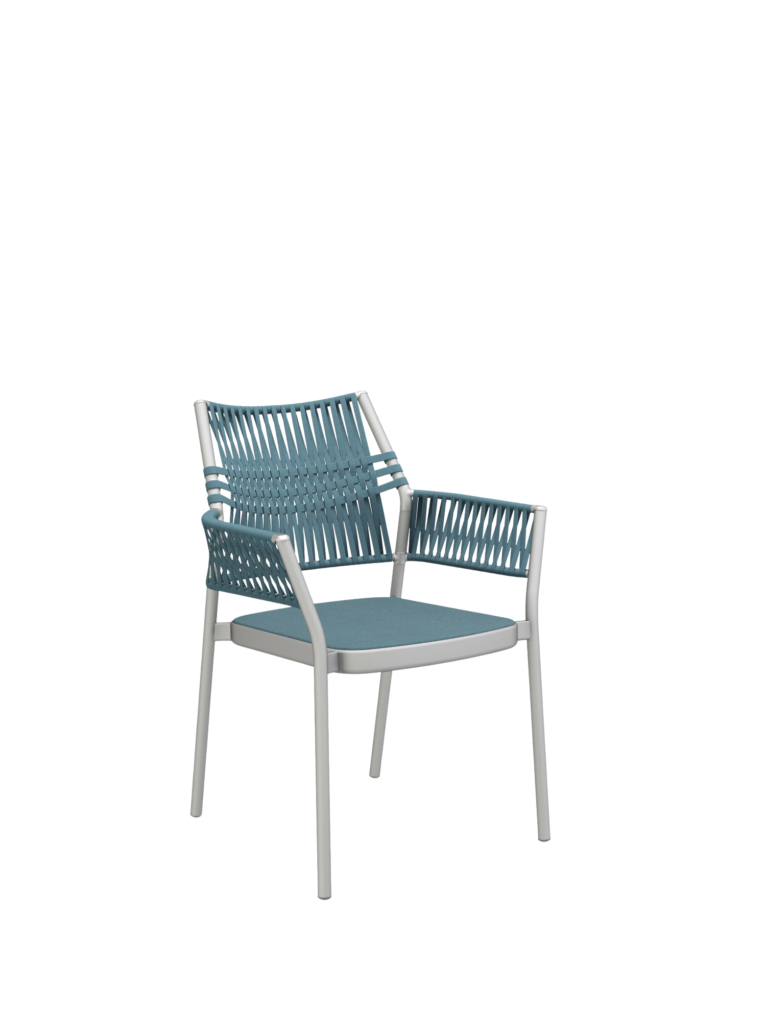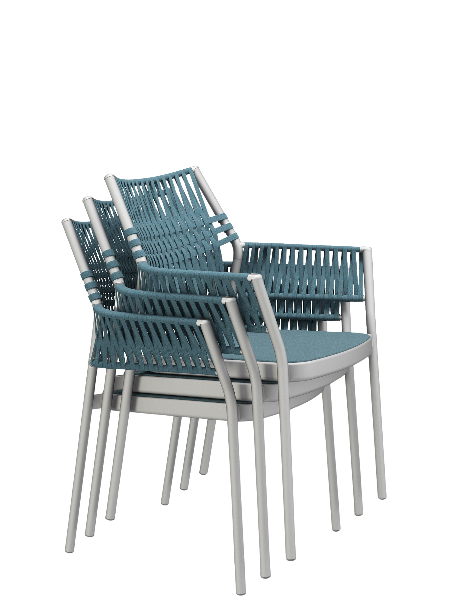 The three-dimensional, woven covering of the stackable chairs is made of quick-drying, UV-resistant, and easy to clean polypropylene, the seat material is made of polyacrylic. The cords are created by the braiding together of differing threads, whose subtle nuances of colour and haptic quality endow the furniture with additional resilience and depth.