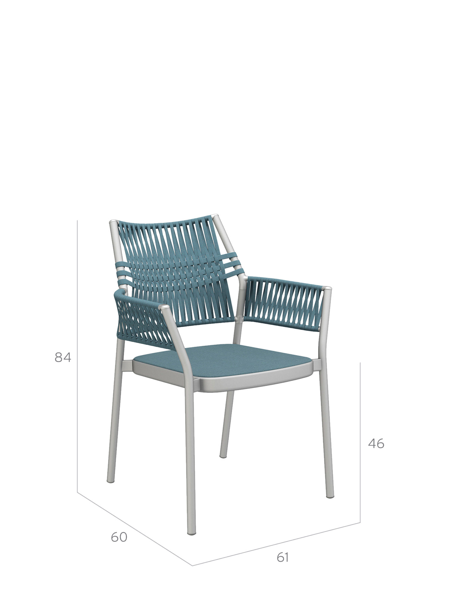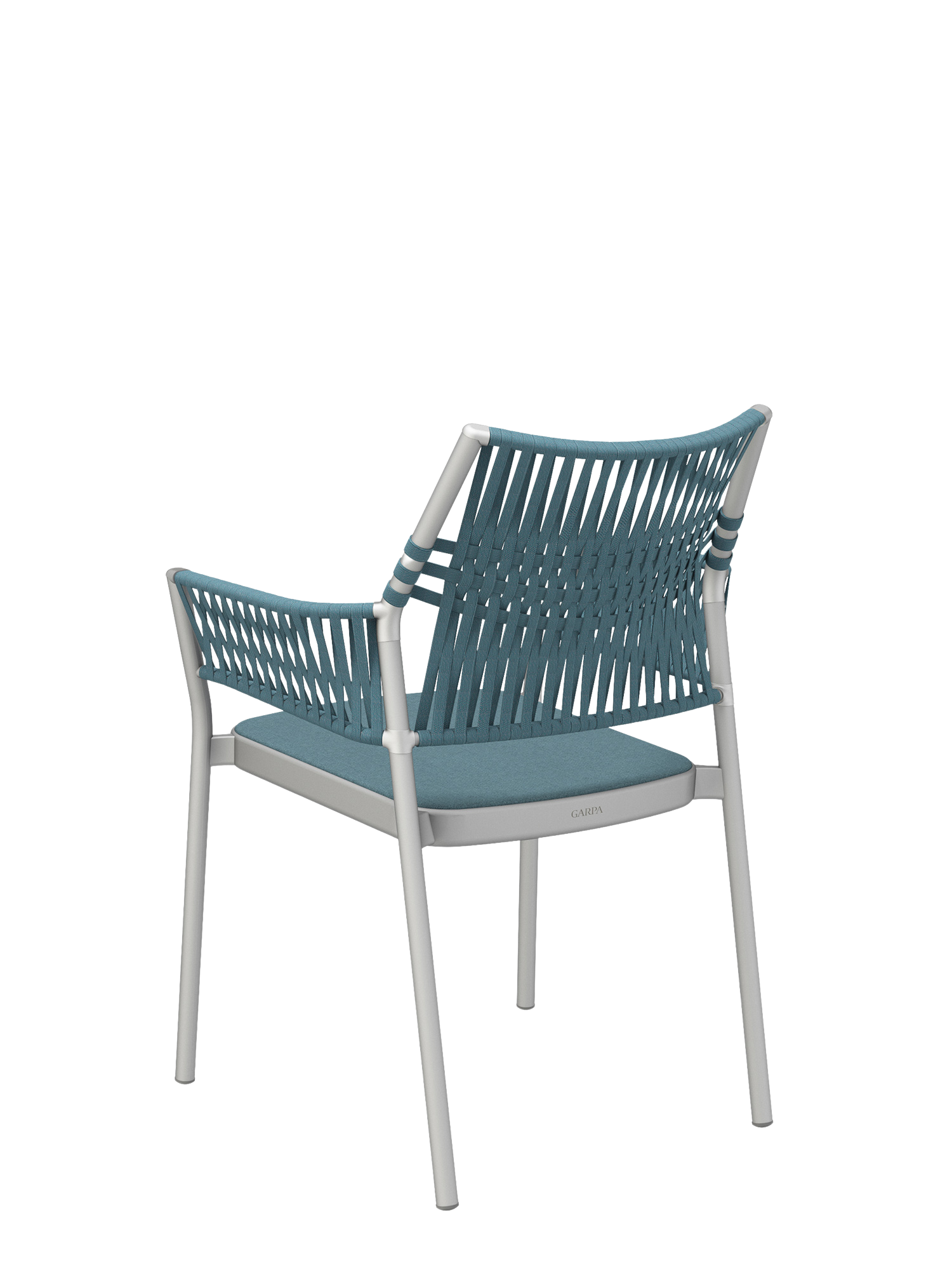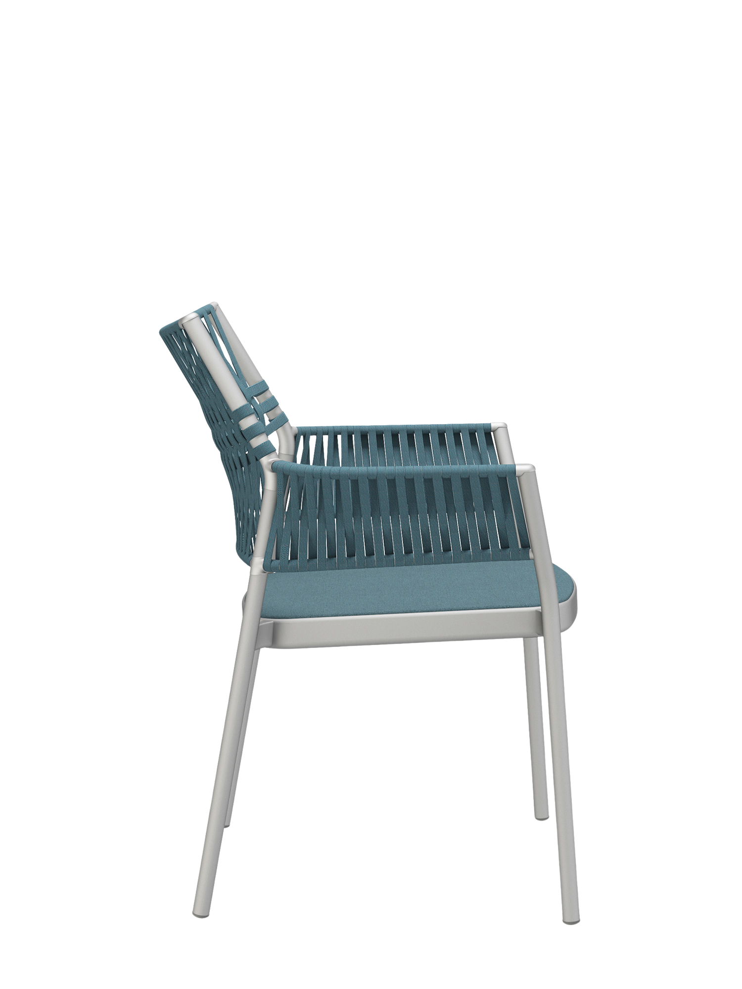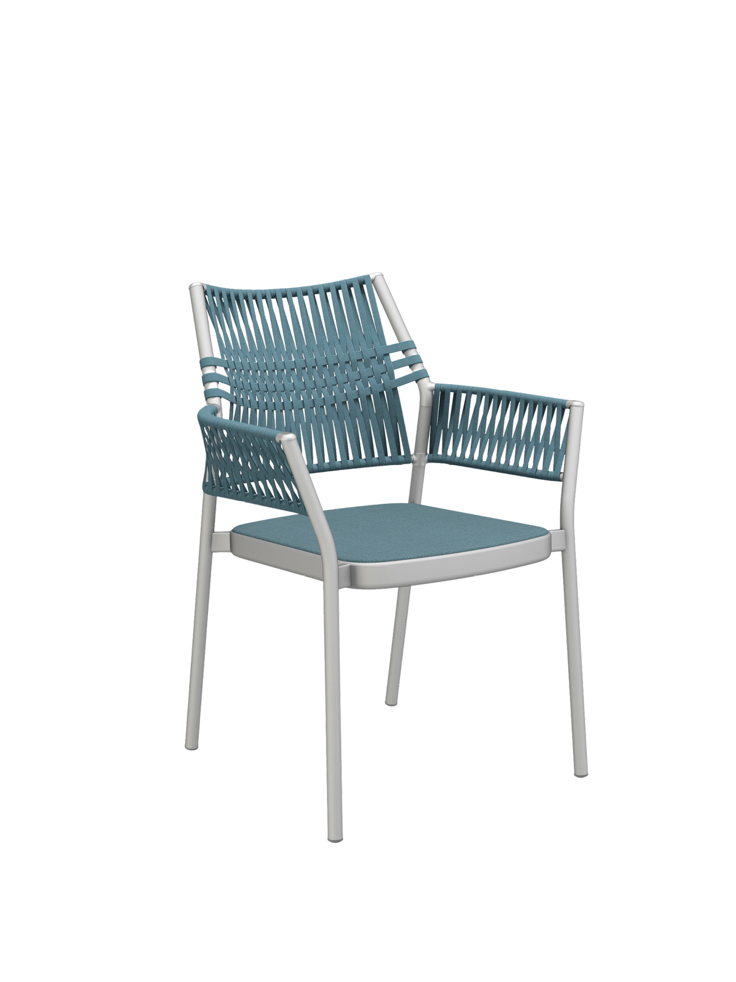 The three-dimensional, woven covering of the stackable chairs is made of quick-drying, UV-resistant, and easy to clean polypropylene, the seat material is made of polyacrylic. The cords are created by the braiding together of differing threads, whose subtle nuances of colour and haptic quality endow the furniture with additional resilience and depth.