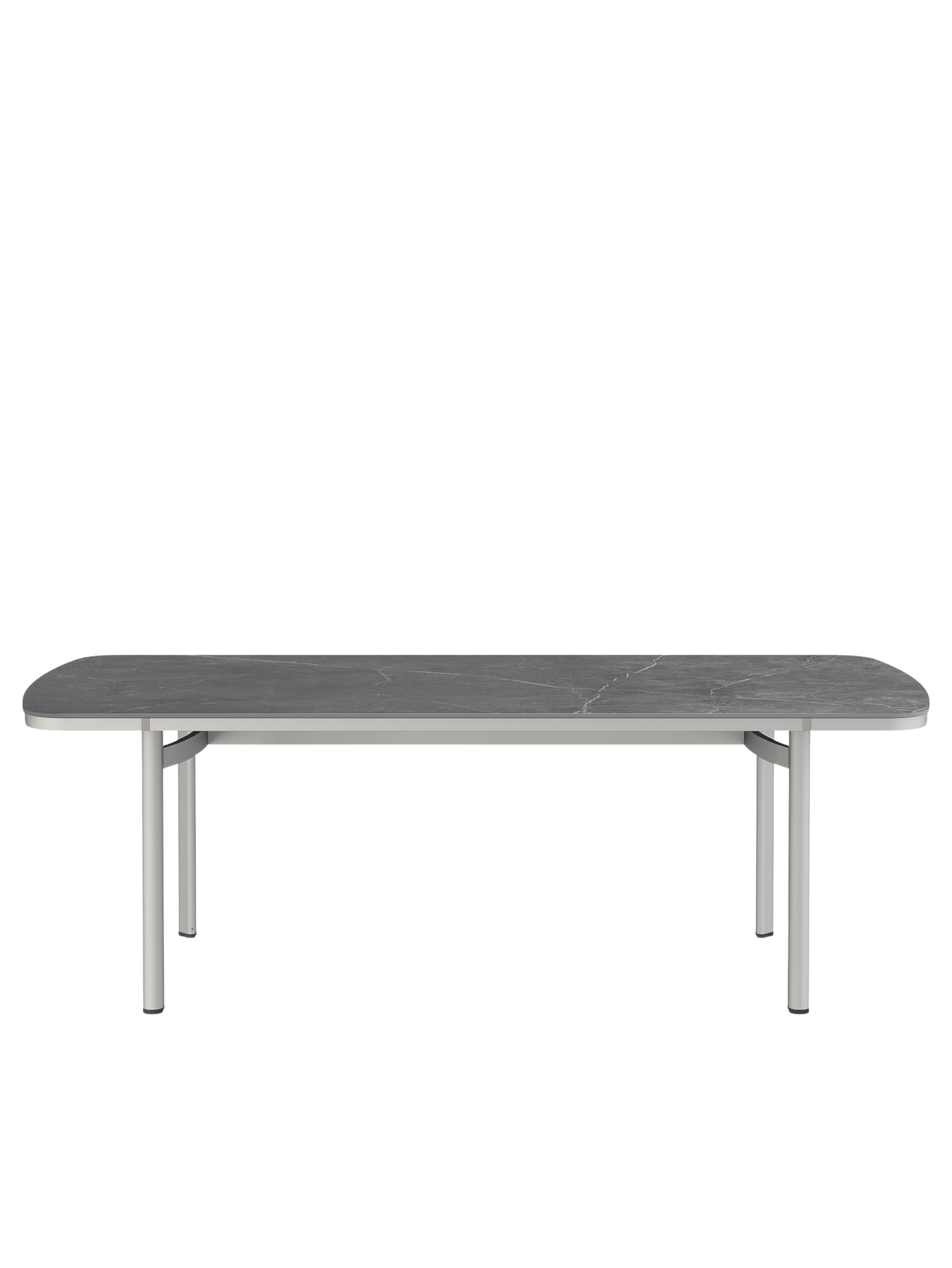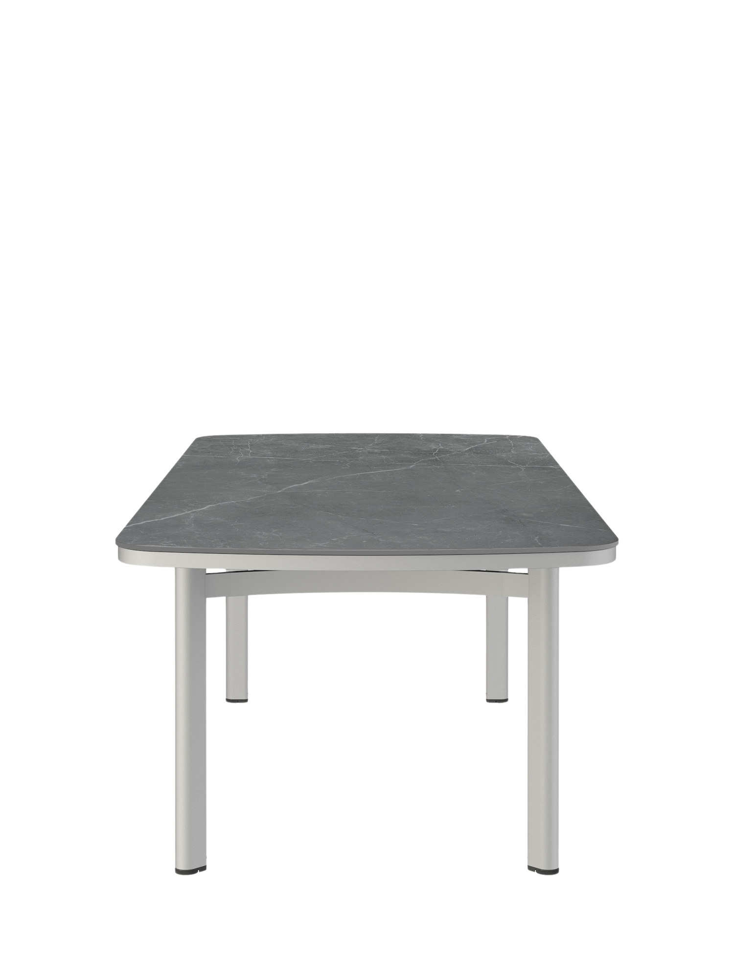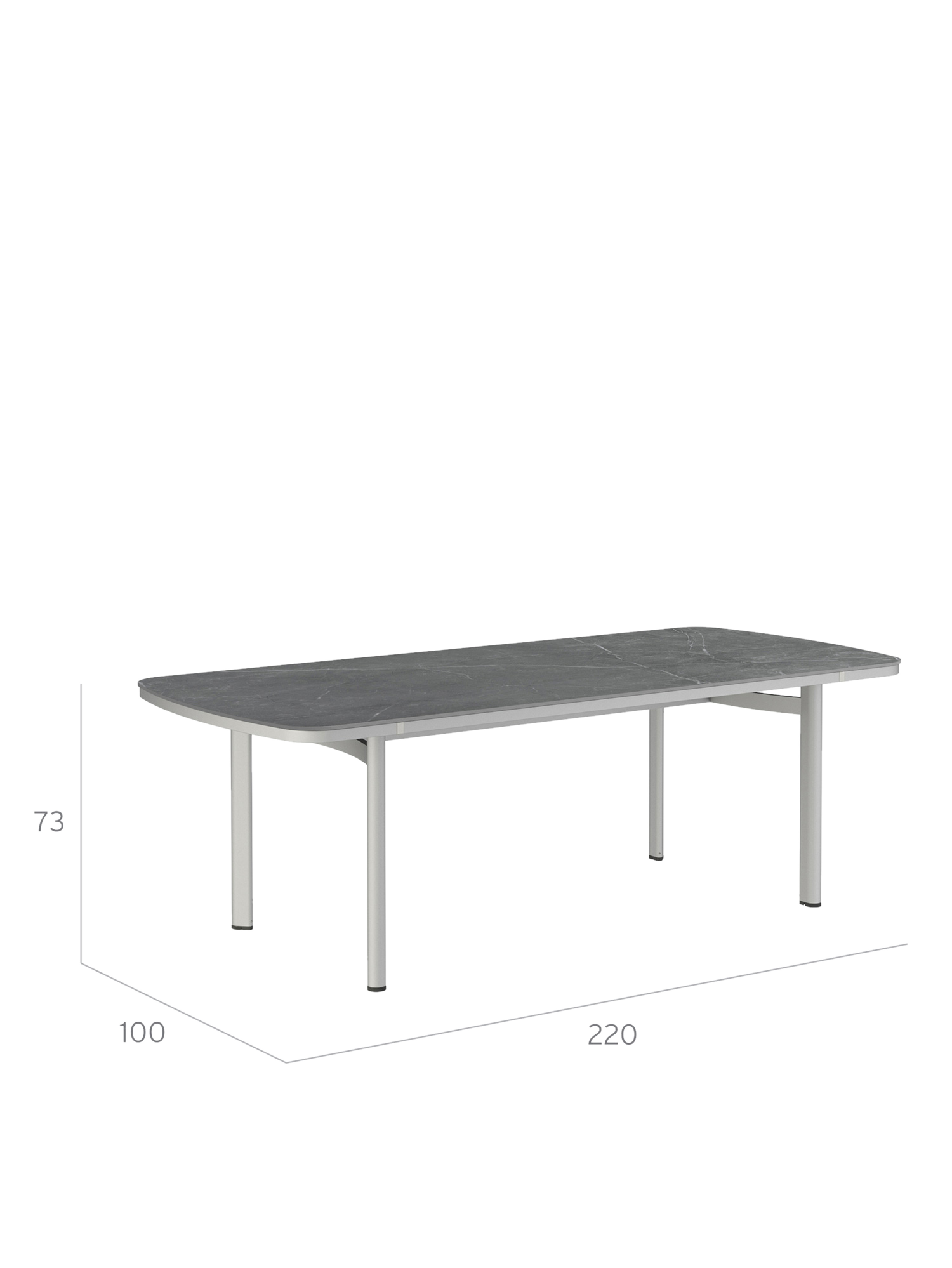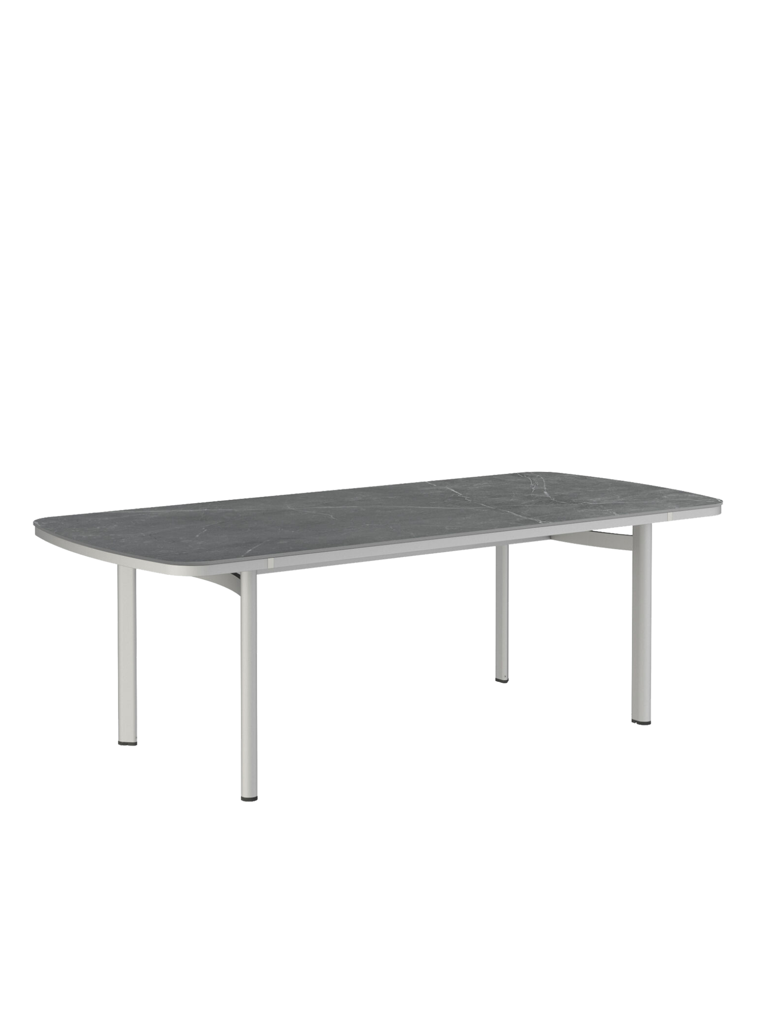 The nuanced hues of the easy to care for, and UV-resistant ceramic tops harmonise with the weave of the cord and the subtly shimmering anodized frames. The matt surfaces with the look of decoratively grained marble, embellish the generous tables with an elegant accent. They are available in three sizes.