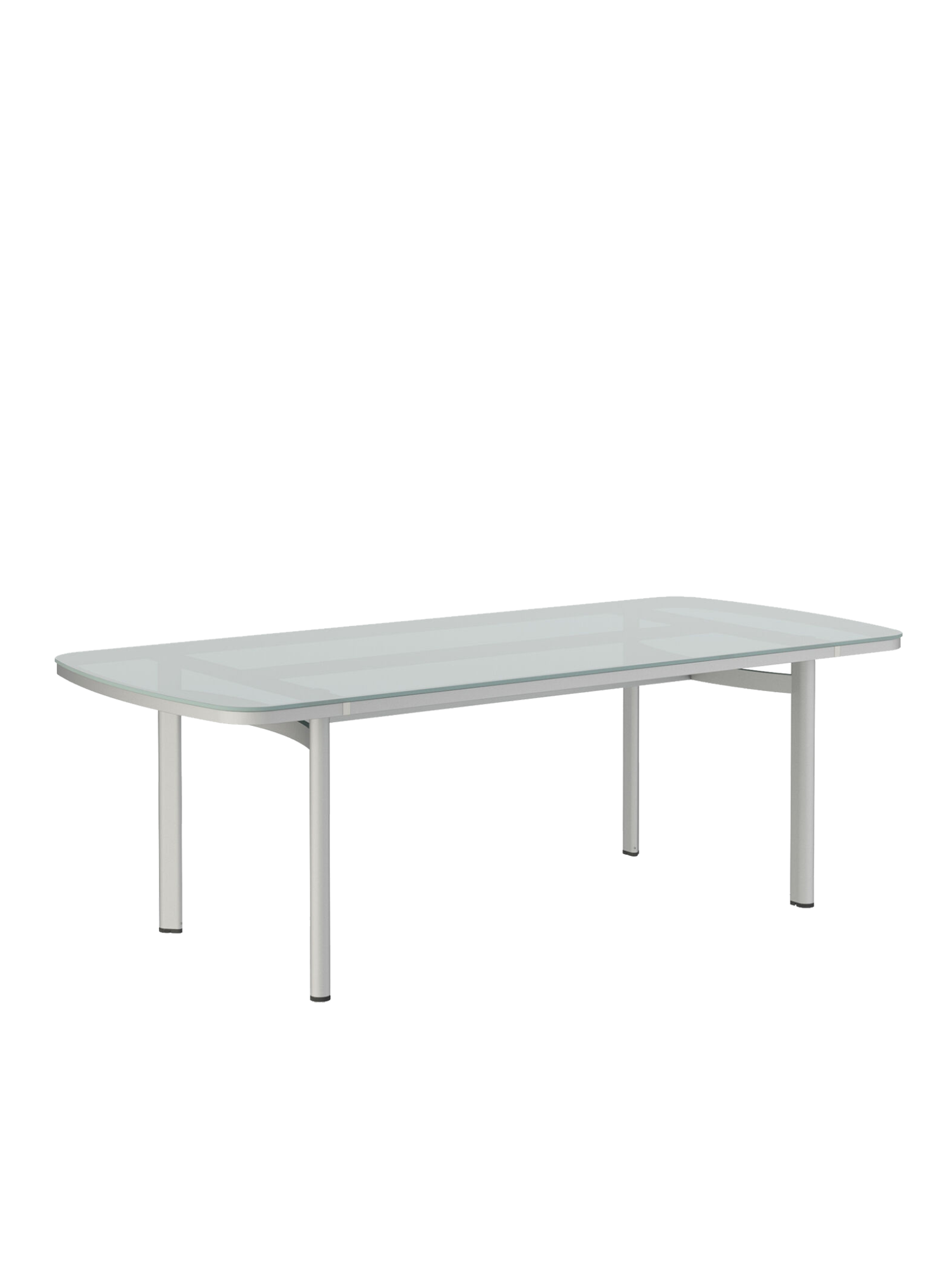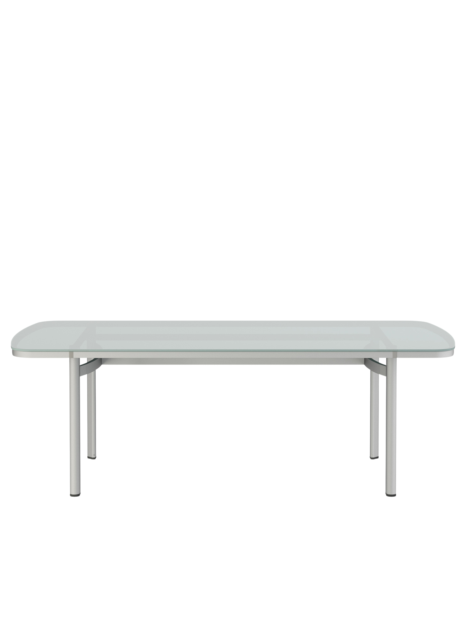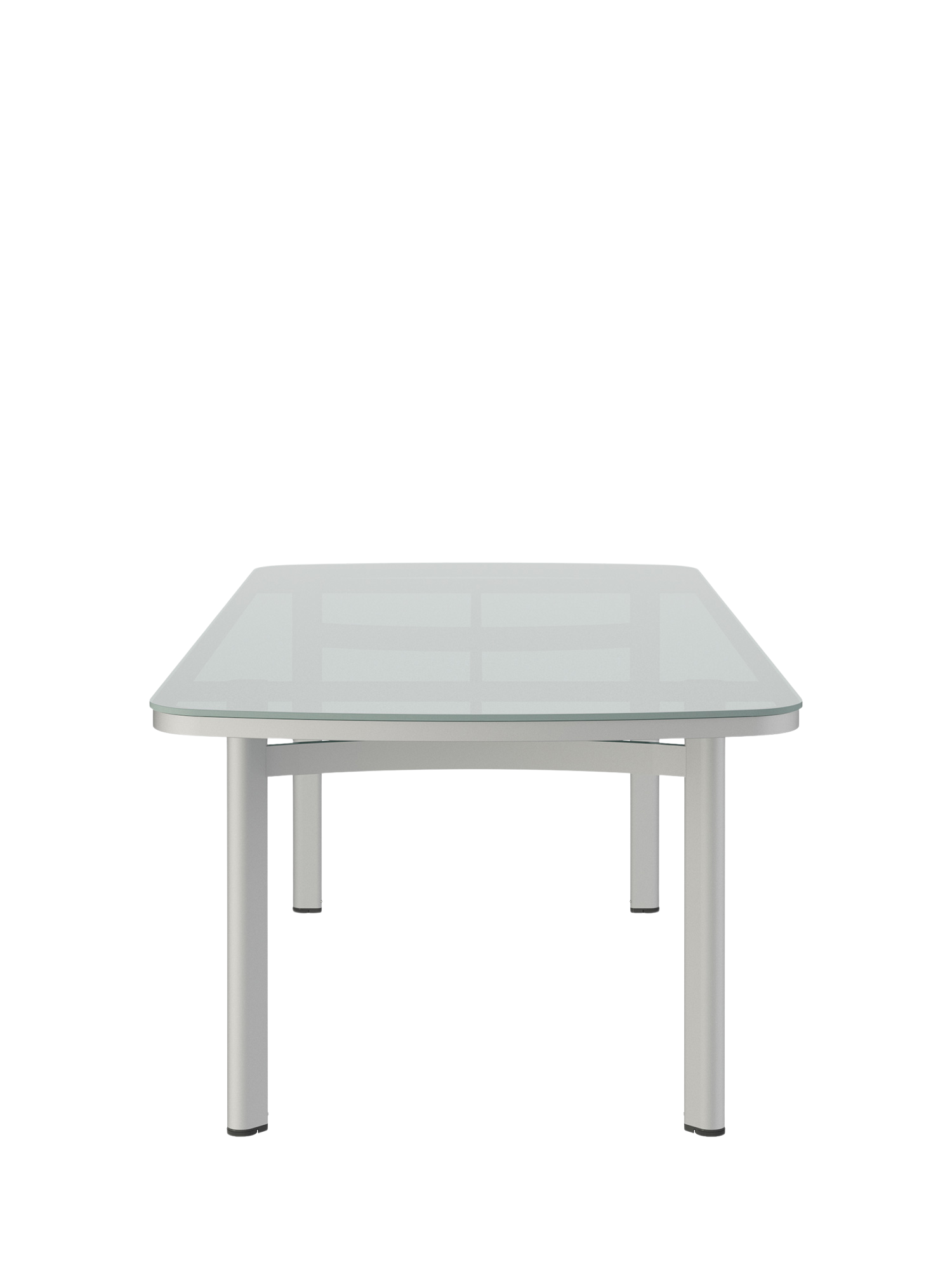 The tabletops made of safety-glass in a light shade of grey, harmonise with the weave of the cord and the softly shimmering anodised frames. Their matt surfaces with a lovely velvety appearance, create a delightful visual and haptic effect. The edges of the tabletops are polished, setting an additional accent with their gentle sheen. Temper tables with glass tops are available in three different sizes.