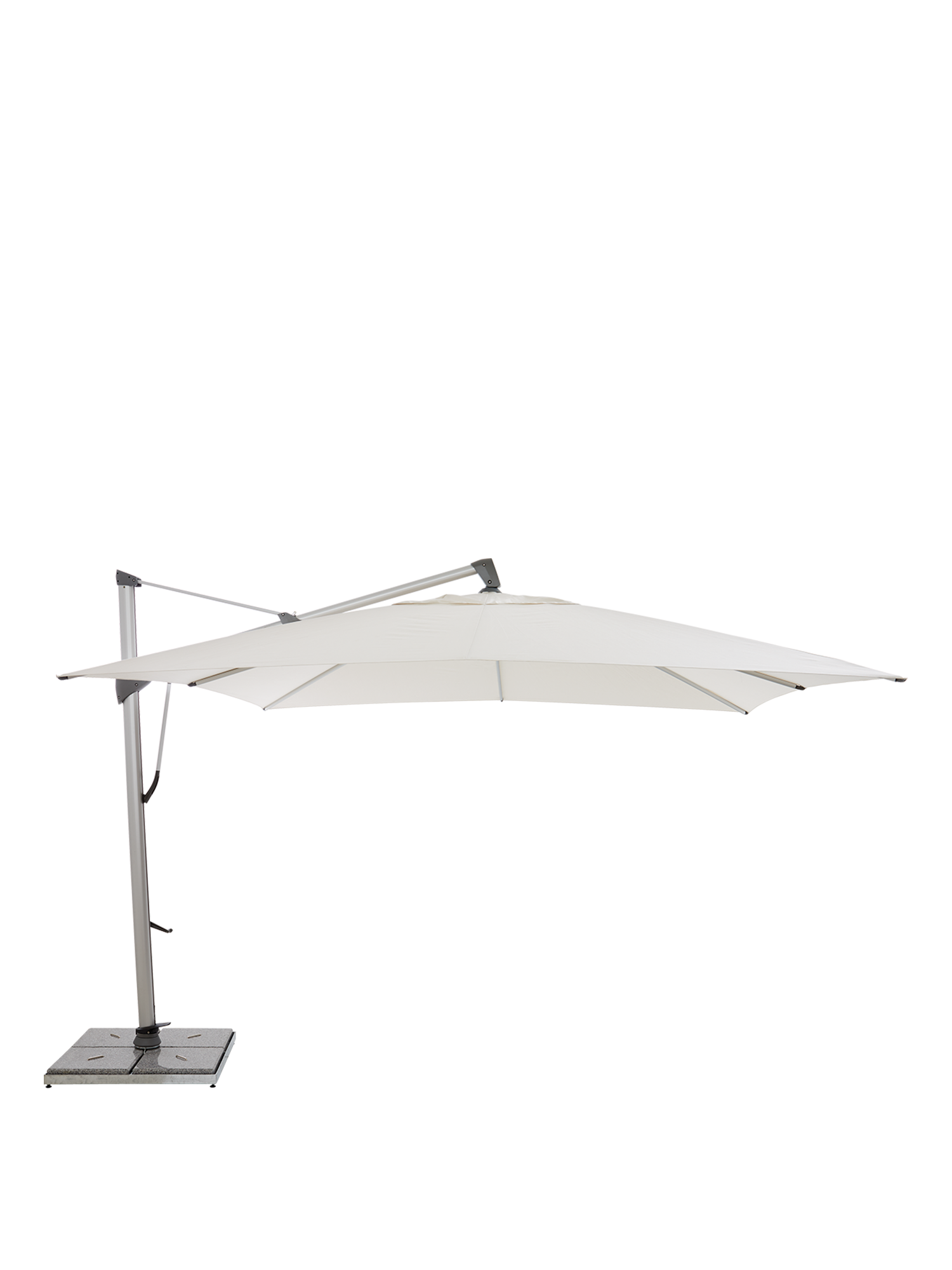 Trentino's pole can be loosened in the base with the foot pedal and rotated by hand on its own axis. In this way the parasol arm always moves the shade according to the position of the sun. The canopy can also be tilted up to 90 degrees and locked in three different positions. At the table and on the terrace Trentino is especially welcome: while the canopy floats over the centre of things, the pole made of silver-grey aluminium stands discreetly to the side. The parasol is unfurled with a handle, and when closed, it is very slender.