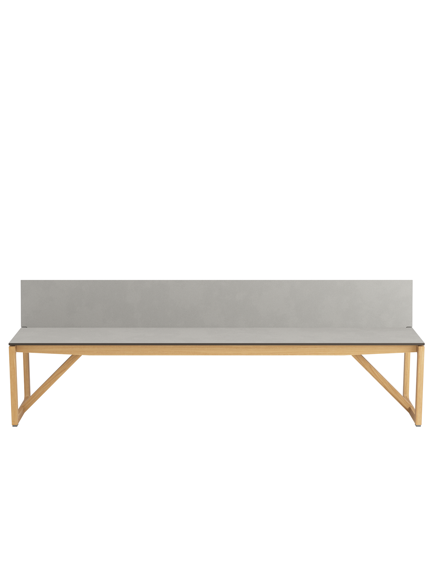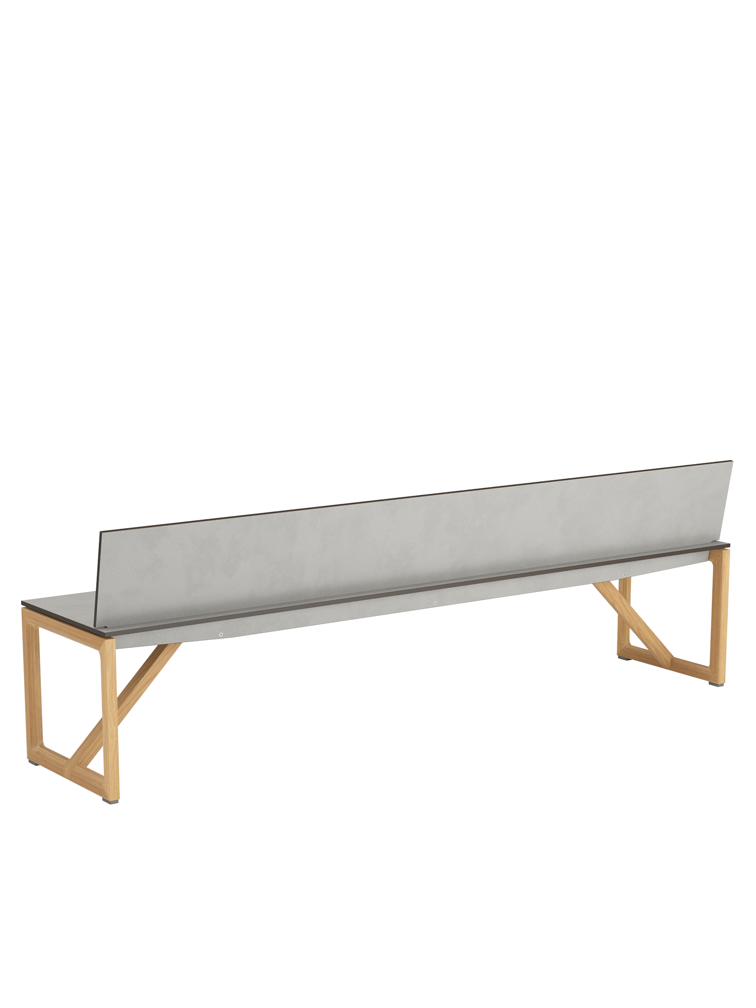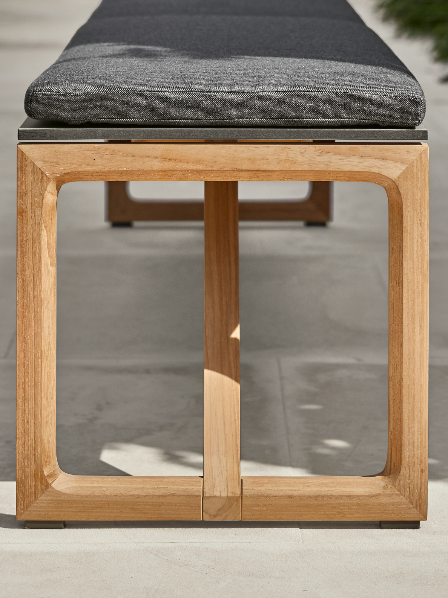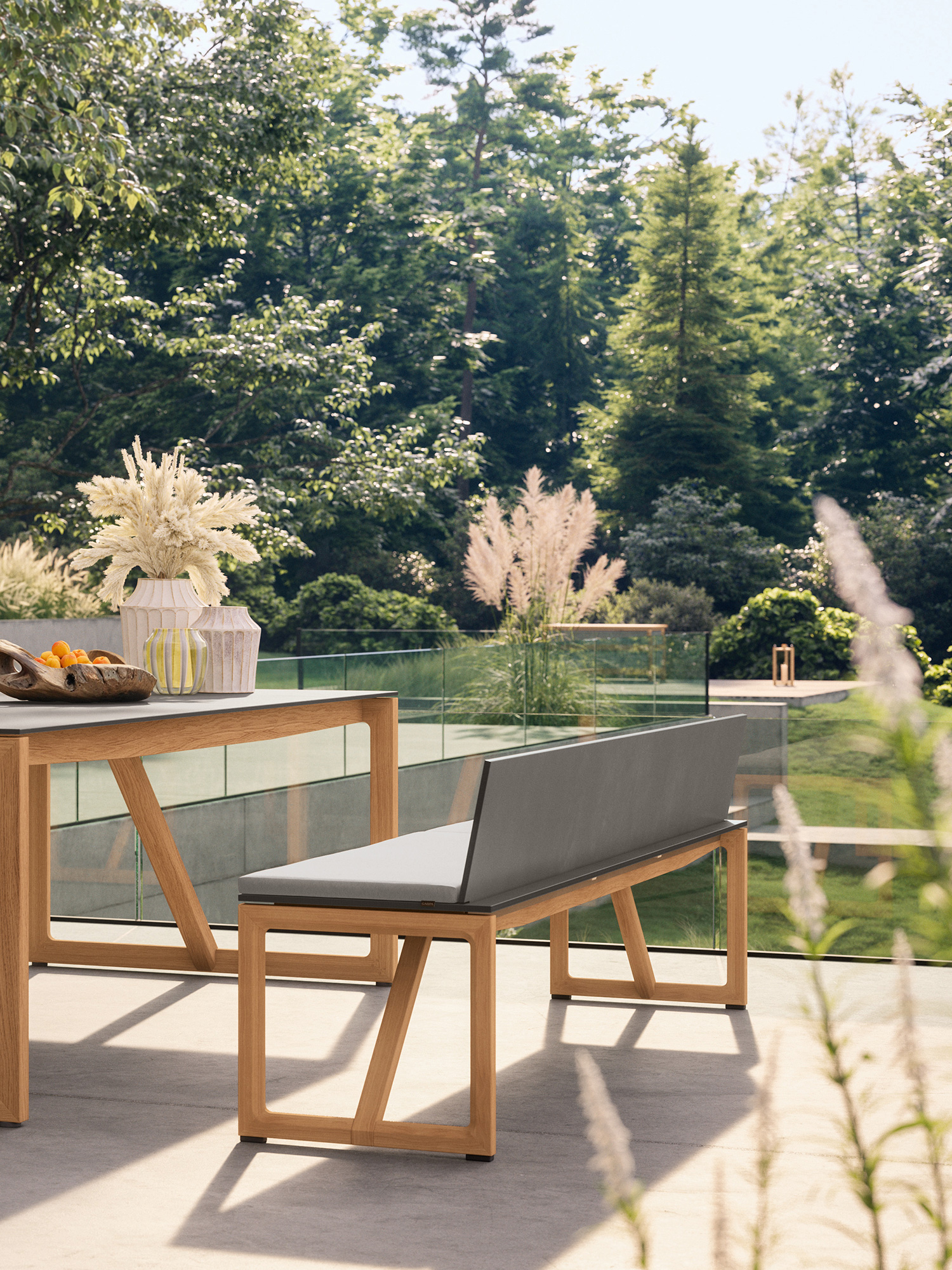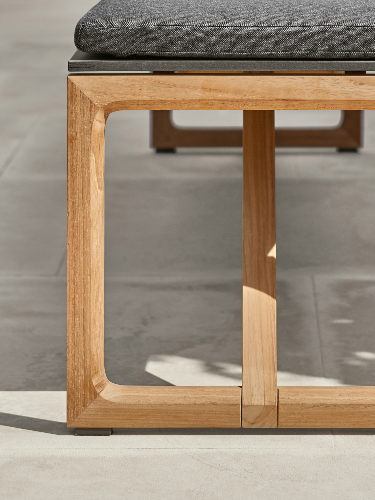 The benches of the series, with and without backrests, match the table with their combination of teak frames and synthetic resin tops. After convivial evenings or in the case of pouring rain, the benches disappear completely under the table and together, they create a compact block. The lightly structured and natural-looking grey surfaces made of synthetic resin, are up for anything. They are weather and UV-resistant, and are extremely easy to clean.