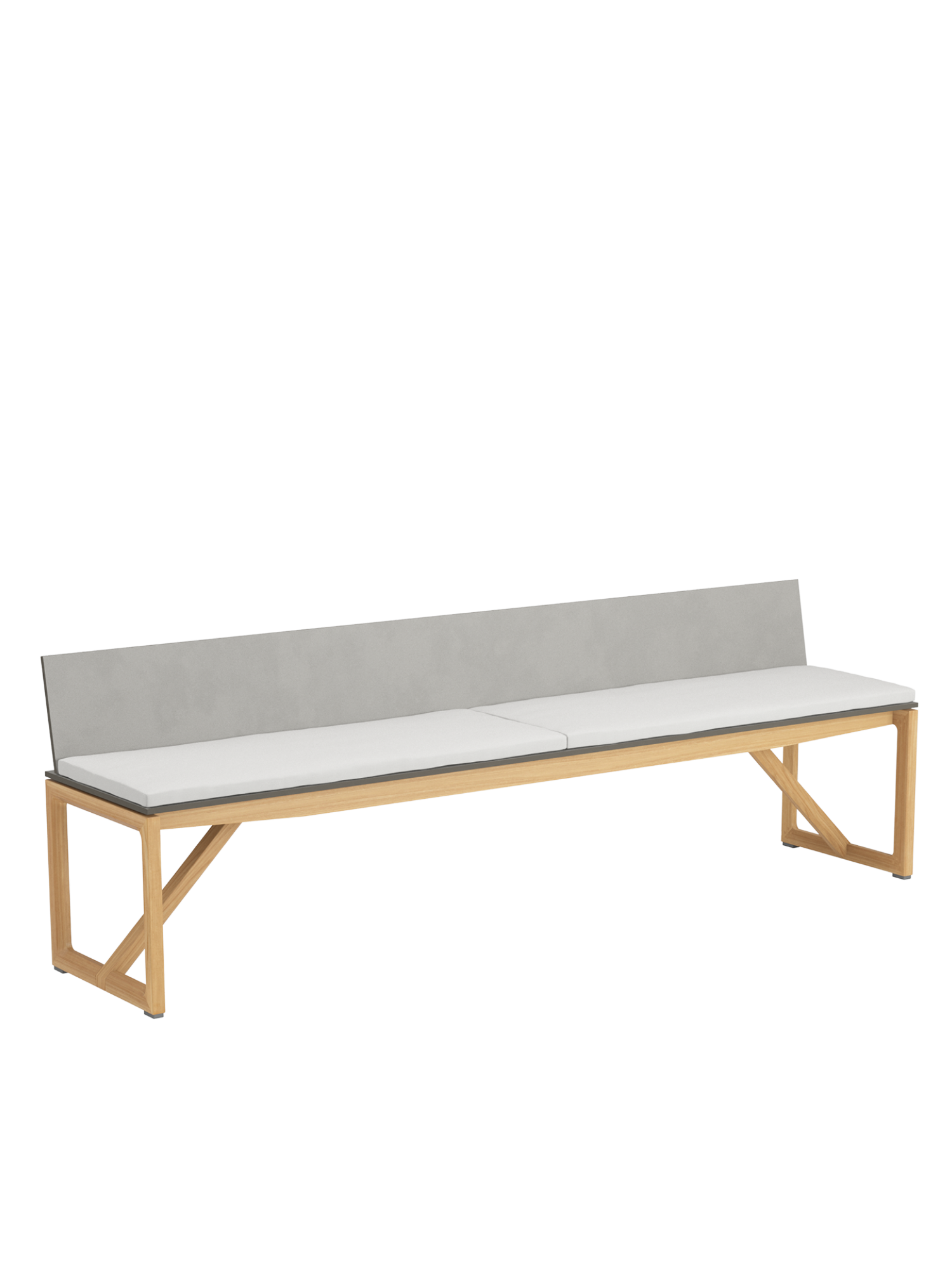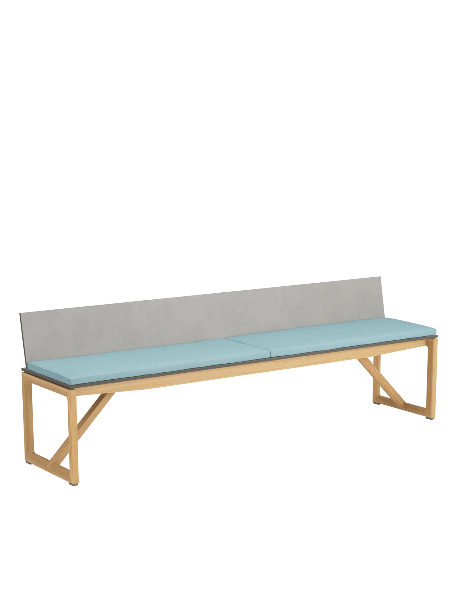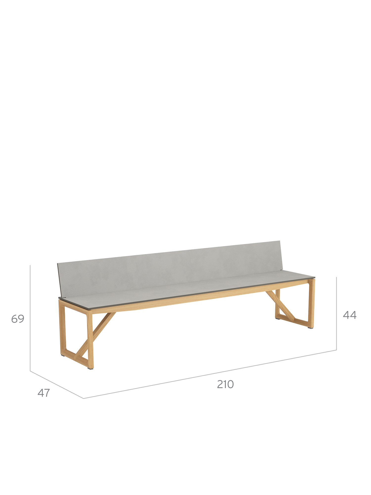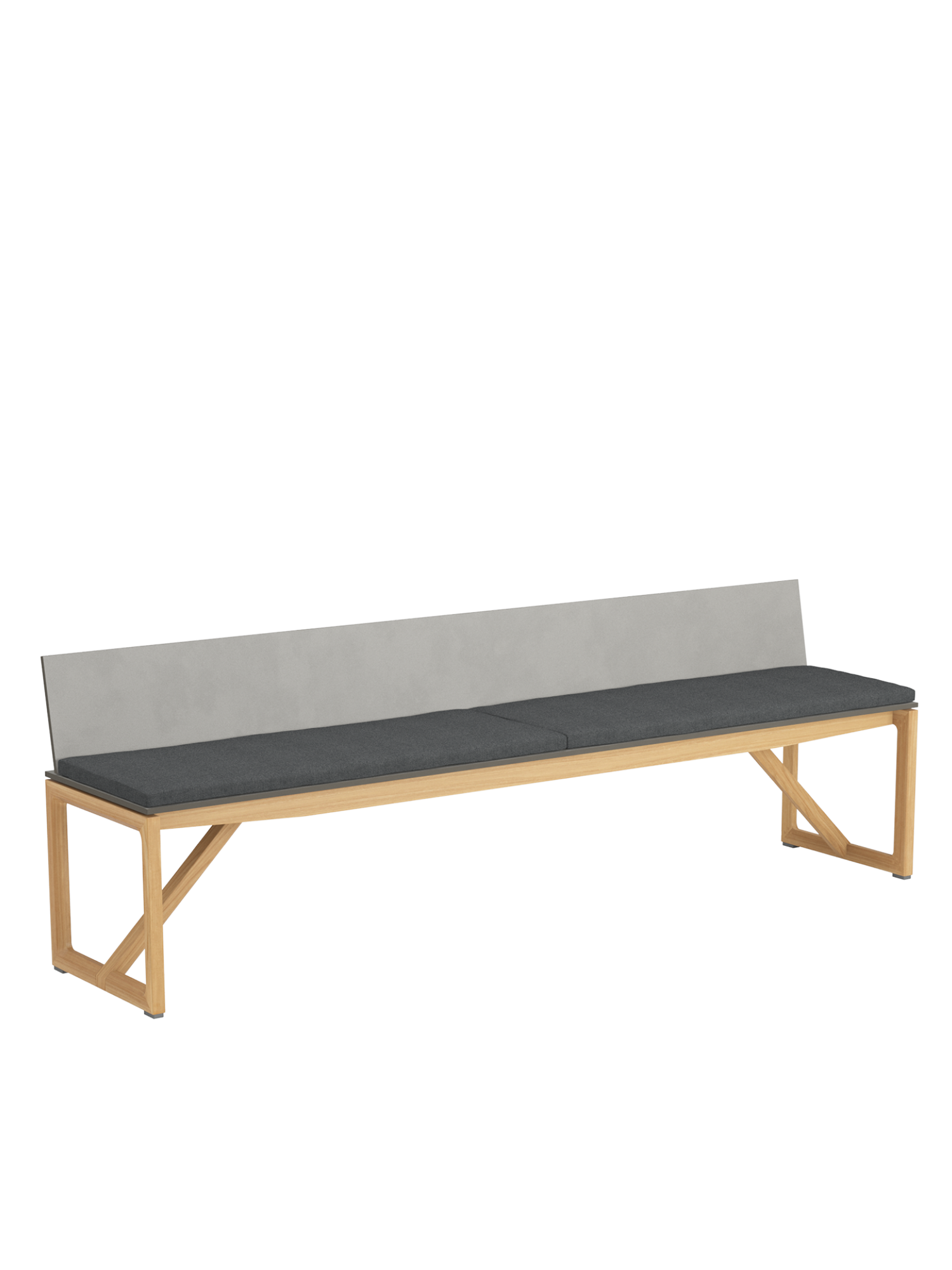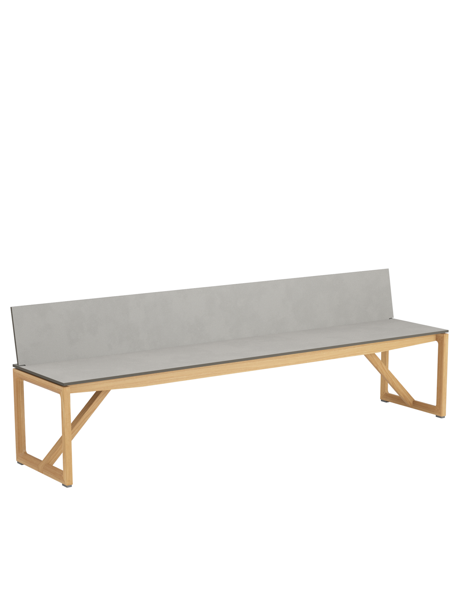 The benches of the series, with and without backrests, match the table with their combination of teak frames and synthetic resin tops. After convivial evenings or in the case of pouring rain, the benches disappear completely under the table and together, they create a compact block. The lightly structured and natural-looking grey surfaces made of synthetic resin, are up for anything. They are weather and UV-resistant, and are extremely easy to clean.