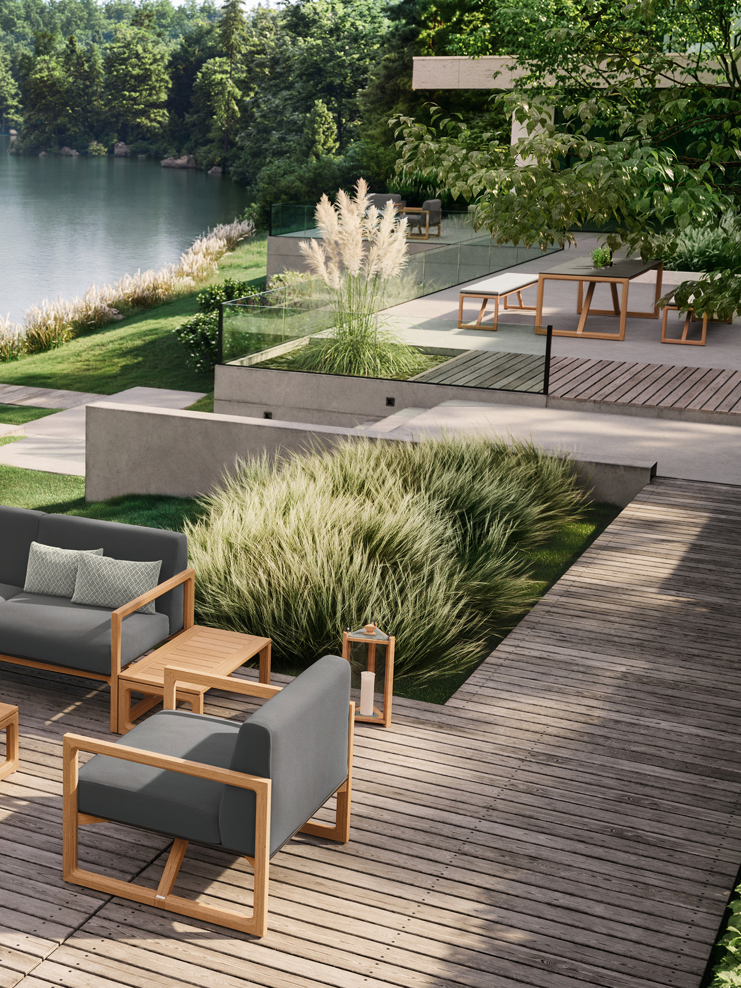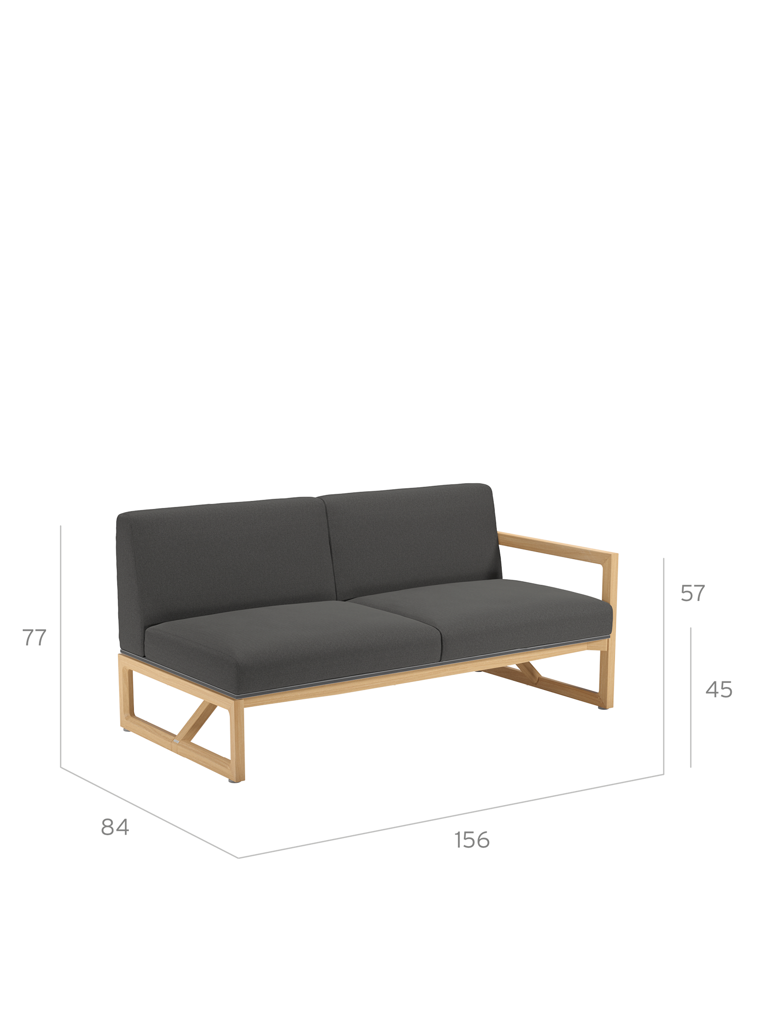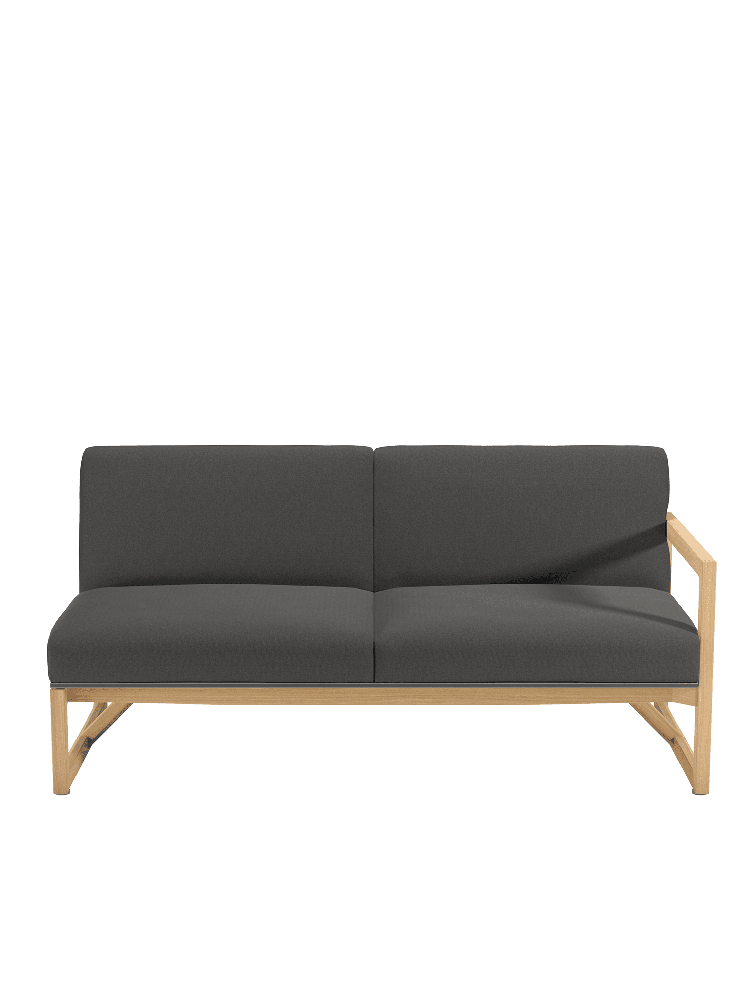 A distinctive teak frame supports opulent upholstery – together they provide excellent stability and promise luxurious wellbeing. The inviting sofa with an armrest on the left-hand side can be combined with any of the other upholstered furniture of the collection. The minimalist design of the sofa perfectly complements the Trey seating group. Merging together, the timeless dining and lounge furniture is inspiration for a holistic way of designing outdoor spaces – comfort that requires nothing more.