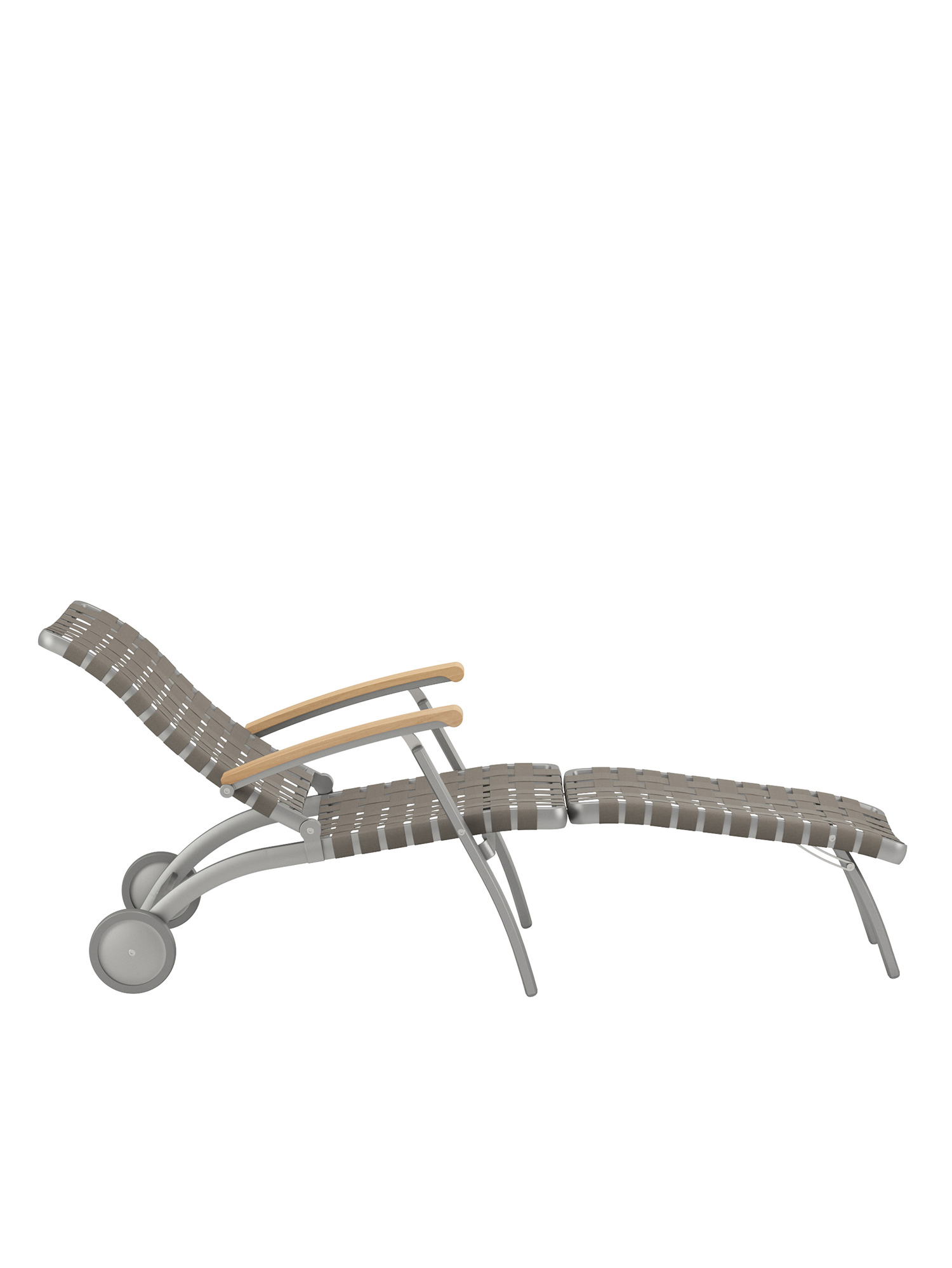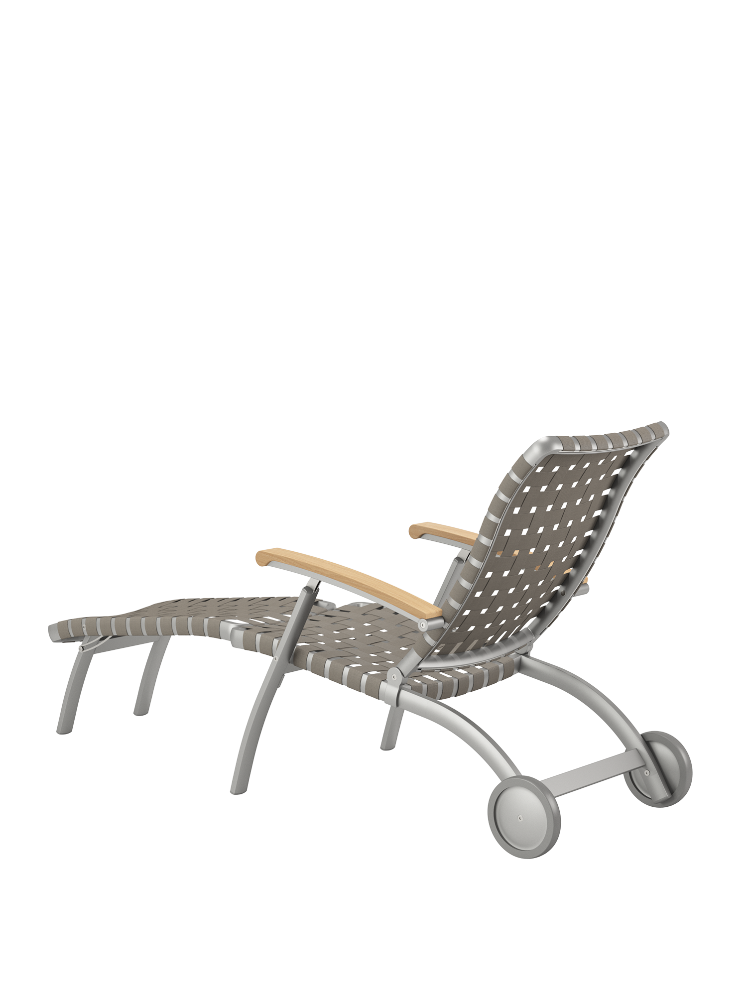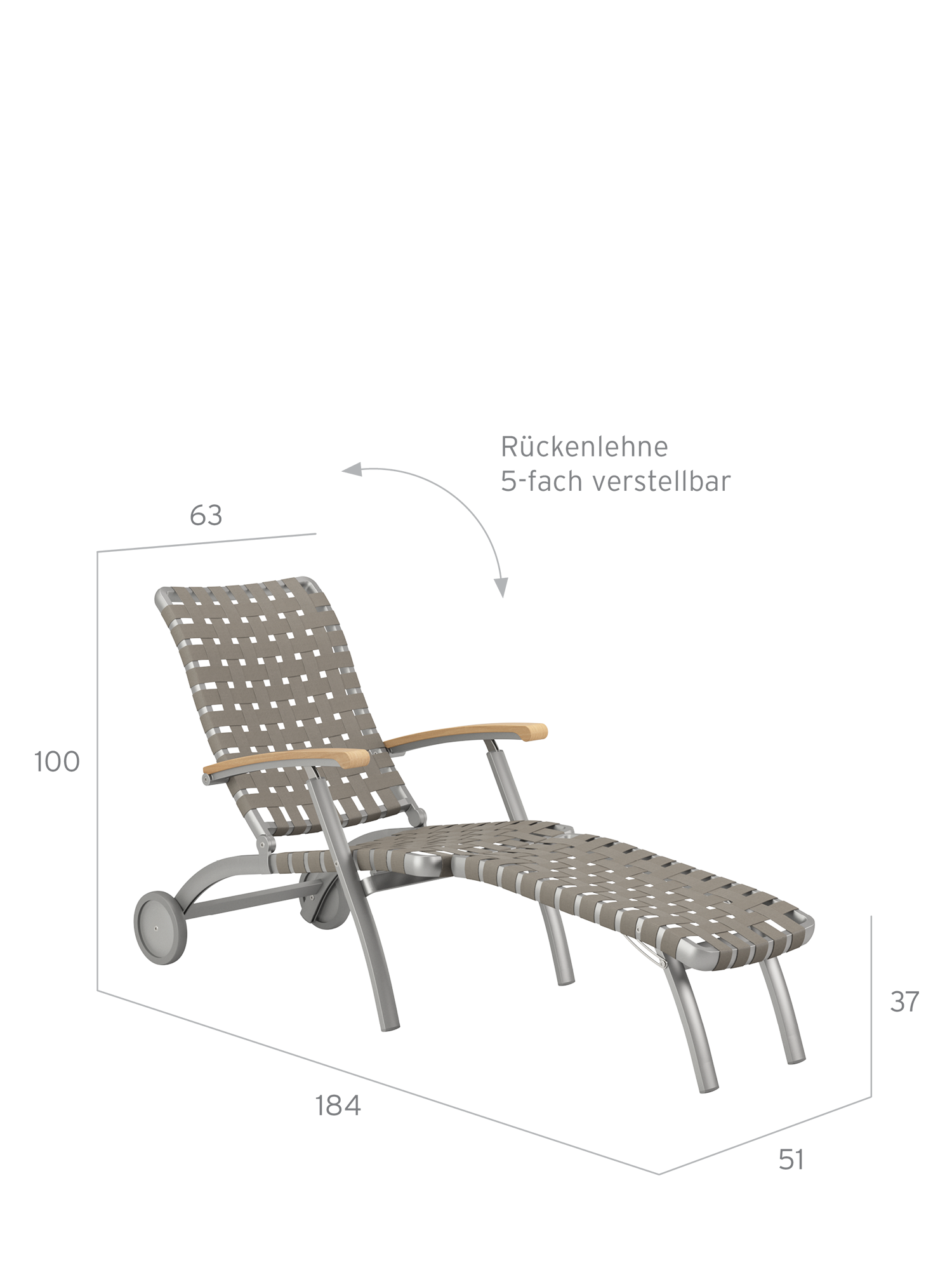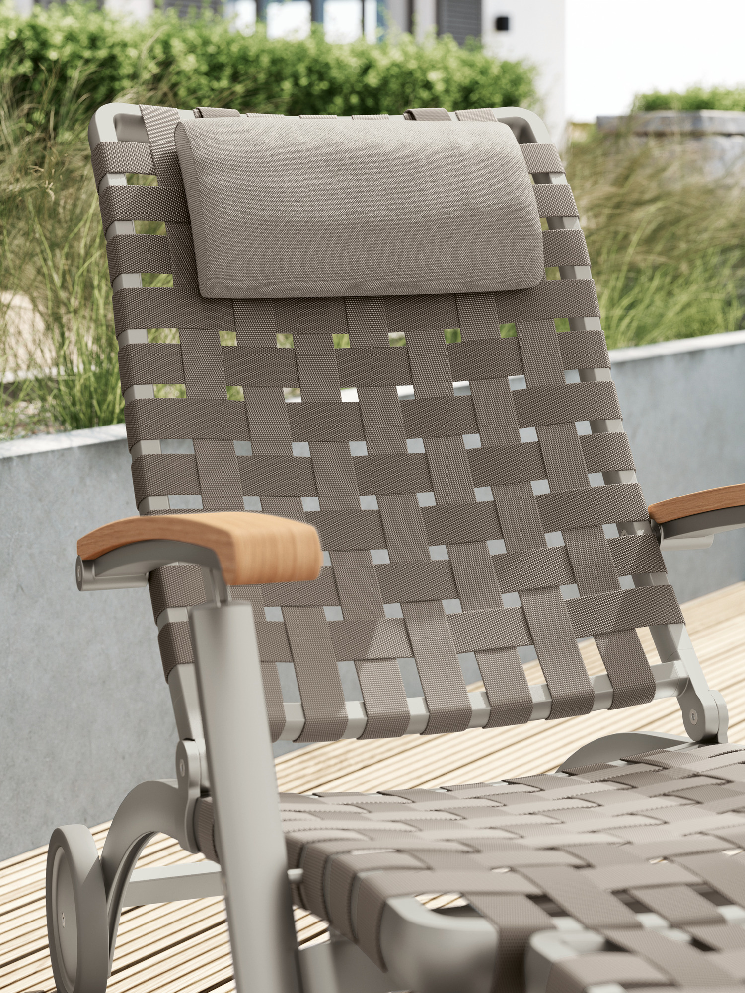 The new edition of the classic Deck Chair presents a silkily shimmering, anodised aluminium frame in combination with colour coordinated webbing weave: the frame and woven straps of the unique deck chair are securely joined together In an elaborate manufacturing process, ensuring resilient support and ergonomic comfort. Gently curved teak armrests are smoothly rounded, and with the long footrest, the Deck Chair is especially suitable for people taller than 1.80 metres. The backrest can be adjusted to five positions. A comfortable neck bolster in the colour Stone is included in the delivery.