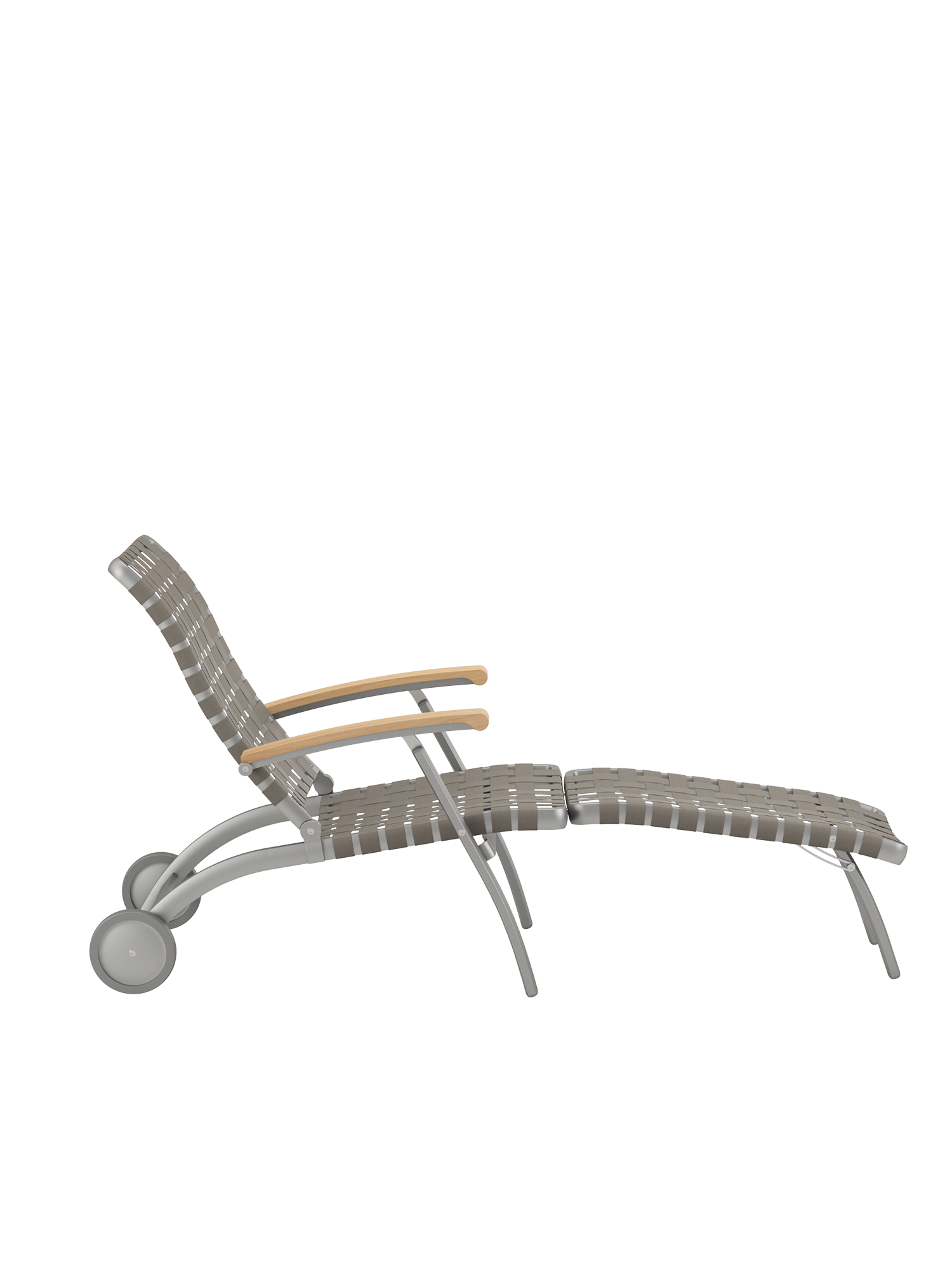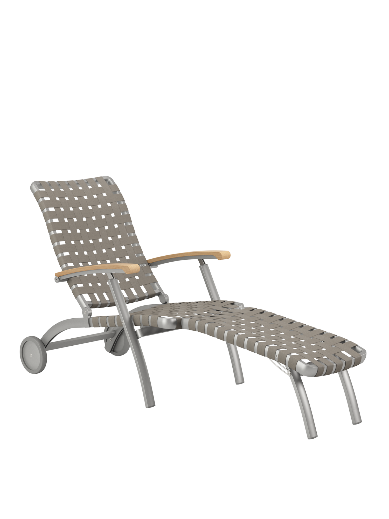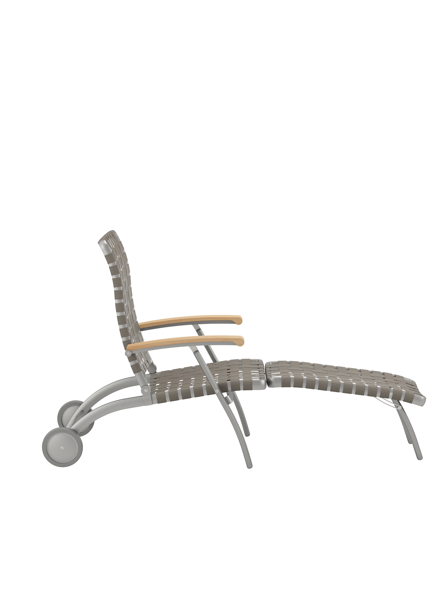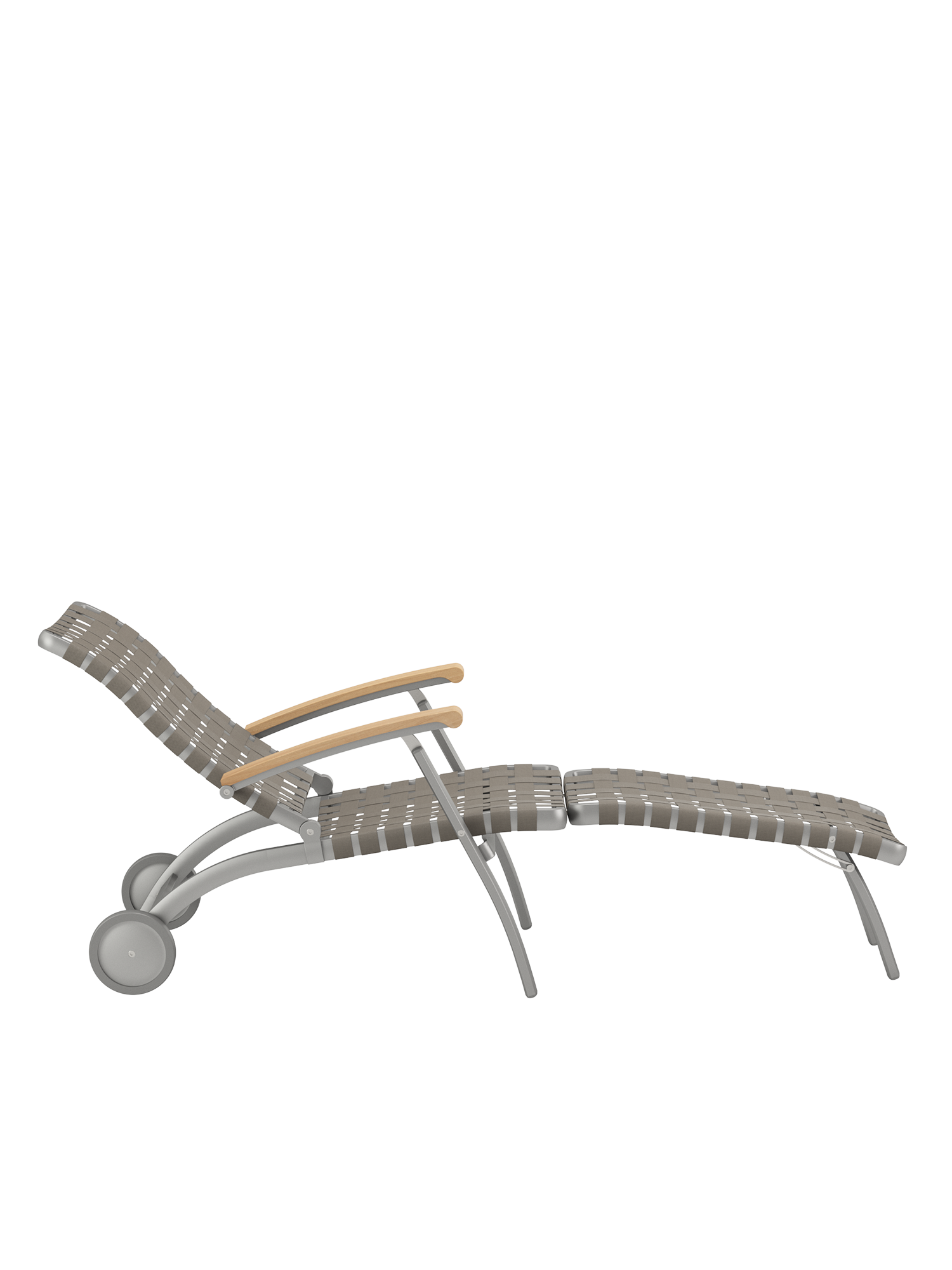 The new edition of the classic Deck Chair presents a silkily shimmering, anodised aluminium frame in combination with colour coordinated webbing weave: the frame and woven straps of the unique deck chair are securely joined together In an elaborate manufacturing process, ensuring resilient support and ergonomic comfort. Gently curved teak armrests are smoothly rounded, and with the long footrest, the Deck Chair is especially suitable for people taller than 1.80 metres. The backrest can be adjusted to five positions. A comfortable neck bolster in the colour Stone is included in the delivery.