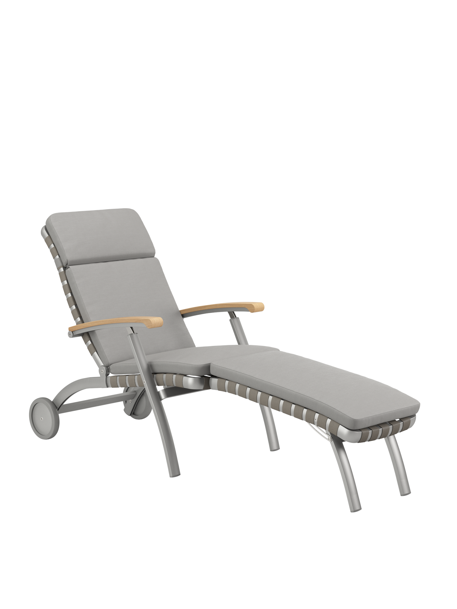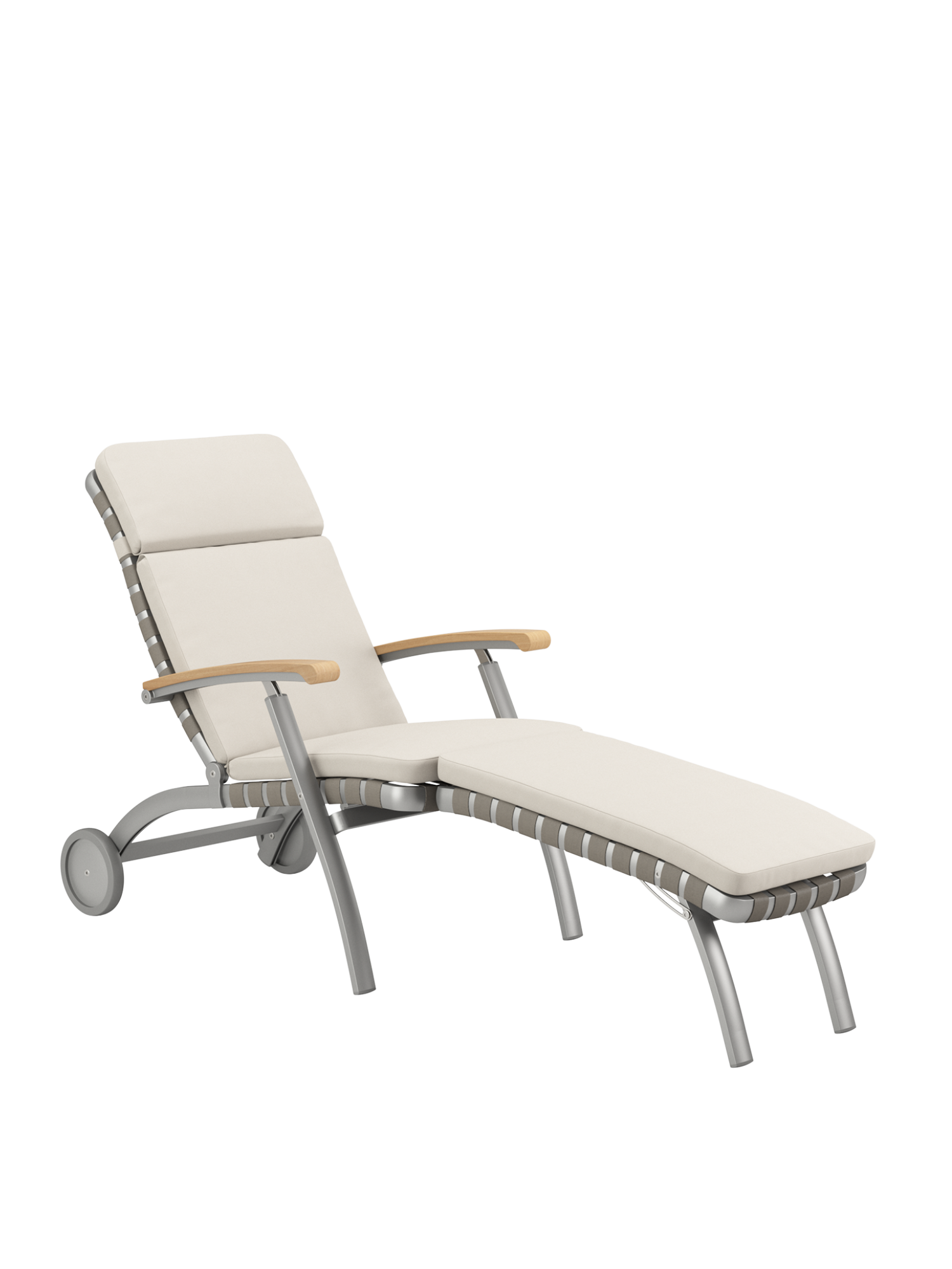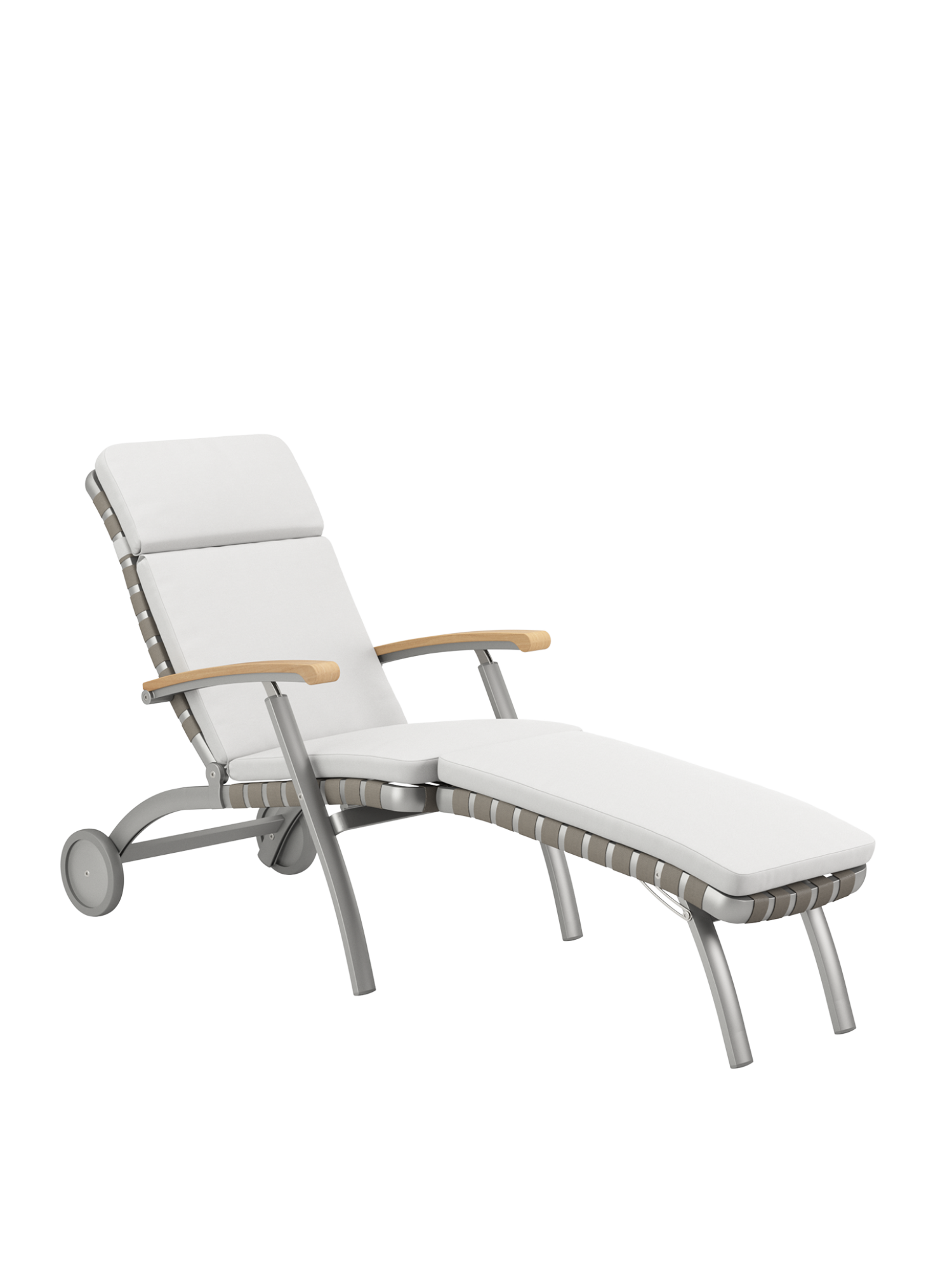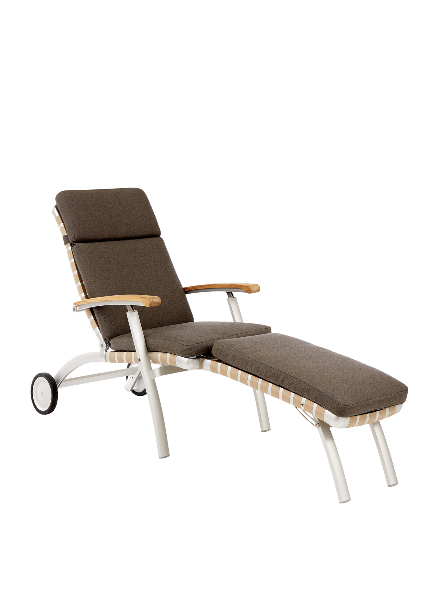 The anodised aluminium frame of the deck chair traces an elegant curve. The webbing weave is attached practically invisibly to the frame using a unique and elaborate technique which maintains a pleasant support and ergonomic comfort. Gently curving armrests of teak are pleasant to the touch. The longer footrest is a welcome detail providing additional comfort for people taller than 6 feet. The backrest of the deck chair is adjustable to six positions. The chair is delivered with a comfortable neck bolster in the colour Pearl.