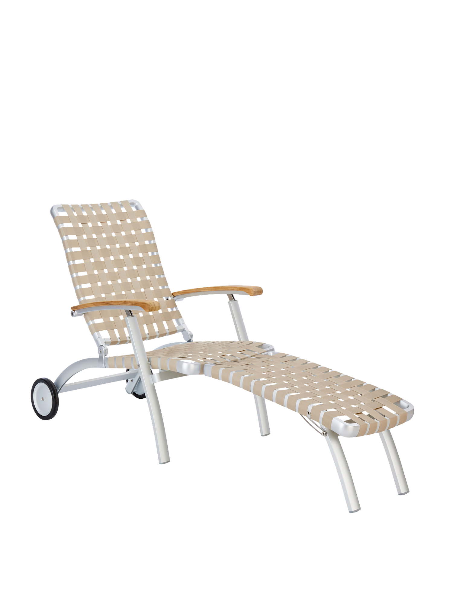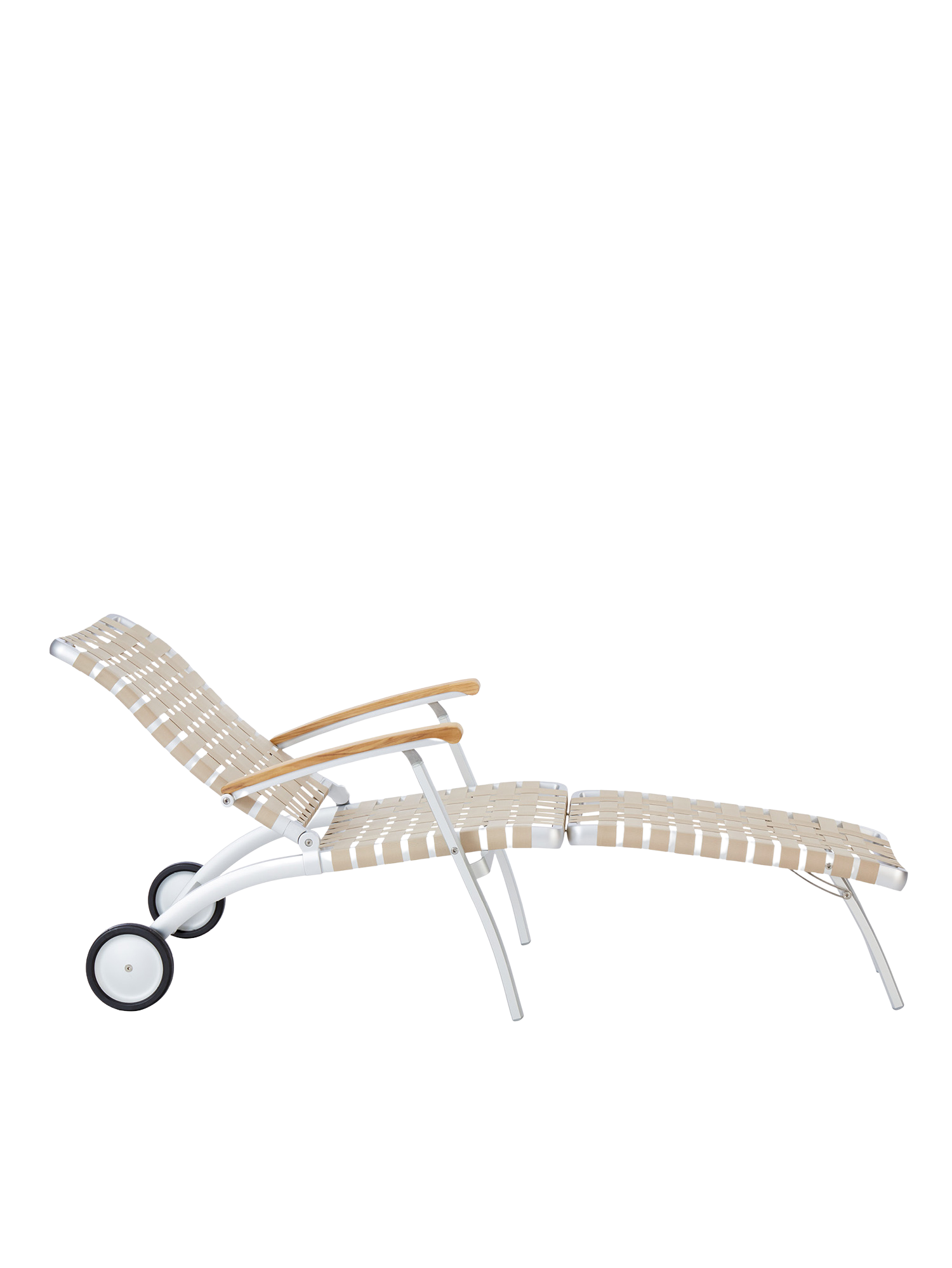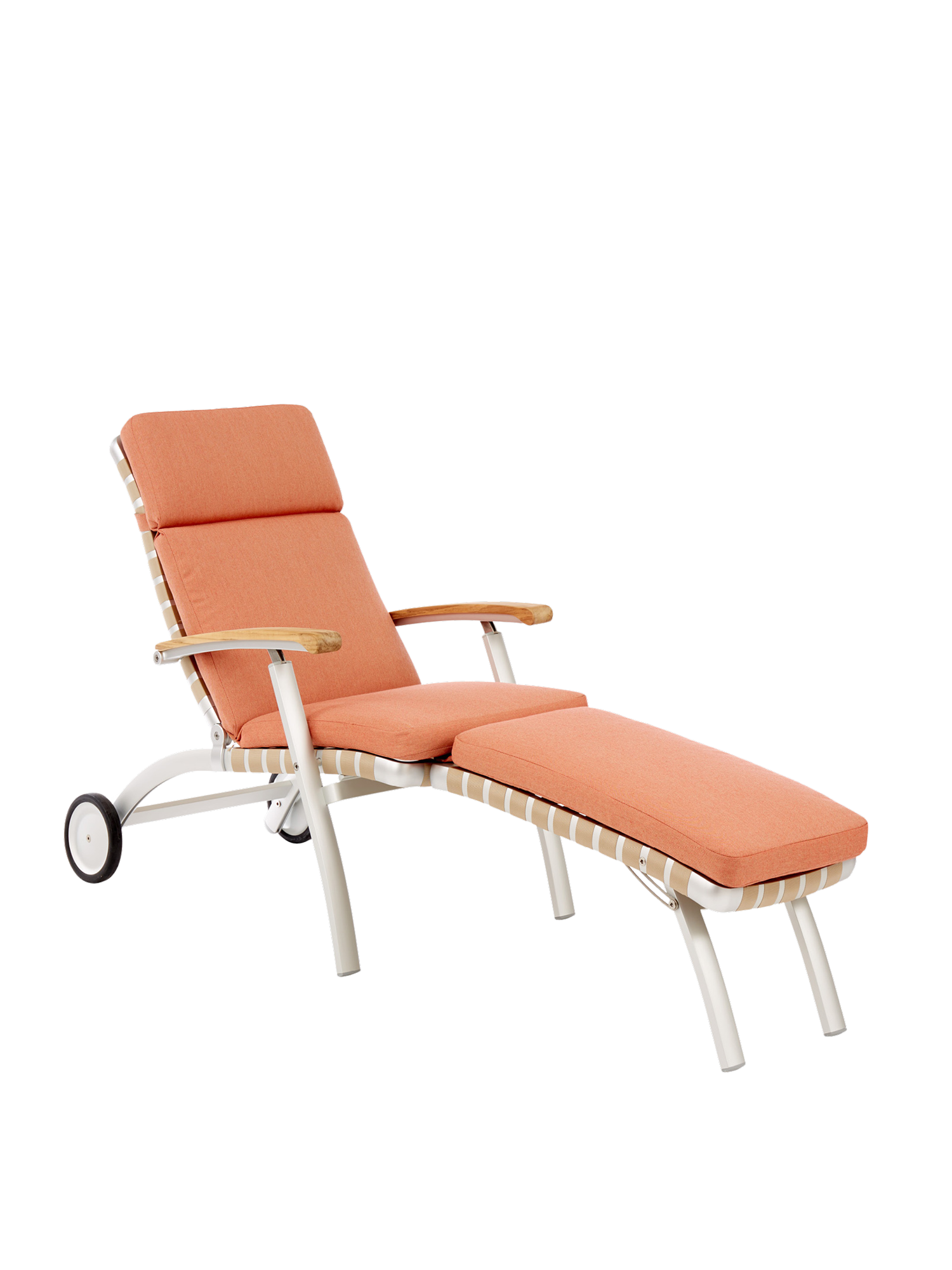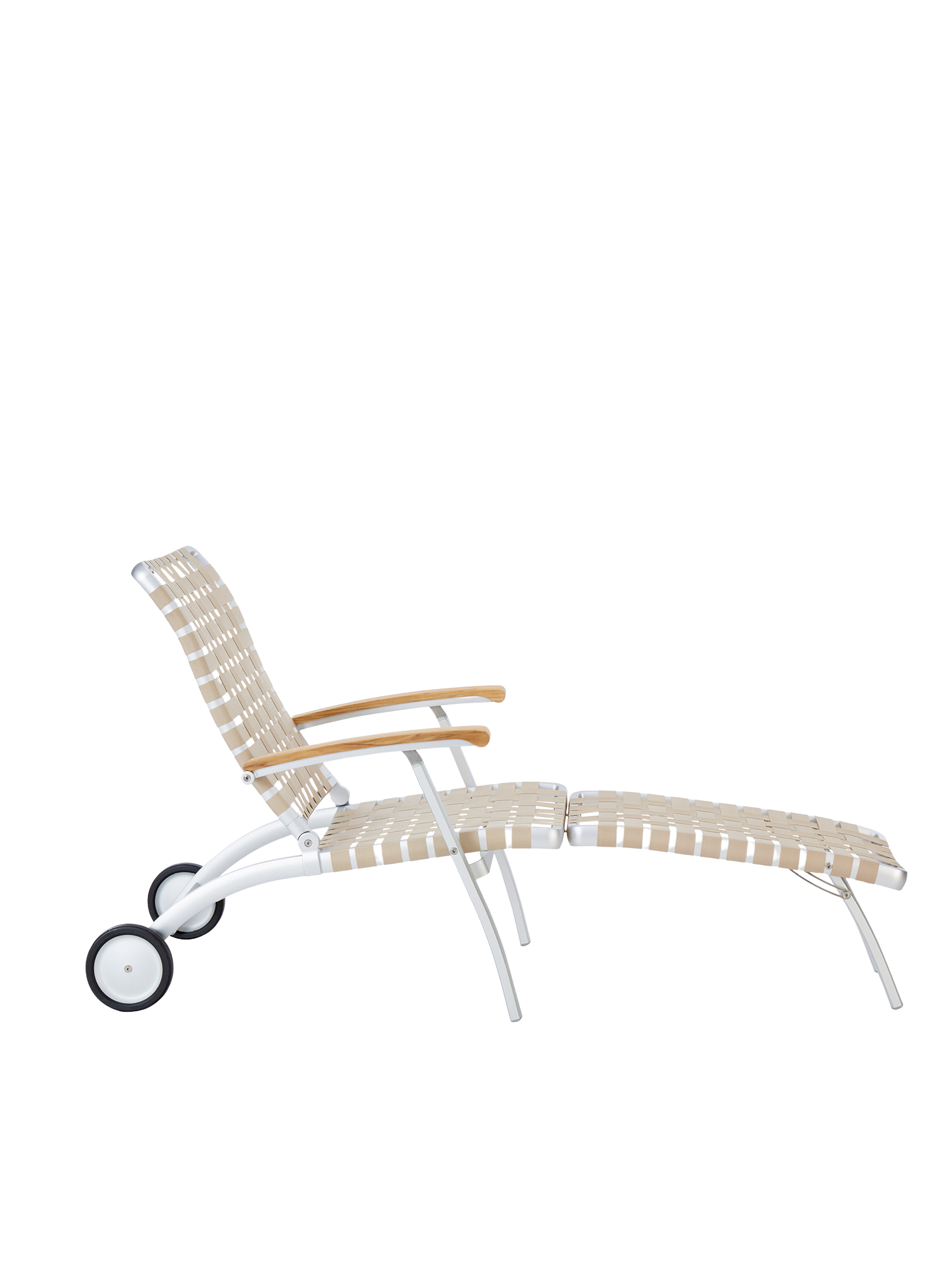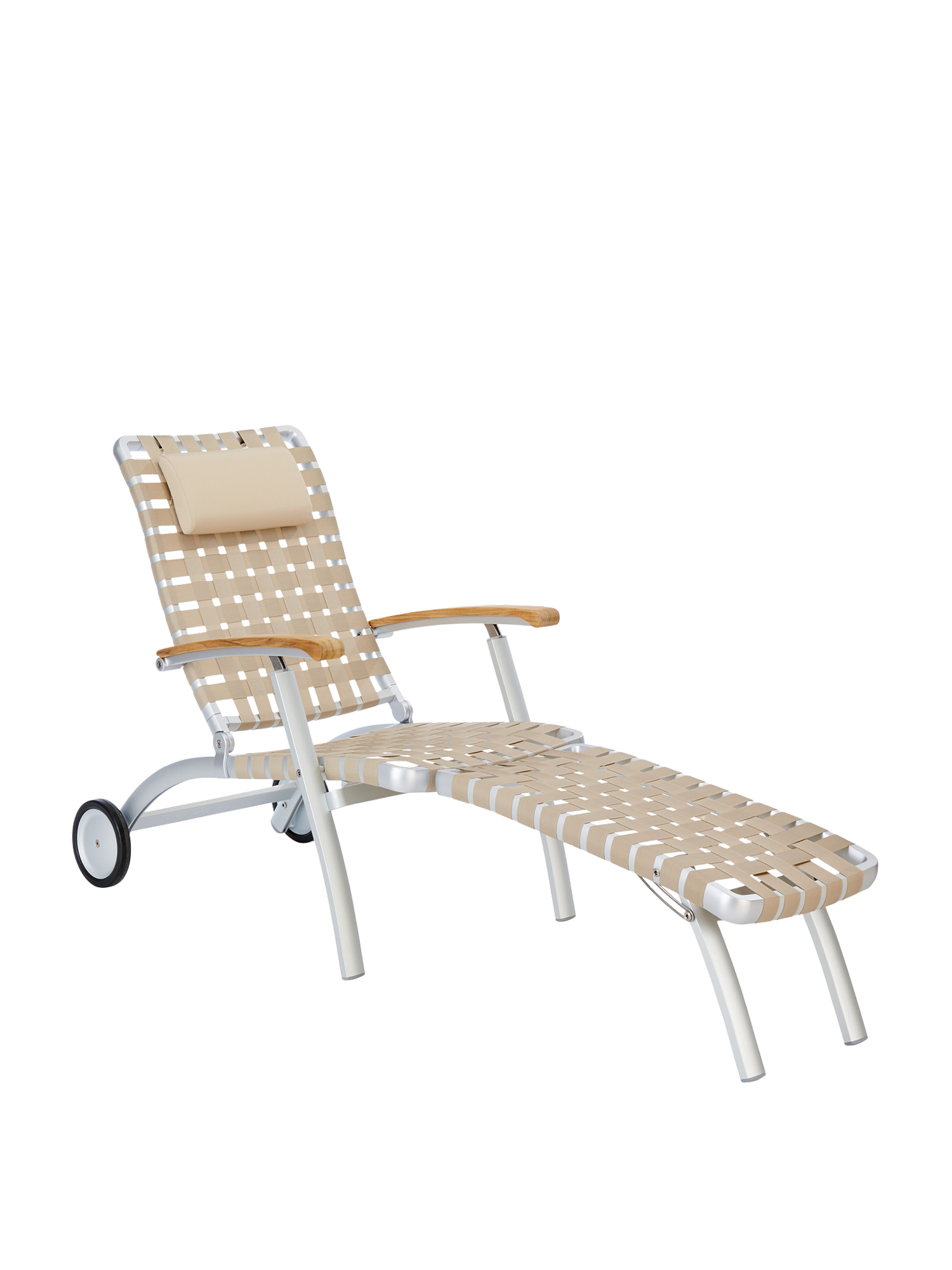 The anodised aluminium frame of the deck chair traces an elegant curve. The webbing weave is attached practically invisibly to the frame using a unique and elaborate technique which maintains a pleasant support and ergonomic comfort. Gently curving armrests of teak are pleasant to the touch. The longer footrest is a welcome detail providing additional comfort for people taller than 6 feet. The backrest of the deck chair is adjustable to six positions. The chair is delivered with a comfortable neck bolster in the colour Pearl.