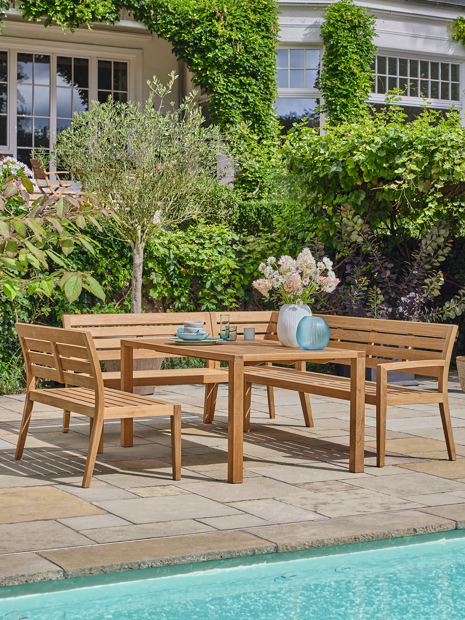 As a connecting element in the Valencia corner module or as a solitaire – the Valencia bench without armrests invites you to take a seat. When used in the classic way as a garden bench, it promises comfortable interludes outdoors. As part of the modular system, it evokes delightful memories of past times. The Valencia corner seat made of high-quality teak gathers together lively rounds at matching tables – and ensures that new memories are held fast.