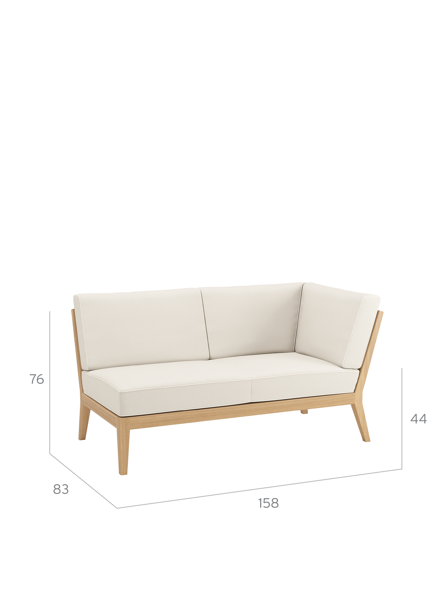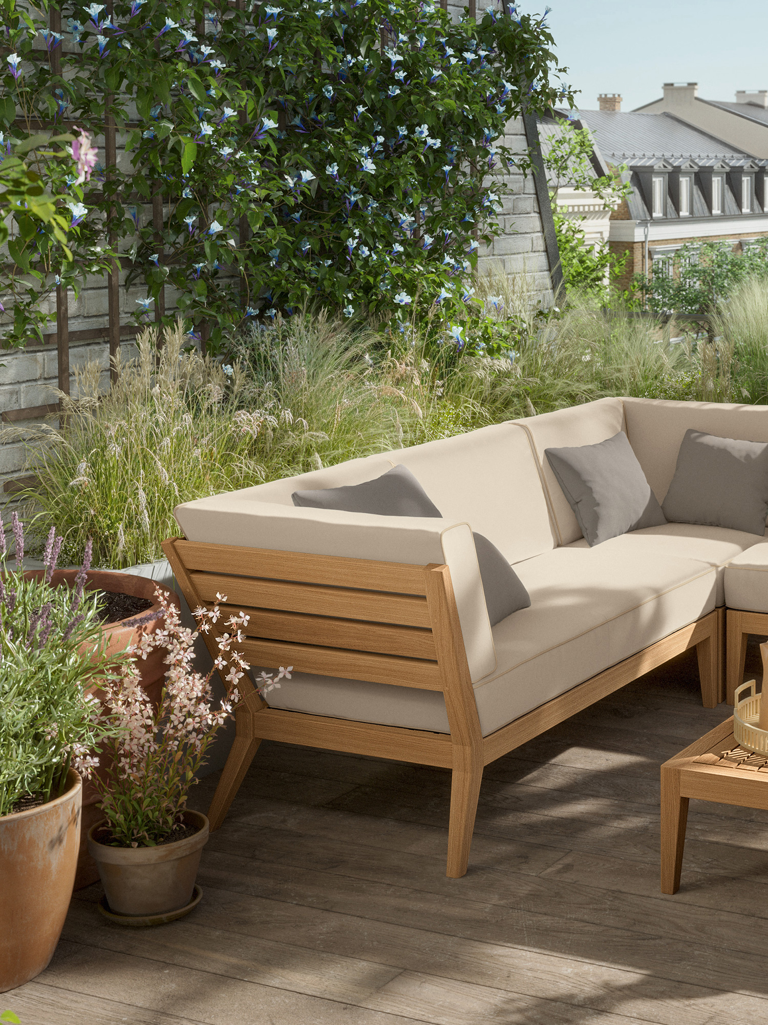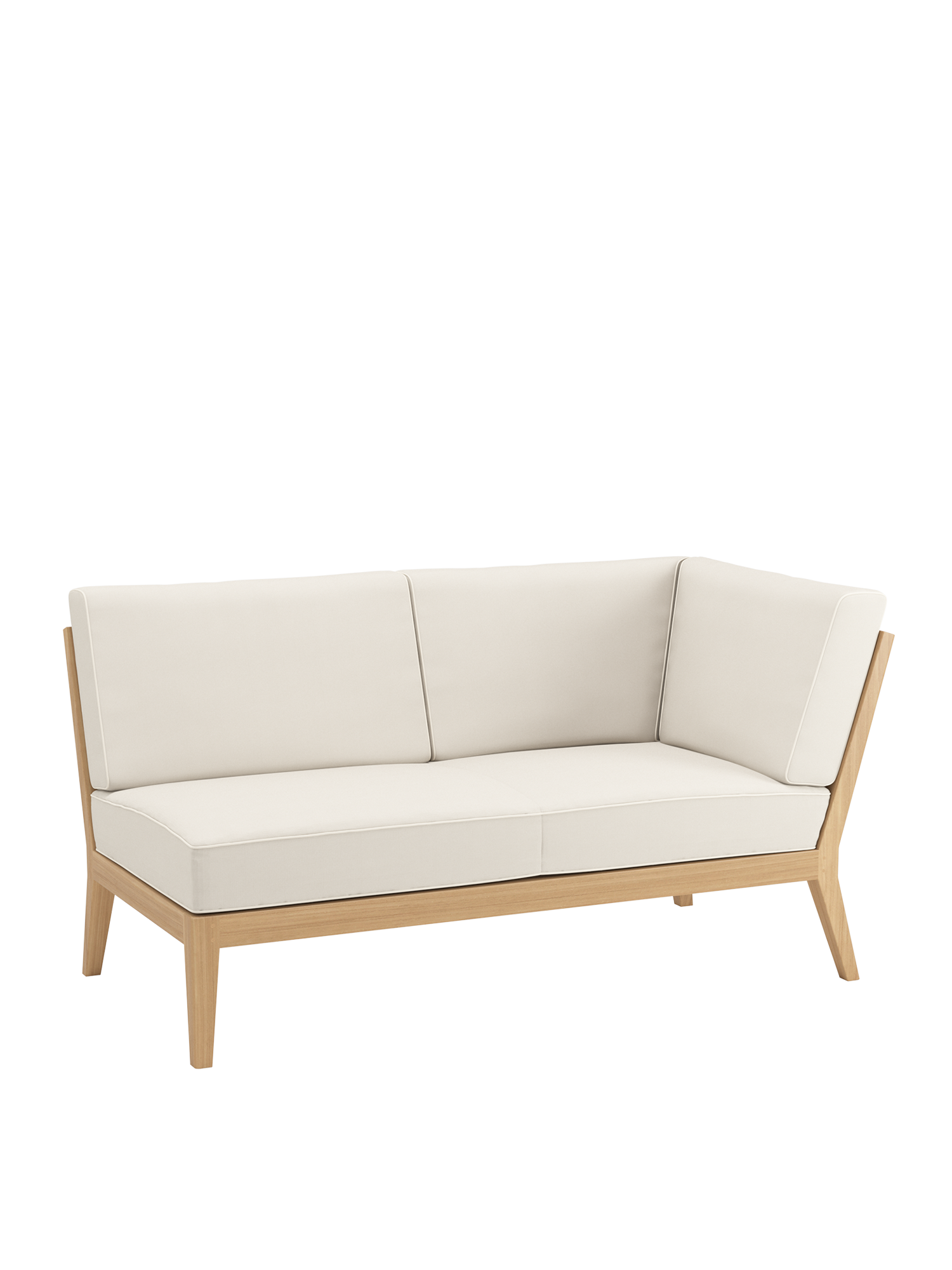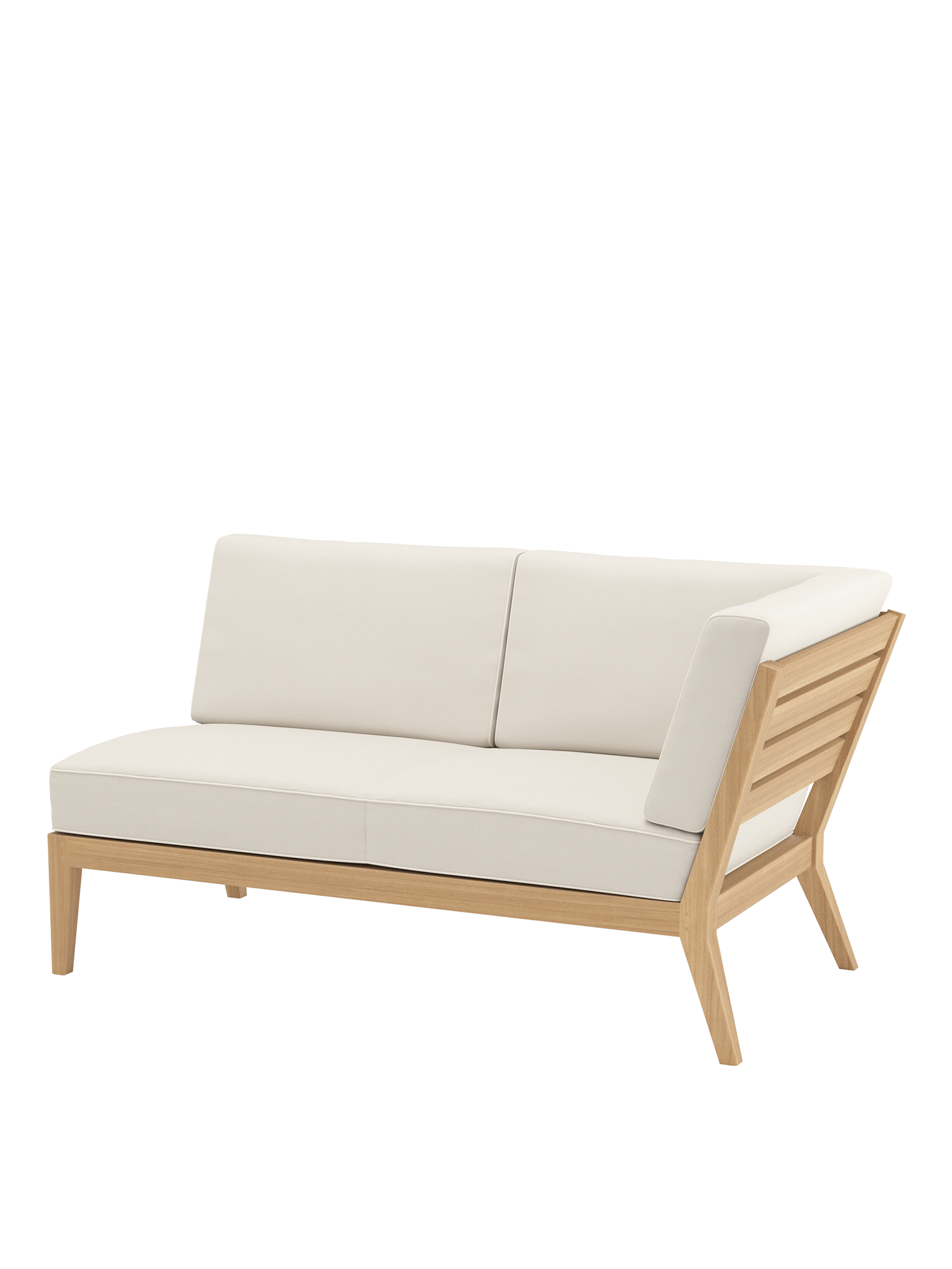 At the side of the pool or edge of the terrace, on a city balcony or in the middle of the garden: the elements of the Valencia lounge furniture create an oasis of tranquillity in every airy location of adequate size. Extra wide and especially deep, chaise longues, middle elements and corner modules made of teak with angled legs, and transversely aligned seat and backrest slats, offer plenty of space for relaxing. Thick upholstery with welted seams and feather cushions in fresh colours set summery accents.