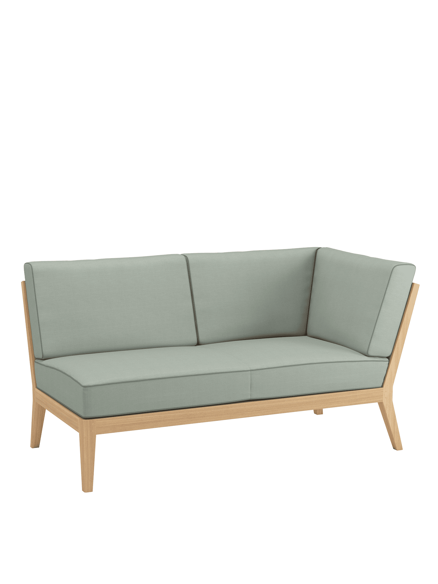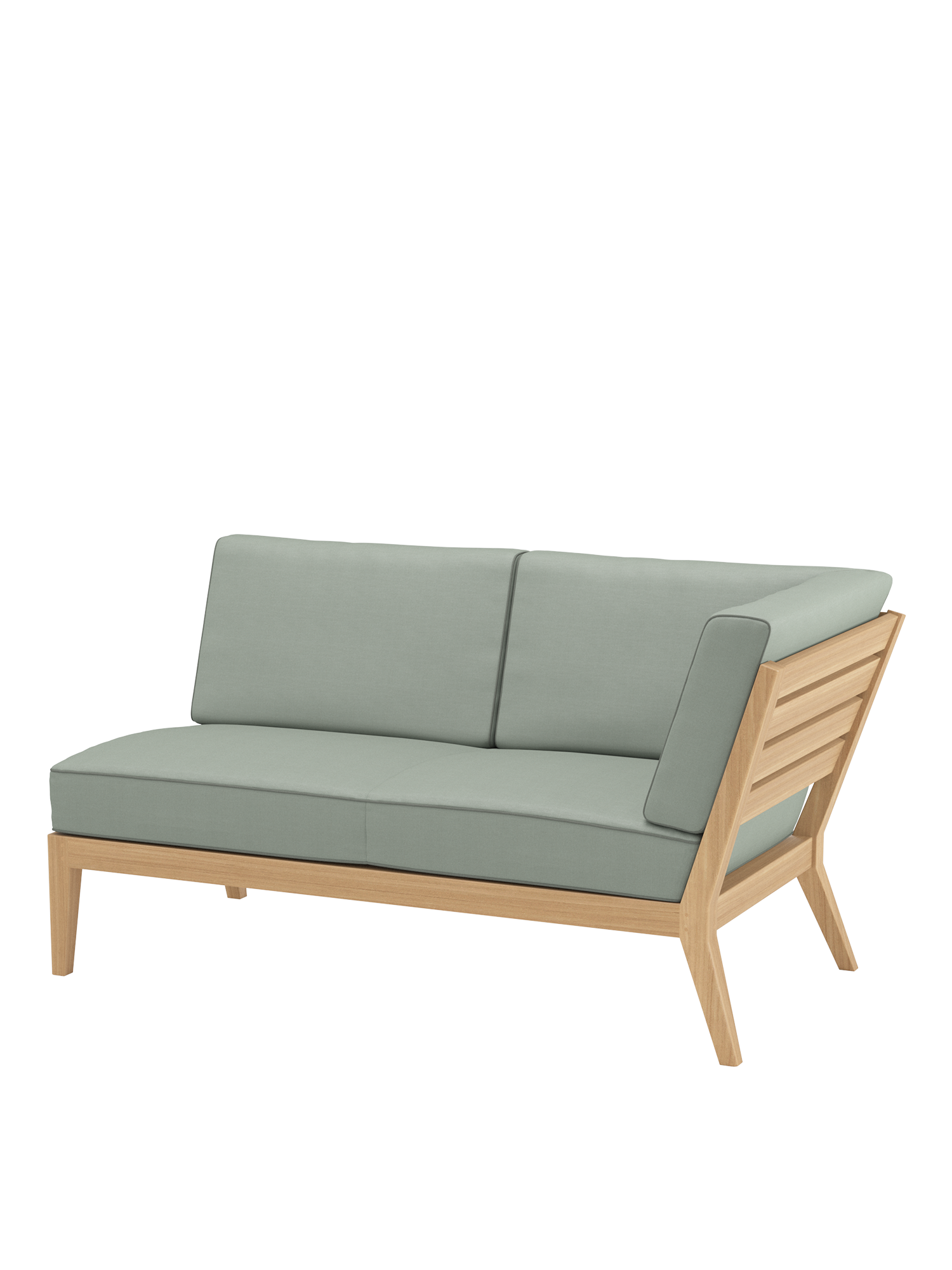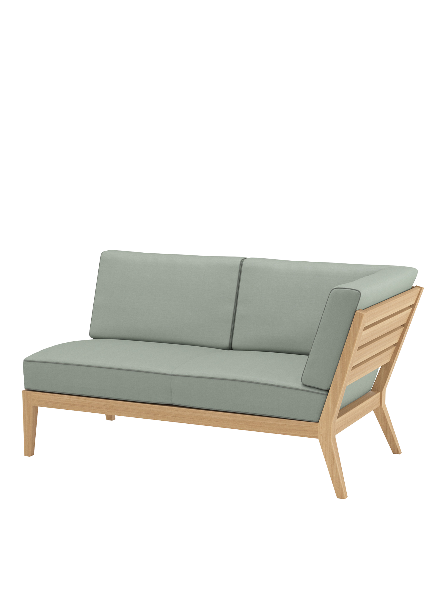 At the side of the pool or edge of the terrace, on a city balcony or in the middle of the garden: the elements of the Valencia lounge furniture create an oasis of tranquillity in every airy location of adequate size. Extra wide and especially deep, chaise longues, middle elements and corner modules made of teak with angled legs, and transversely aligned seat and backrest slats, offer plenty of space for relaxing. Thick upholstery with welted seams and feather cushions in fresh colours set summery accents.