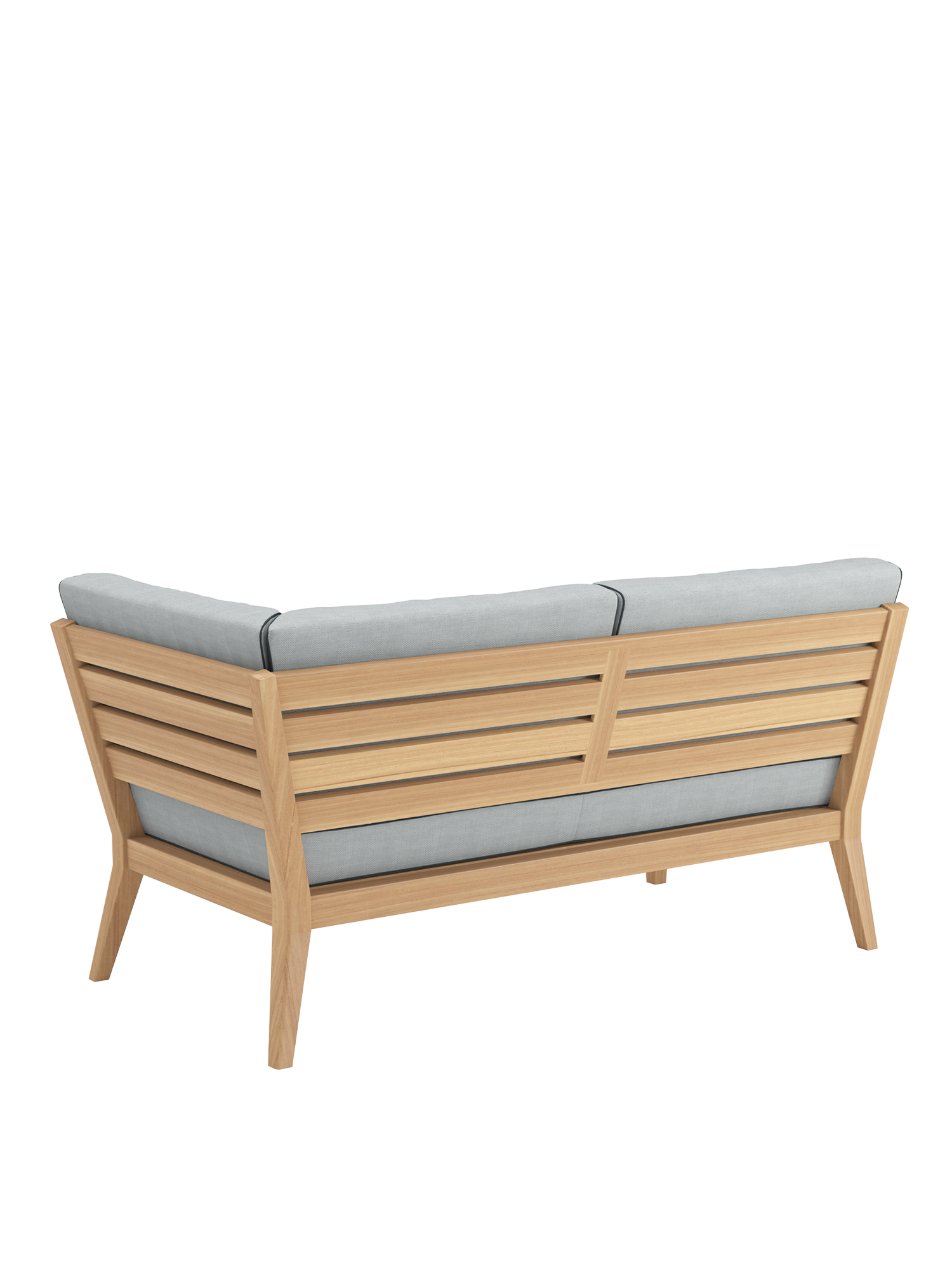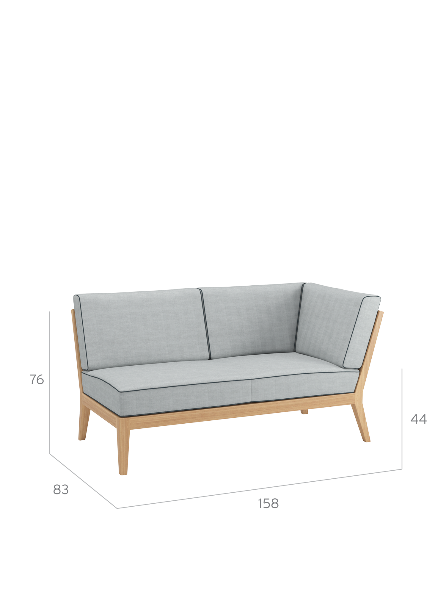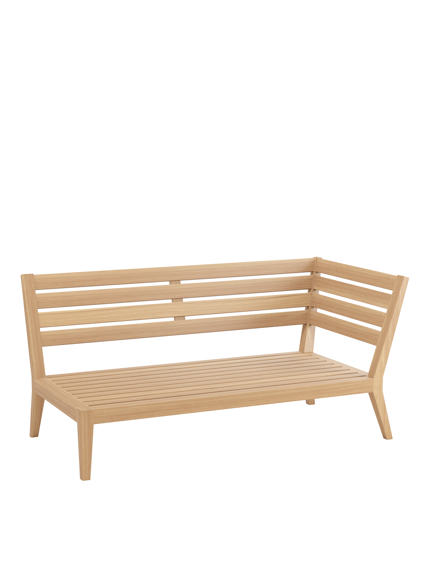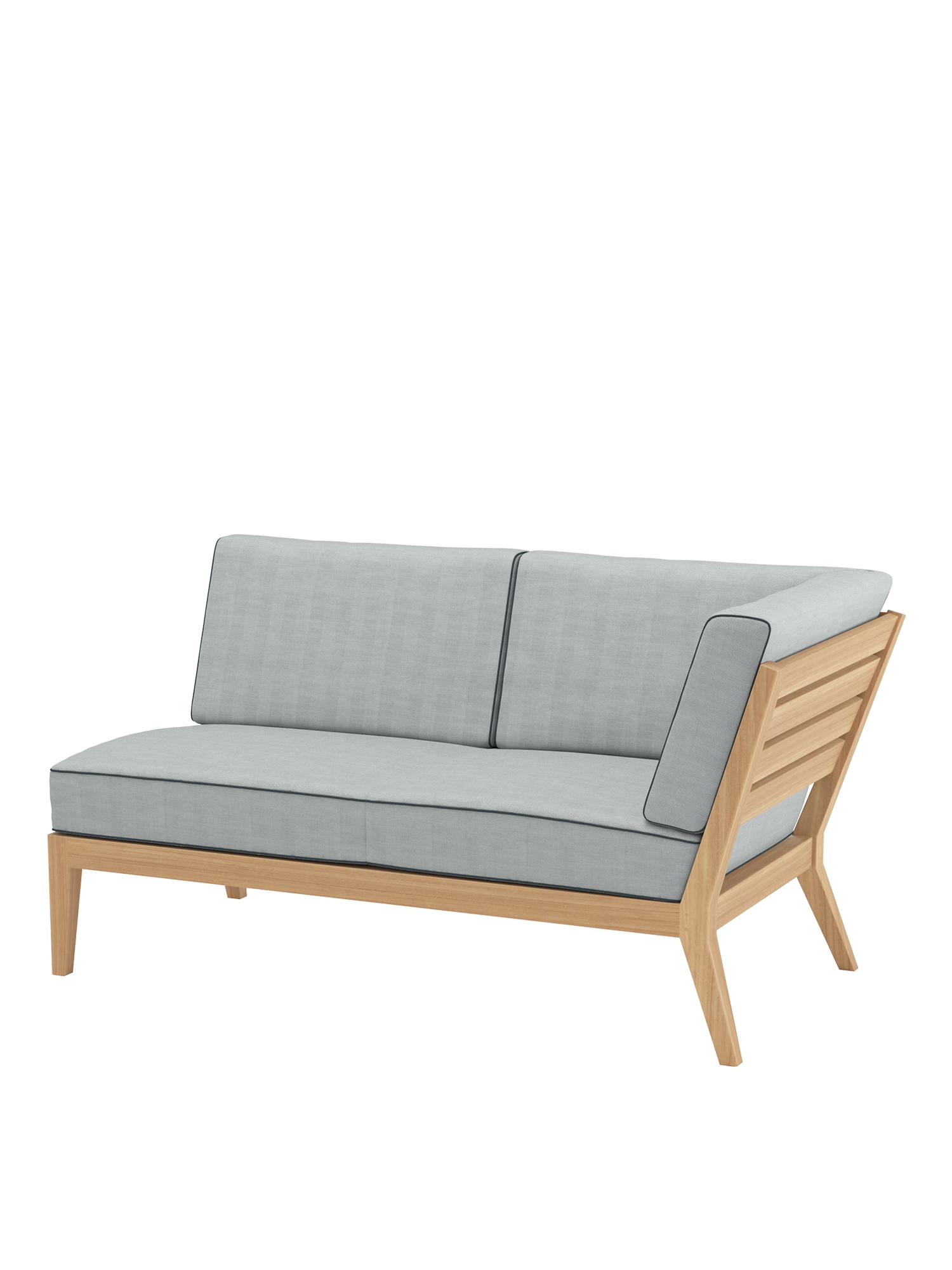 At the side of the pool or edge of the terrace, on a city balcony or in the middle of the garden: the elements of the Valencia lounge furniture create an oasis of tranquillity in every airy location of adequate size. Extra wide and especially deep, chaise longues, middle elements and corner modules made of teak with angled legs, and transversely aligned seat and backrest slats, offer plenty of space for relaxing. Thick upholstery with welted seams and feather cushions in fresh colours set summery accents.