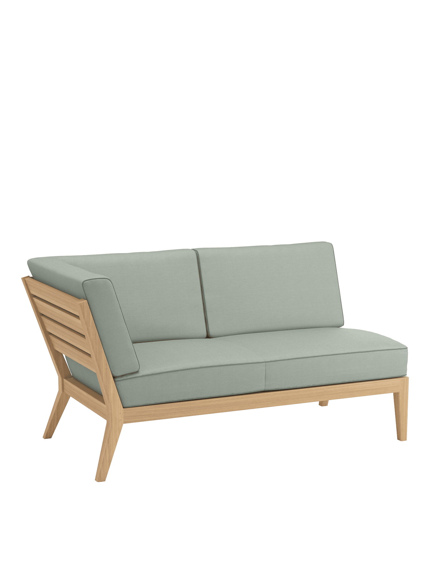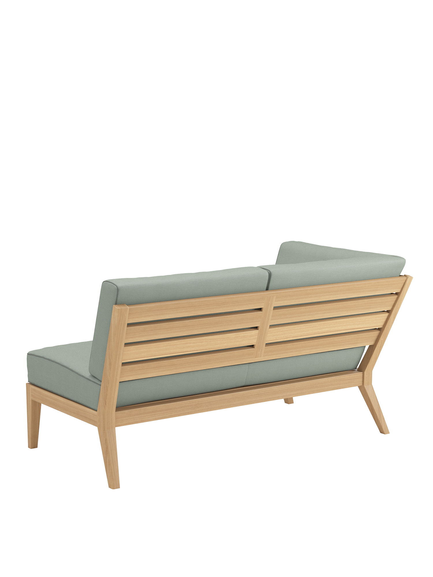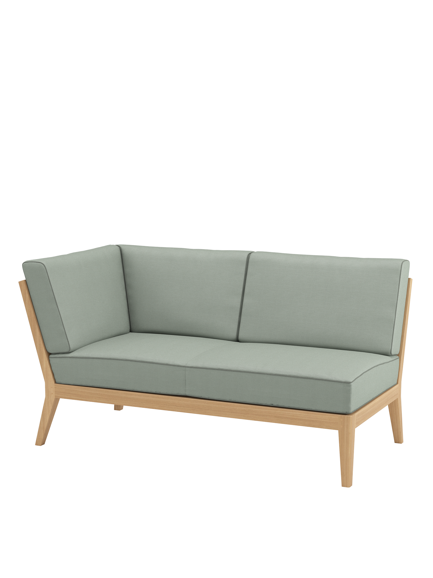 At the side of the pool or edge of the terrace, on a city balcony or in the middle of the garden: the elements of the Valencia lounge furniture create an oasis of tranquillity in every airy location of adequate size. Extra wide and especially deep, chaise longues, middle elements and corner modules made of teak with angled legs, and transversely aligned seat and backrest slats, offer plenty of space for relaxing. Thick upholstery with welted seams and feather cushions in fresh colours set summery accents.