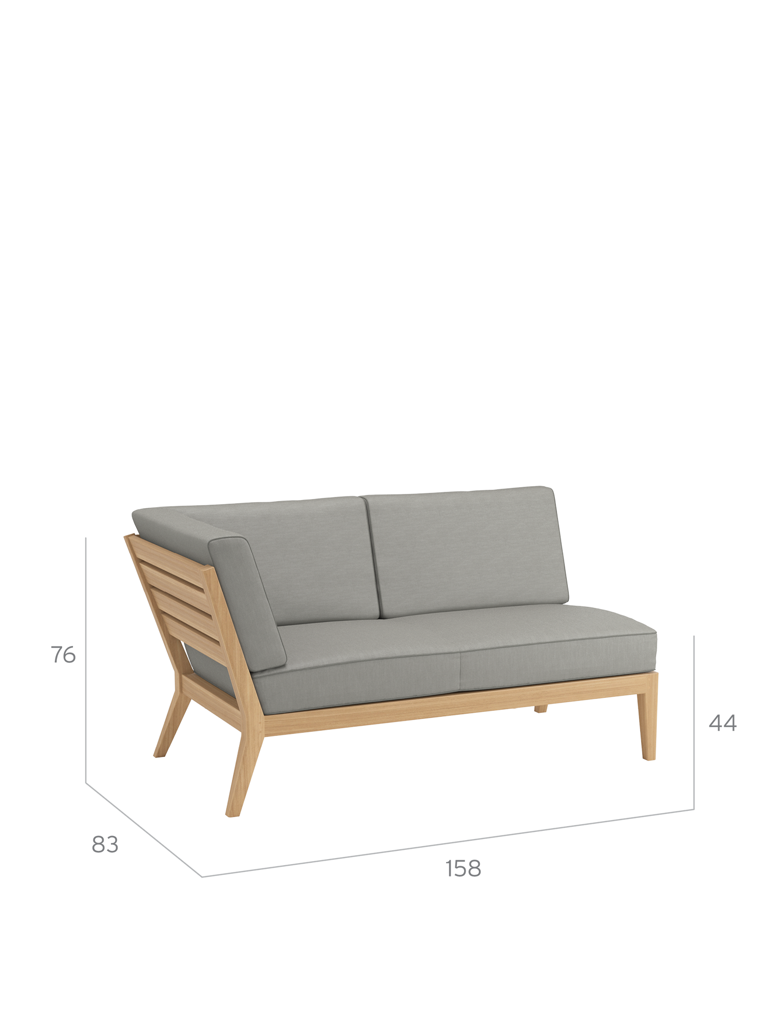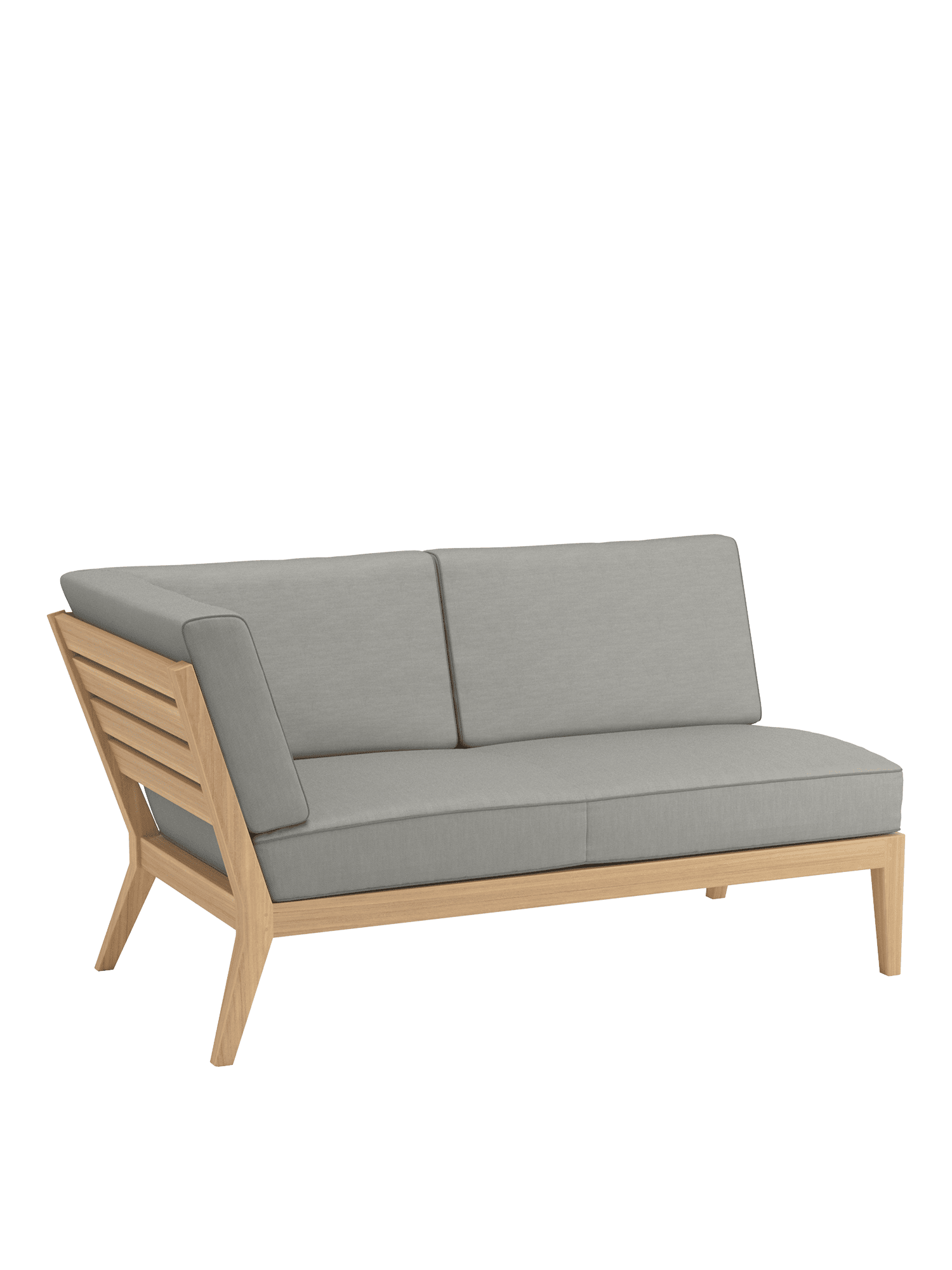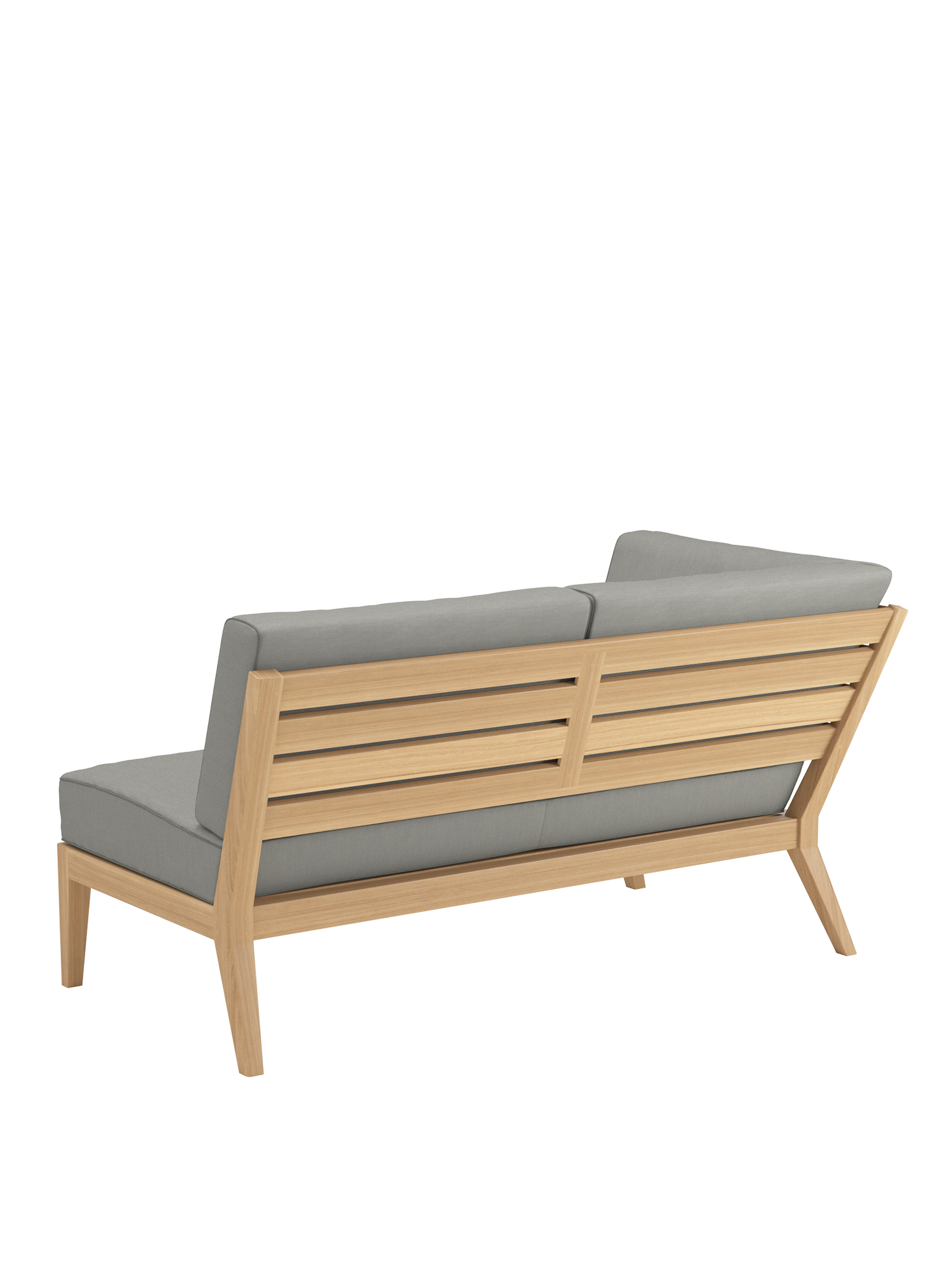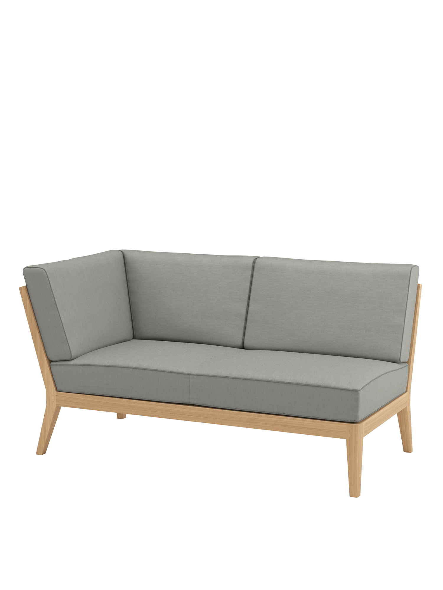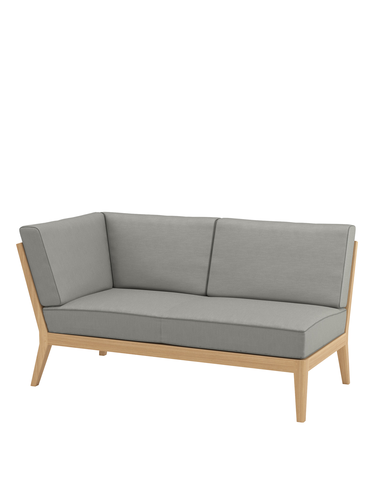At the side of the pool or edge of the terrace, on a city balcony or in the middle of the garden: the elements of the Valencia lounge furniture create an oasis of tranquillity in every airy location of adequate size. Extra wide and especially deep, chaise longues, middle elements and corner modules made of teak with angled legs, and transversely aligned seat and backrest slats, offer plenty of space for relaxing. Thick upholstery with welted seams and feather cushions in fresh colours set summery accents.