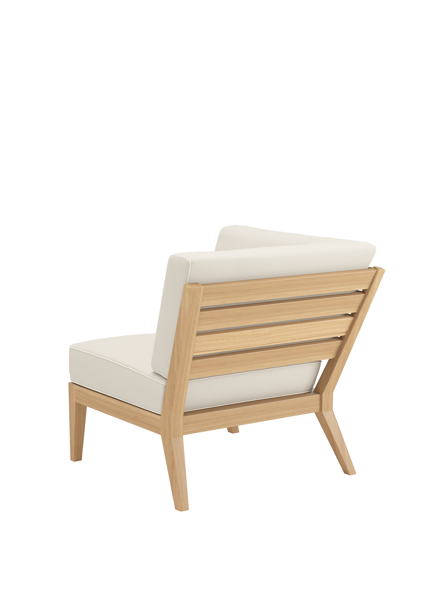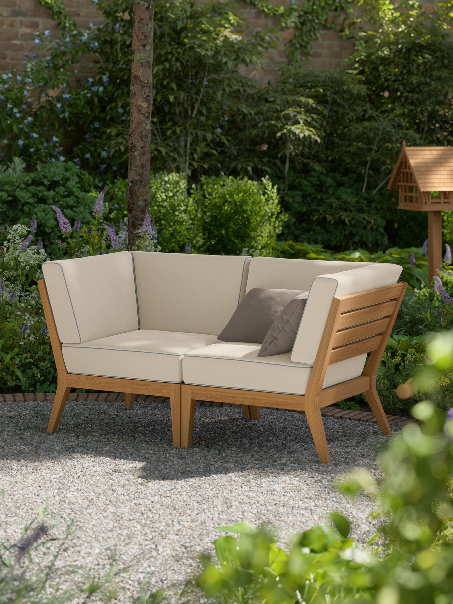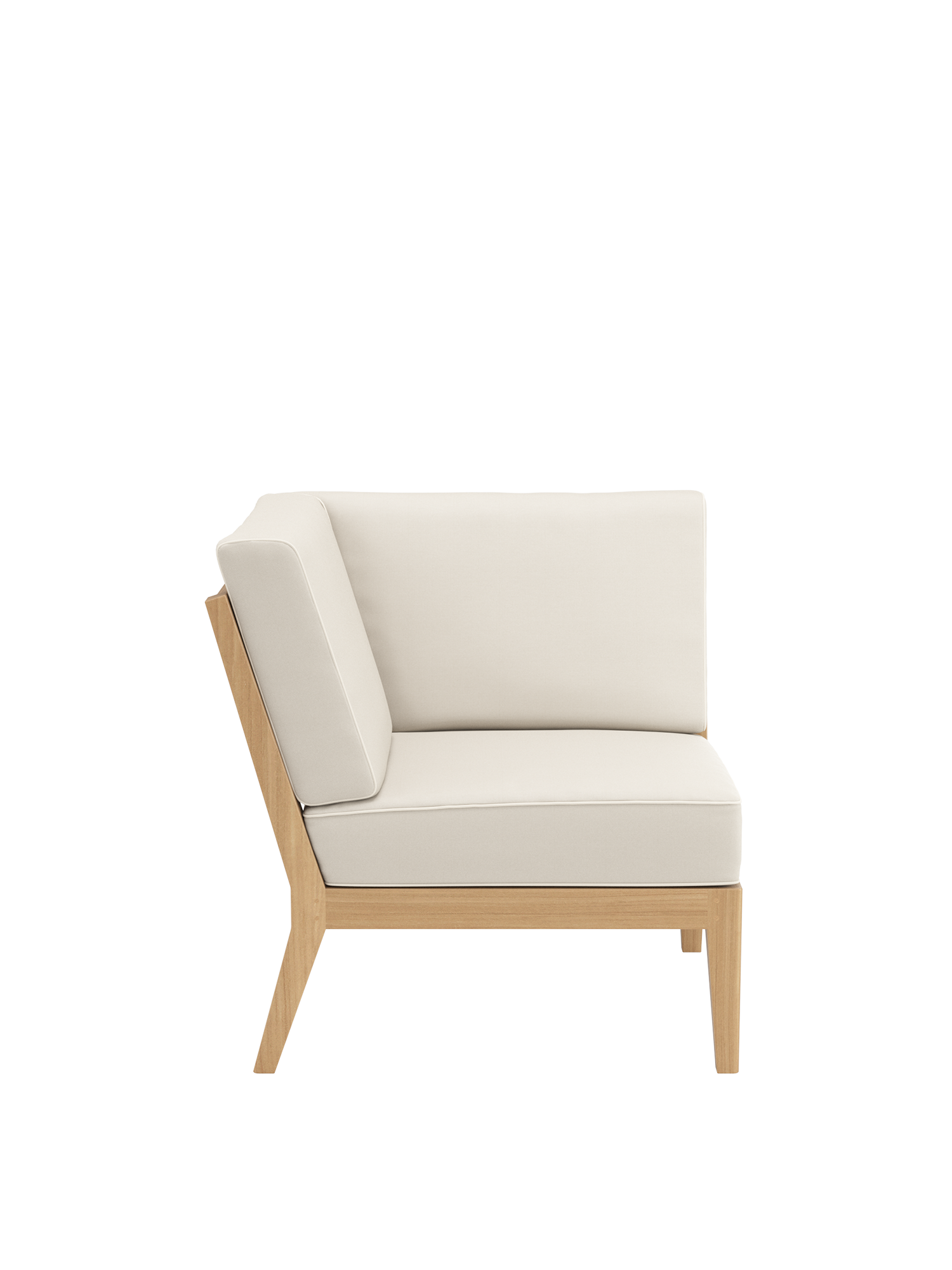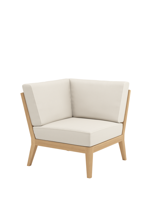 At the side of the pool or edge of the terrace, on a city balcony or in the middle of the garden: the elements of the Valencia lounge furniture create an oasis of tranquillity in every airy location of adequate size. Extra wide and especially deep, chaise longues, middle elements and corner modules made of teak with angled legs, and transversely aligned seat and backrest slats, offer plenty of space for relaxing. Thick upholstery with welted seams and feather cushions in fresh colours set summery accents.