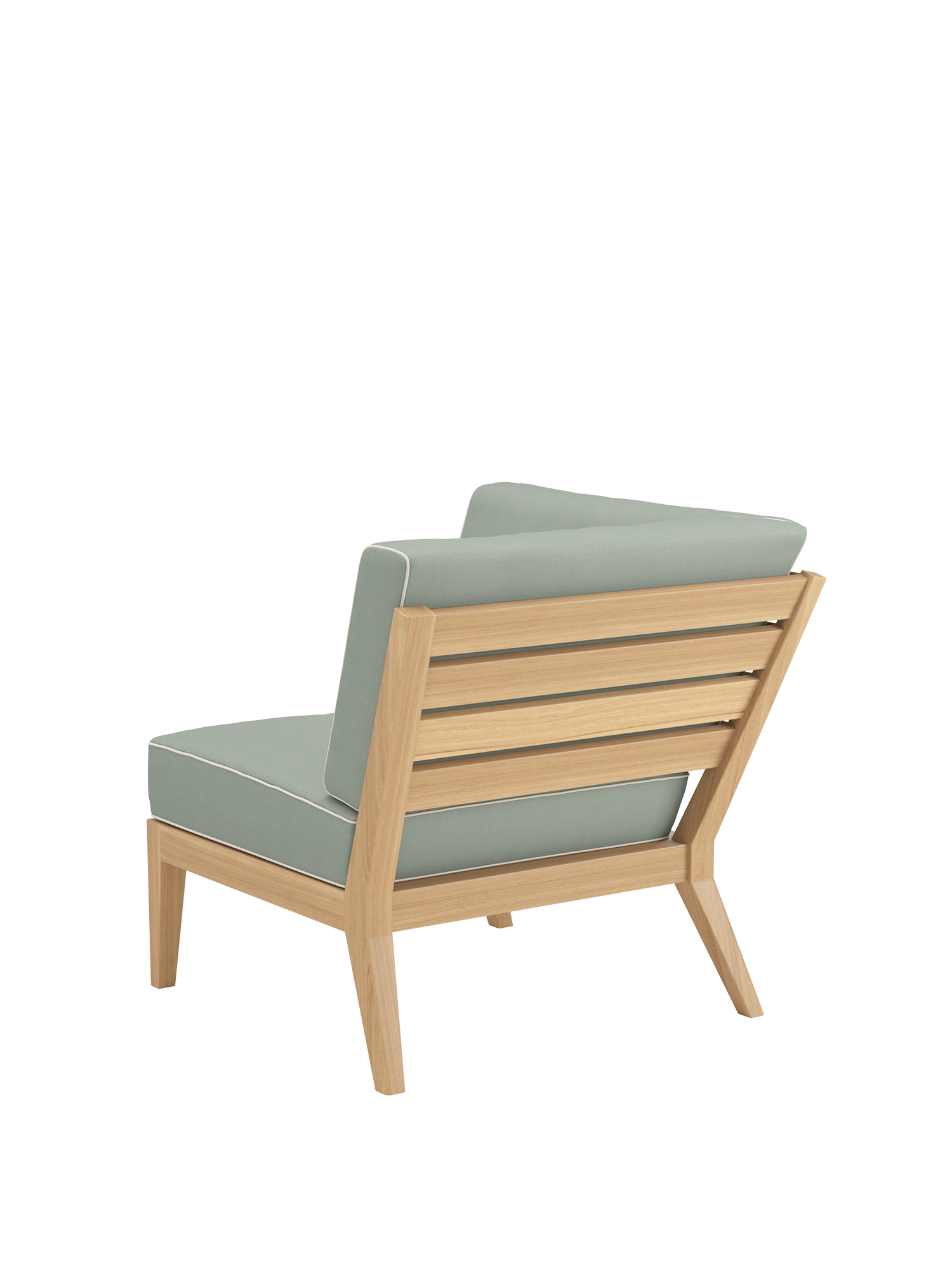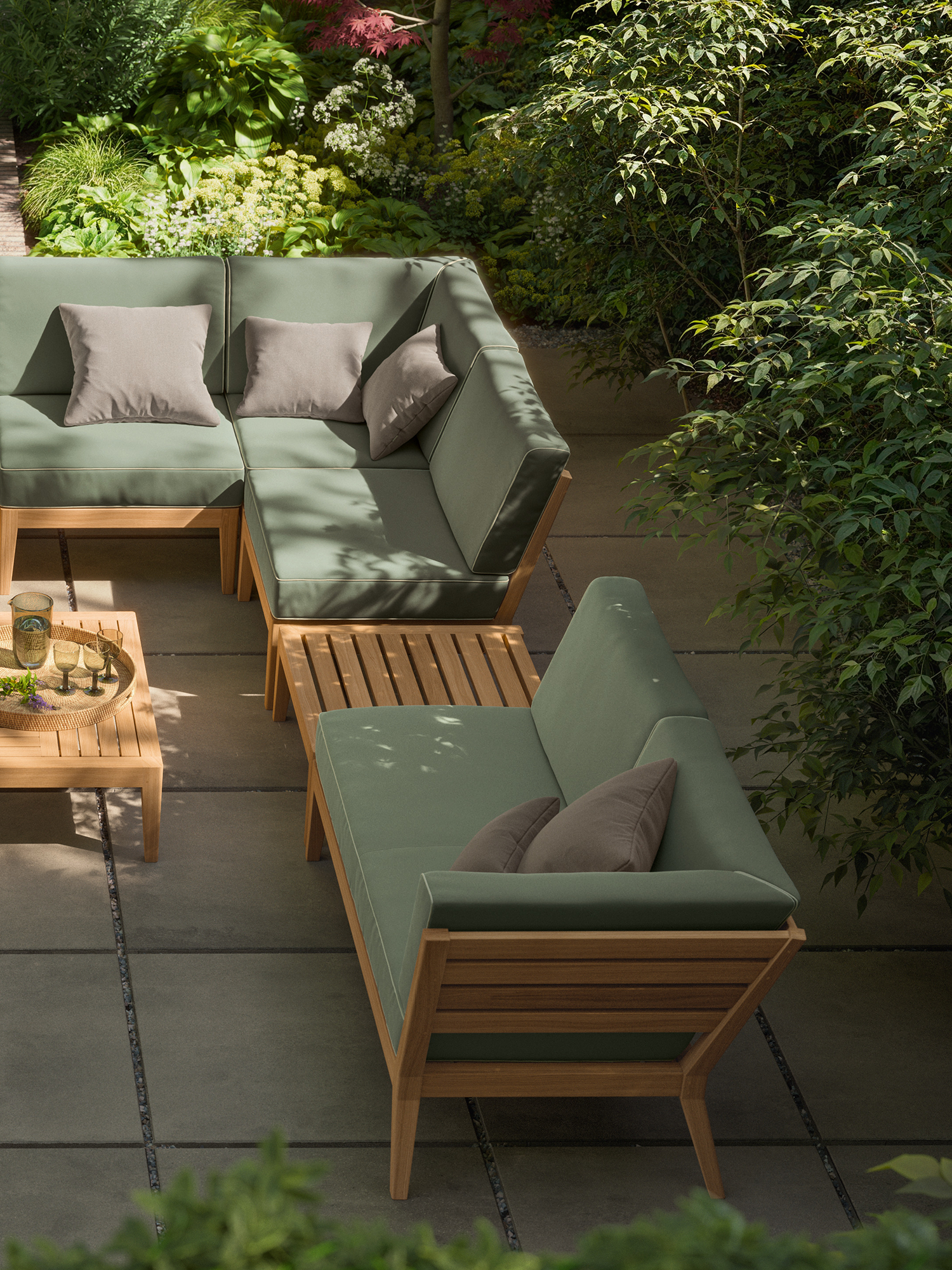 At the side of the pool or edge of the terrace, on a city balcony or in the middle of the garden: the elements of the Valencia lounge furniture create an oasis of tranquillity in every airy location of adequate size. Extra wide and especially deep, chaise longues, middle elements and corner modules made of teak with angled legs, and transversely aligned seat and backrest slats, offer plenty of space for relaxing. Thick upholstery with welted seams and feather cushions in fresh colours set summery accents.